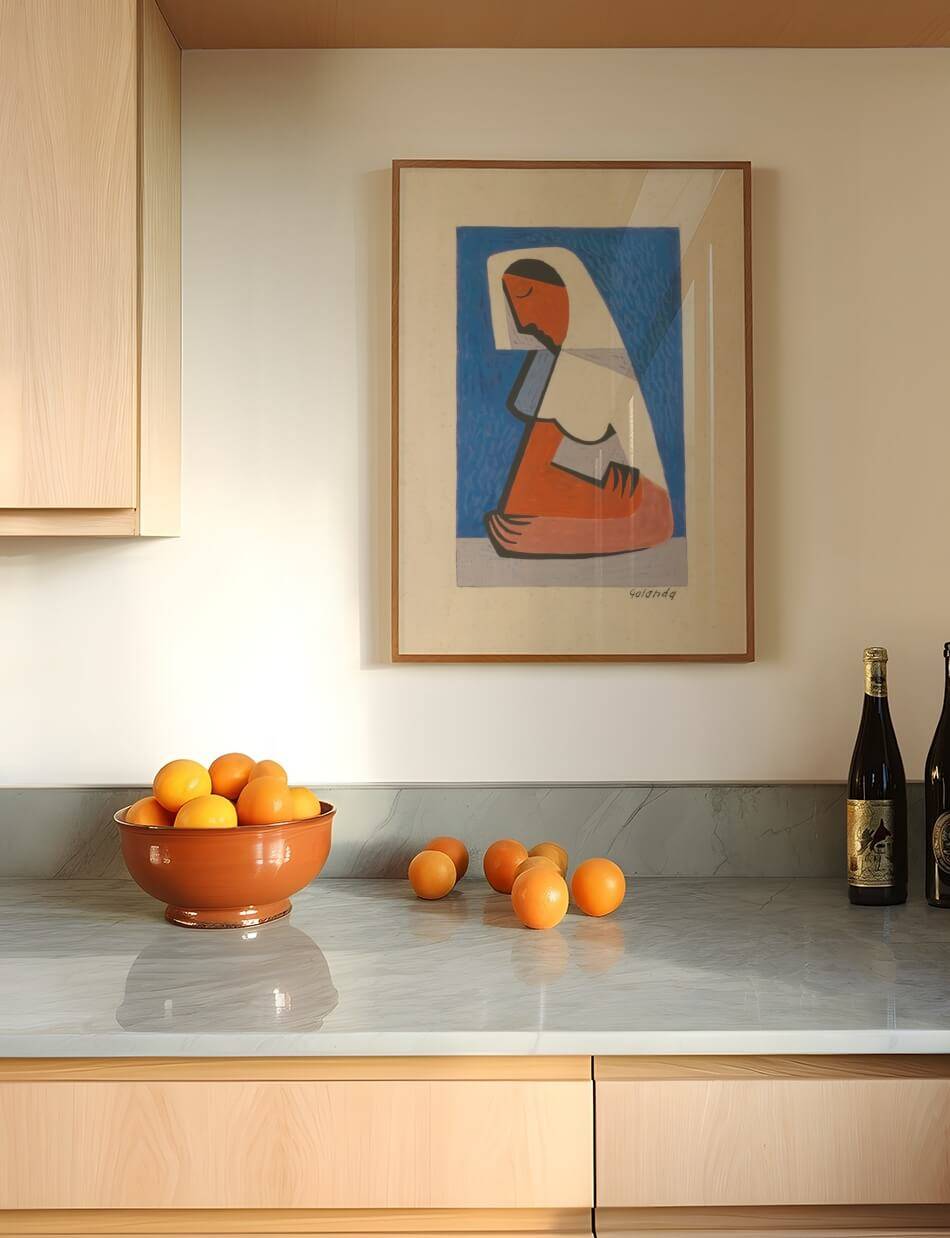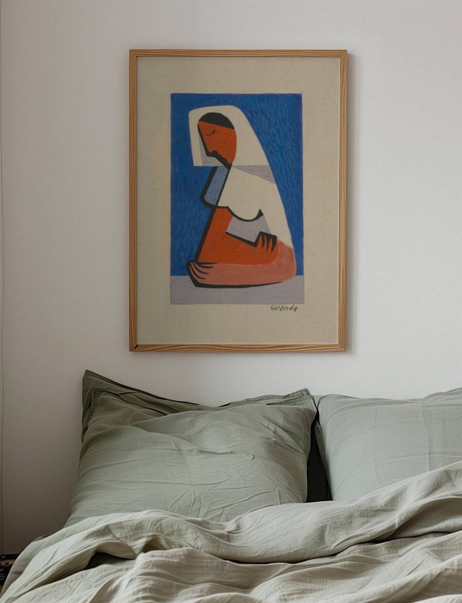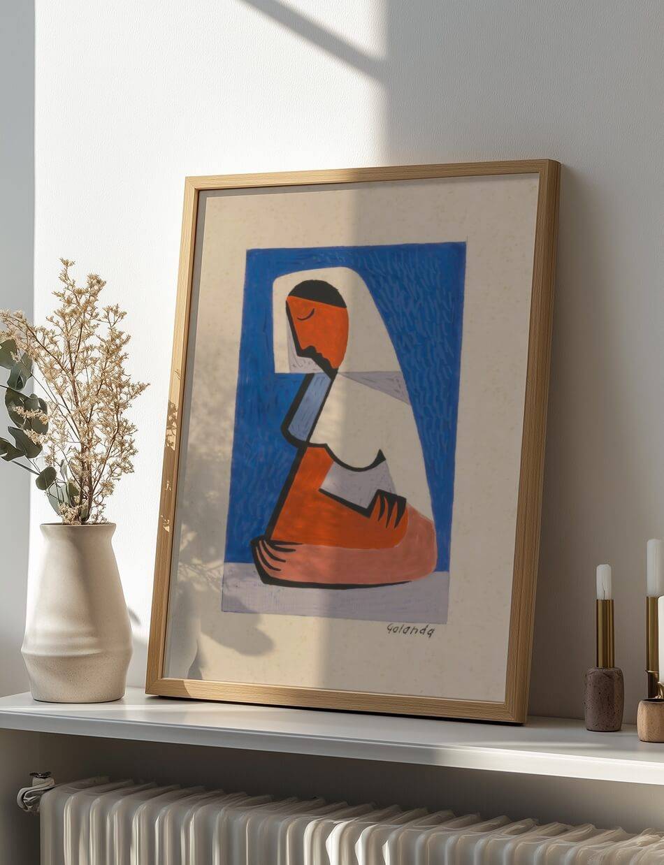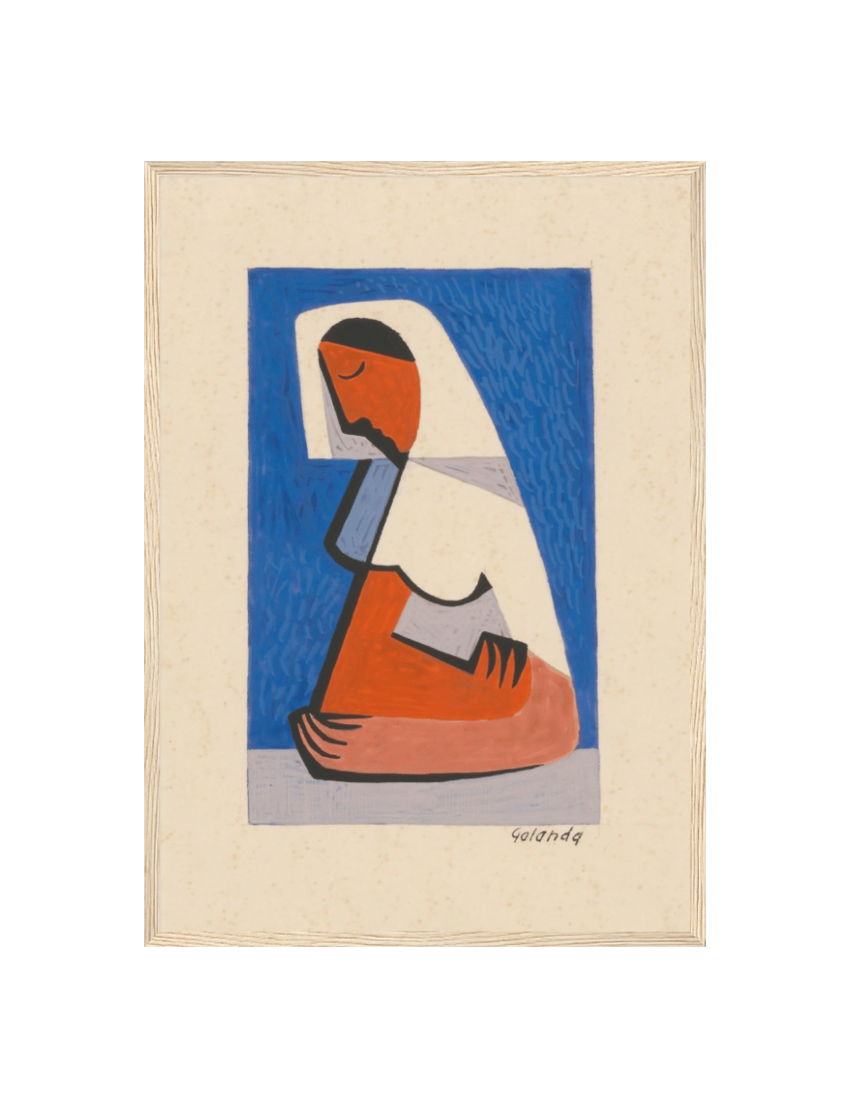 Mikuláš Galandas værk, “A Girl At A Table,” fanger øjeblikket af ro og eftertænksomhed gennem en stiliseret og kubistisk repræsentation. Den unge pige er vist i en simpel, men kraftfuld komposition, hvor de klare farver og geometriske former skaber en følelse af indre fred. Det blå baggrundsfelt står i kontrast til de varme jordtoner i pigens figur, hvilket fremhæver hendes stilhed og fokuserede nærvær. Værket udstråler en tidløs kvalitet, der inviterer til at reflektere over enkelhedens skønhed og de små øjeblikkes betydning.