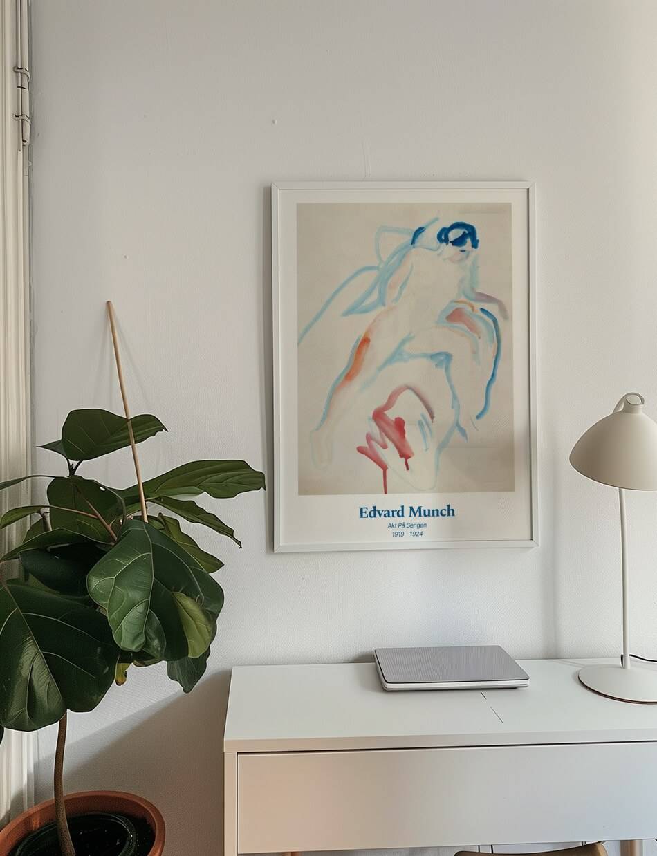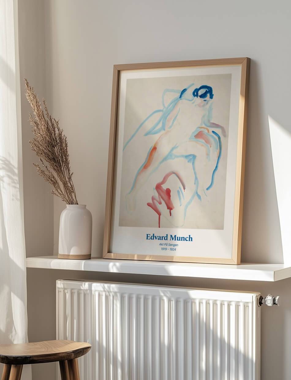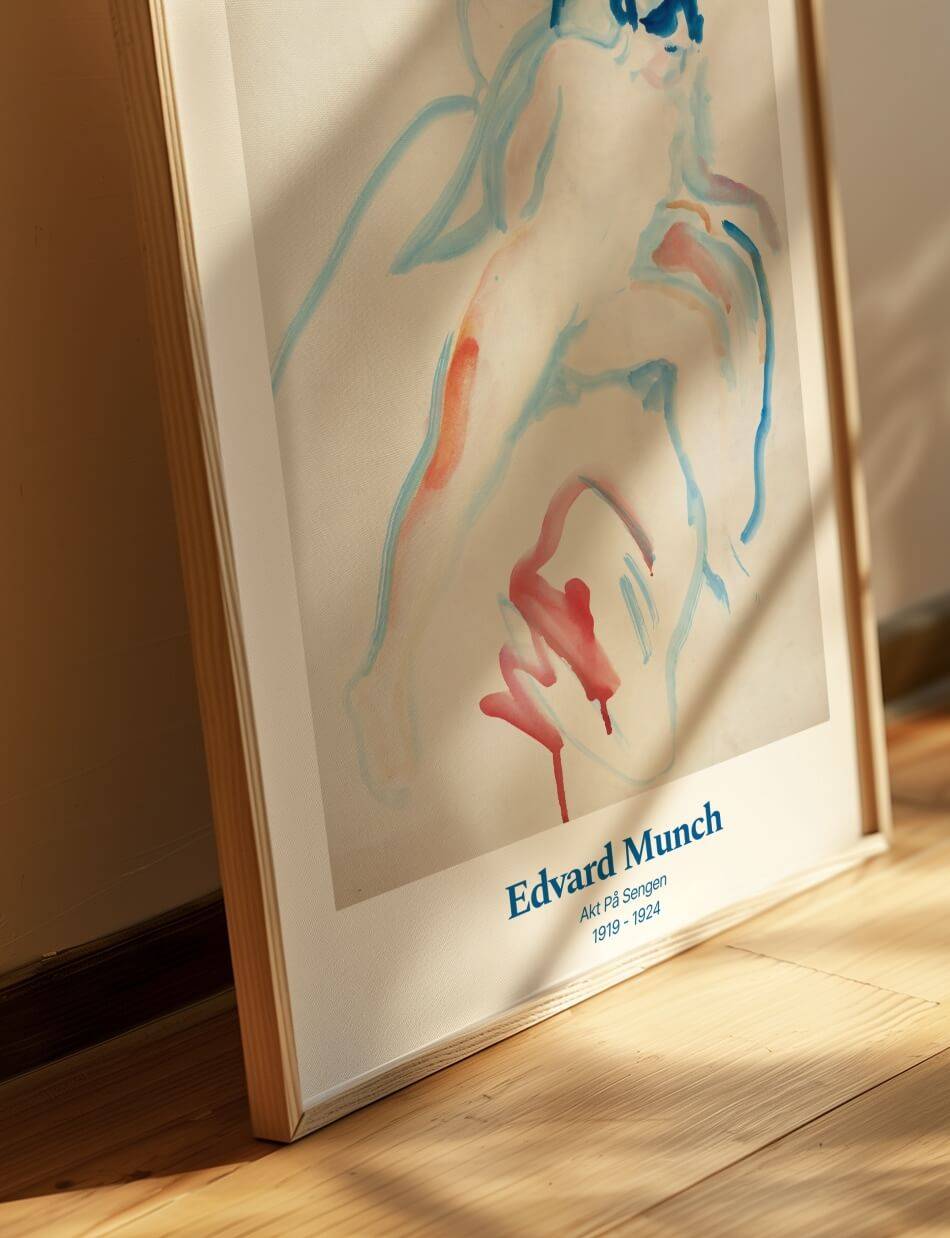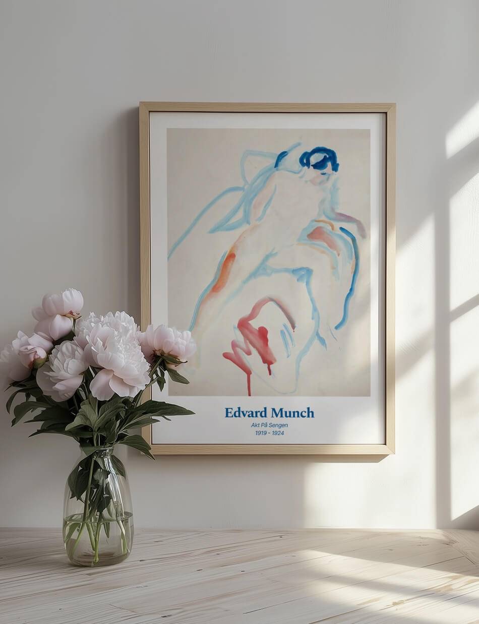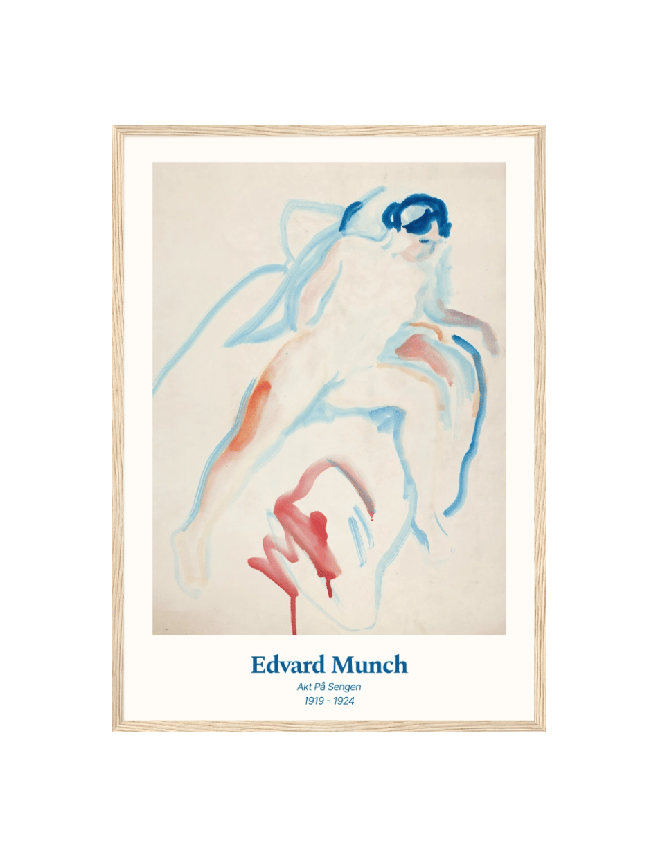 Akt på Sengen’ af Edvard Munch er en følsom og intim skildring af en nøgenfigur på en seng. Maleriet bruger bløde, flydende linjer og en afdæmpet farvepalet til at fremhæve kroppens naturlige former og skønhed. De blå og røde nuancer giver værket en dyb følelsesmæssig resonans, som afspejler Munchs karakteristiske stil og hans evne til at indfange komplekse følelser med enkle midler. Denne kunstværk inviterer til at reflektere over menneskelig sårbarhed og intimitet.