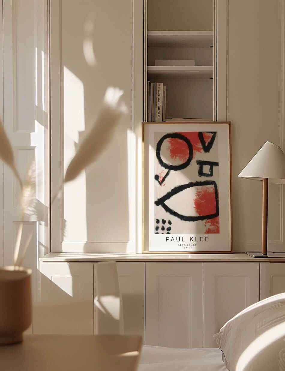 Paul Klees “Alea Jacta” fra 1940 er en slående blanding af sorte, kraftige linjer og varme røde nuancer, der tilsammen skaber en stærk visuel kontrast. Med sine enkle, men udtryksfulde former formår Klee at formidle en dyb symbolik og dramatik. De geometriske elementer og den stærke farvepalet inviterer til at reflektere over værkets betydning og symbolik. Et perfekt eksempel på Klees evne til at skabe kraftfulde visuelle udtryk gennem enkle elementer.