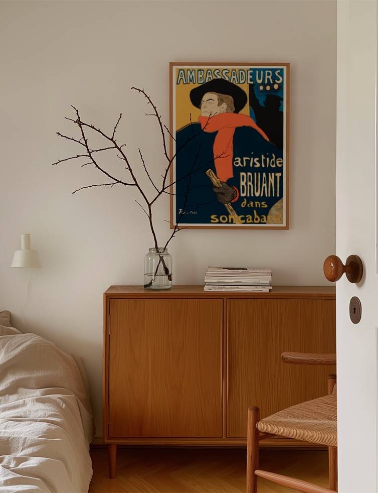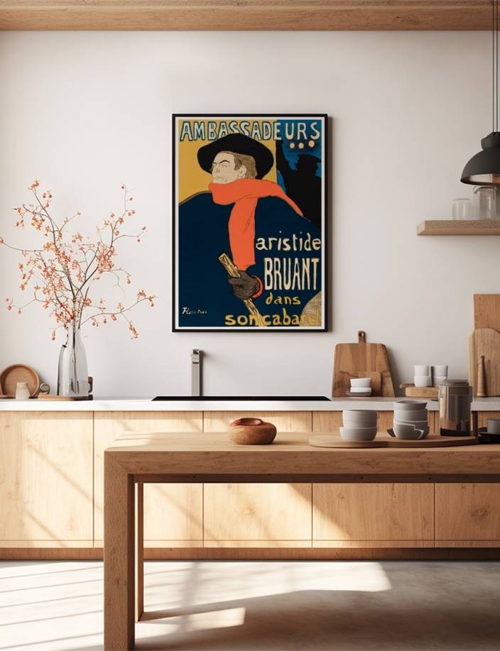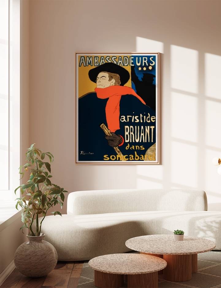 Oplev den pulserende cabaret scene gennem Henri de Toulouse-Lautrecs øjne. Denne grafiske plakat fremviser den karismatiske Aristide Bruant, klædt i sit signatur røde tørklæde og brede hat, der står som en bastion af Montmartres kulturelle liv. Med en baggrund der deler sig mellem den varme gule caféstemning og den kølige blå nattehimmel, indfanger dette stykke den unikke atmosfære af Paris’ berømte natklubber.