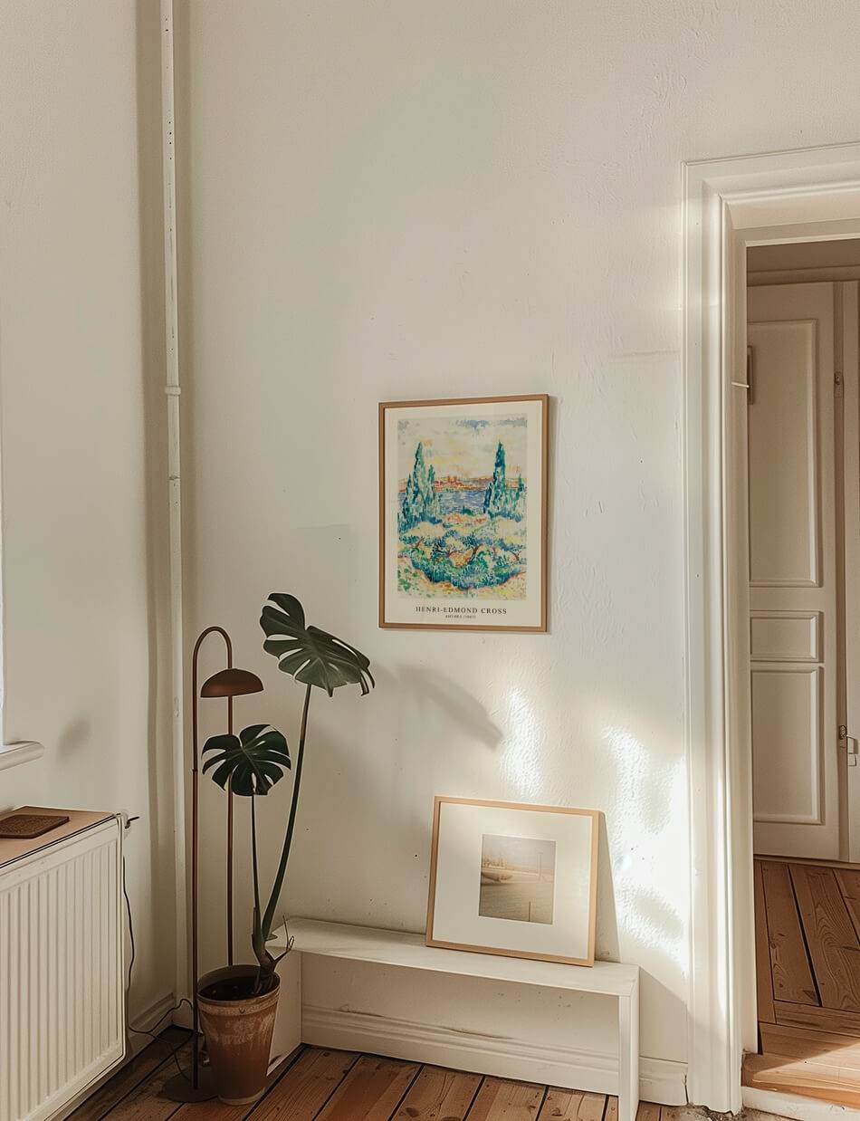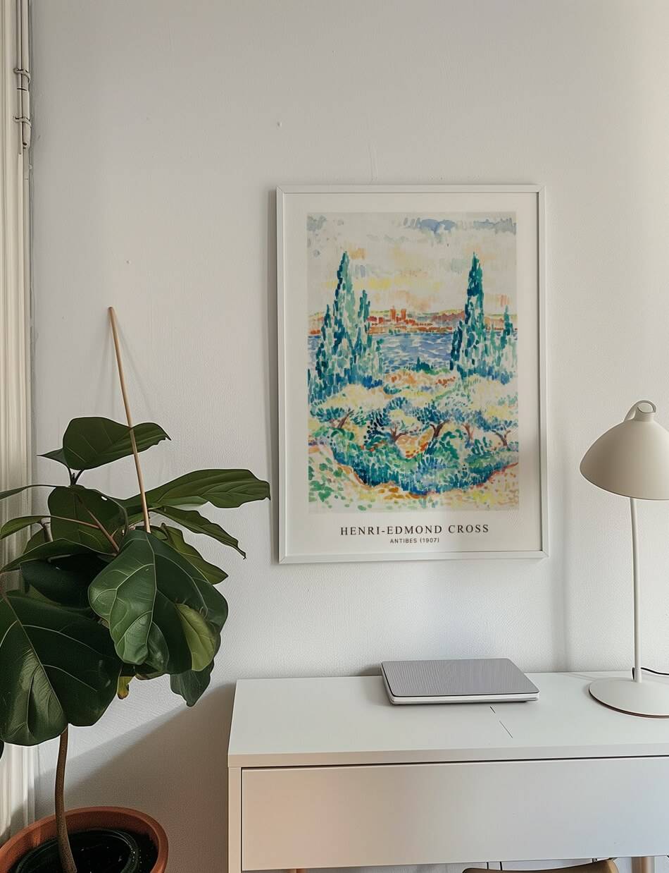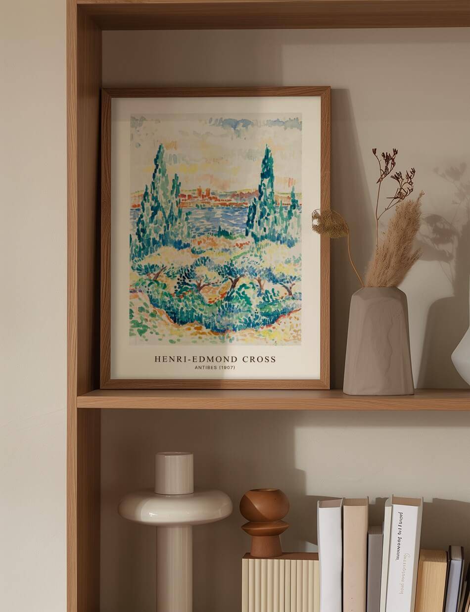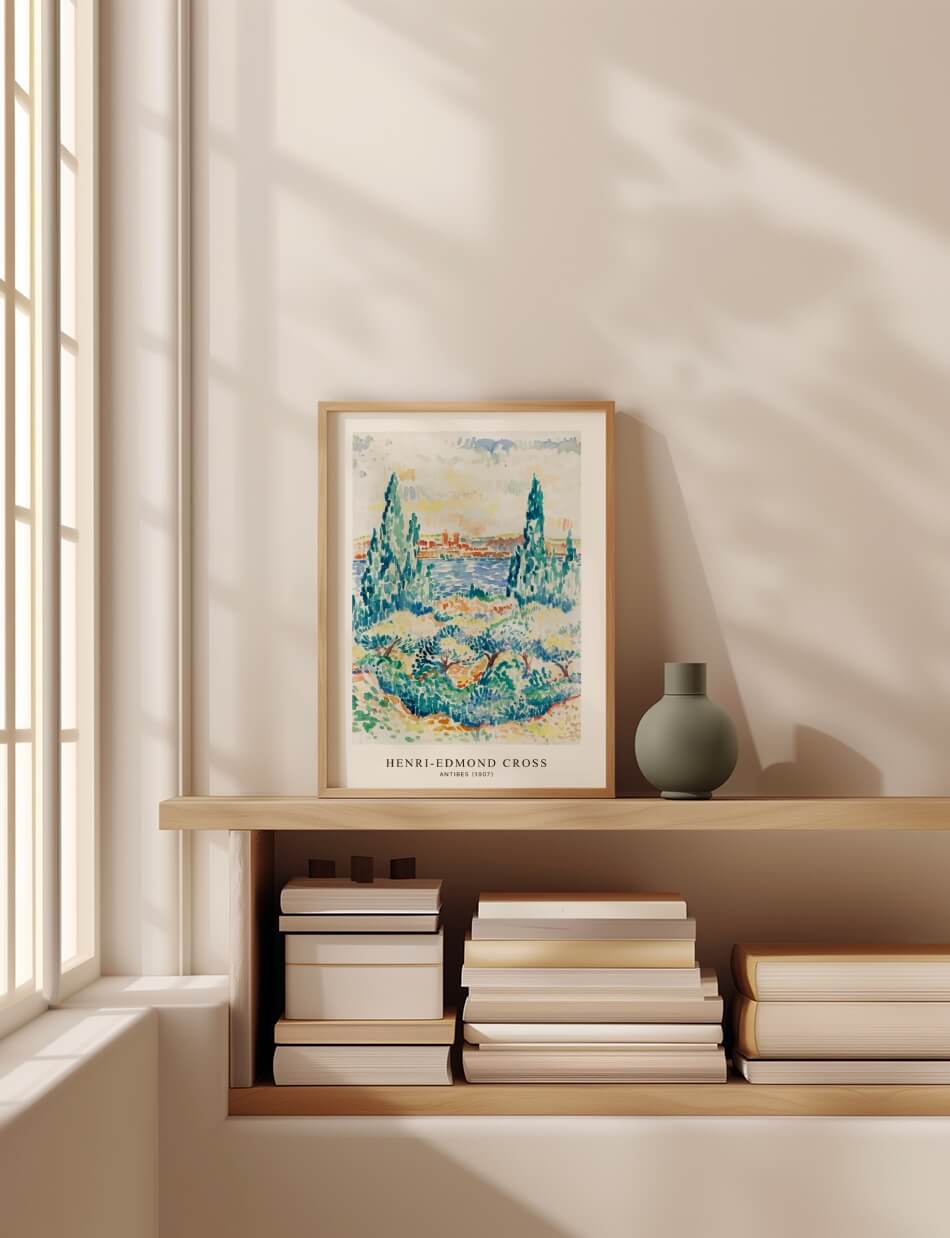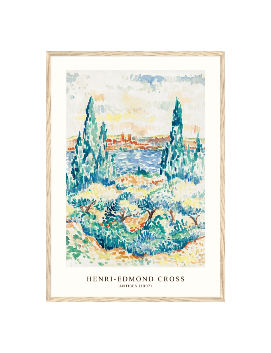 Henri-Edmond Cross’ Antibes (1907) skildrer en malerisk udsigt over den franske kystby Antibes. Med høje, slanke træer i forgrunden og det blå Middelhav i baggrunden, indfanger dette værk den naturlige skønhed og ro i området. Cross’ brug af lysende farver og punktteknik skaber en dynamisk og detaljeret scene, der vækker følelser af fred og skønhed. Ideel for dem, der ønsker at bringe en bid af Middelhavets charme og farver ind i deres hjem.