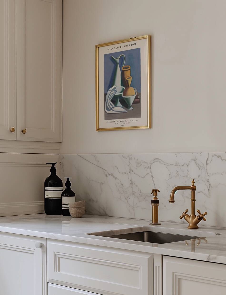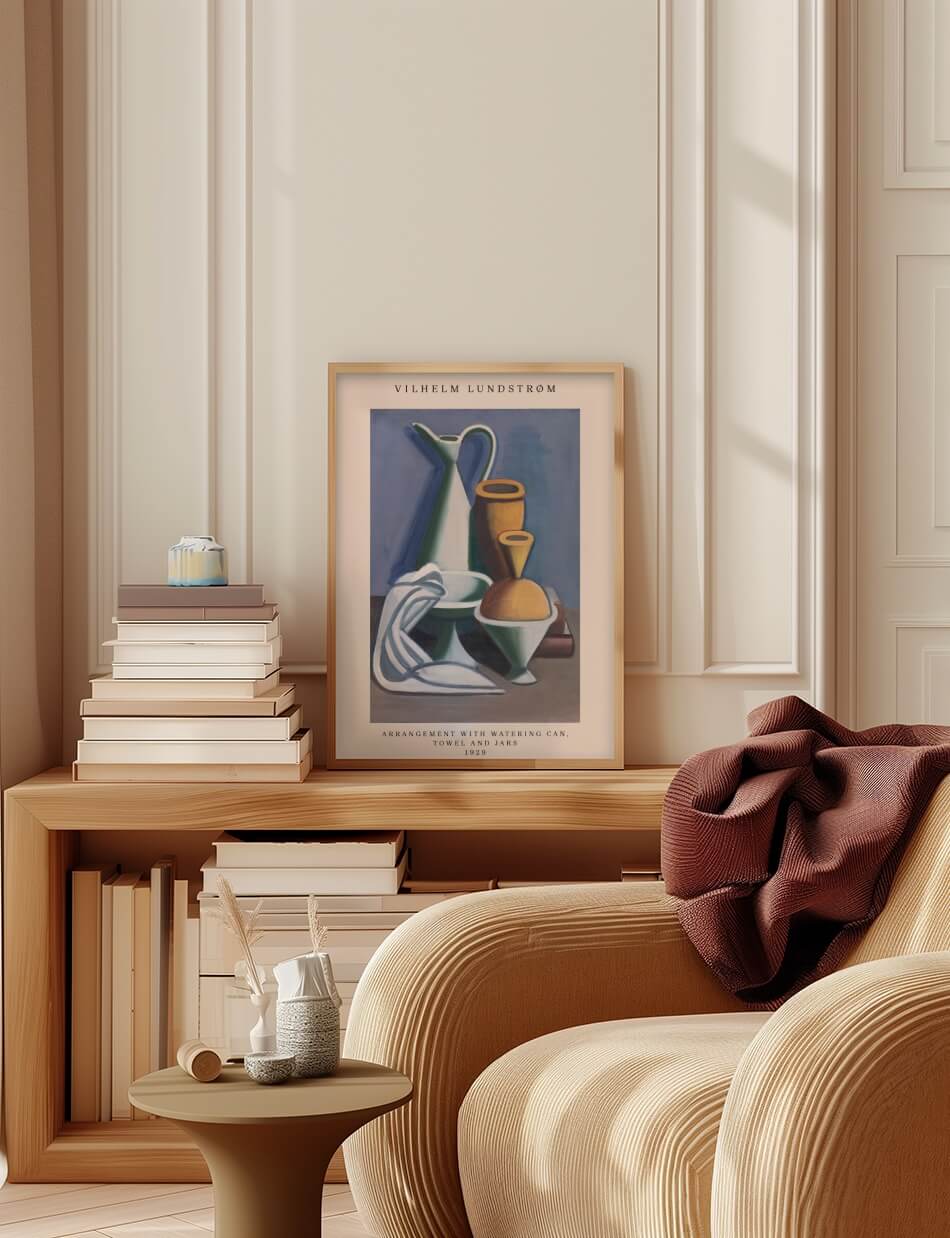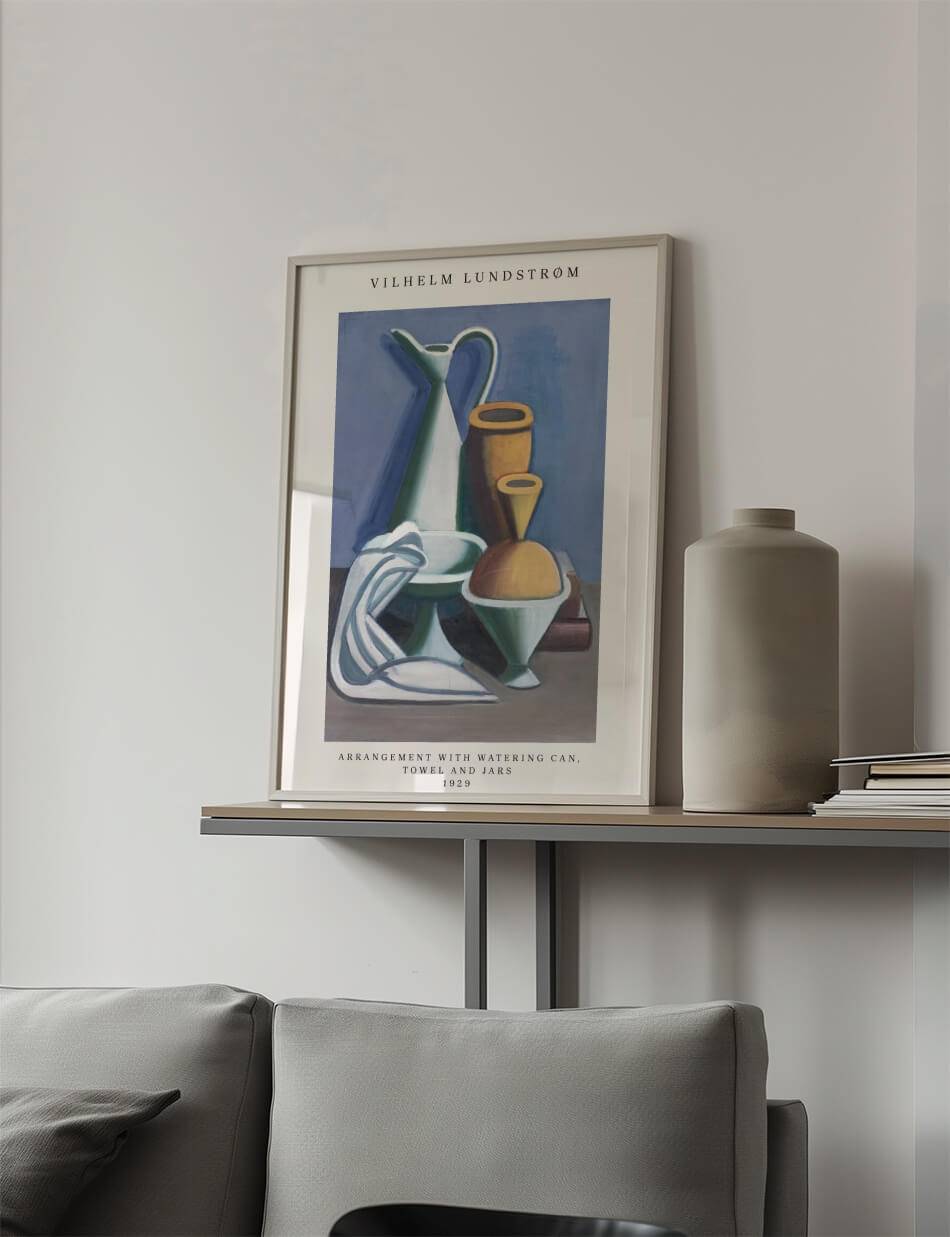 Vilhelm Lundstrøms “Arrangement with Watering Can, Towel and Jars” (1929) fanger den stille skønhed i hverdagsobjekter. Med enkle linjer og subtile farver skaber Lundstrøm en harmonisk komposition, der fremhæver formernes elegance og objekternes indbyrdes forhold. Dette værk inviterer dig til at værdsætte den stille skønhed i det ordinære og til at se poesi i det dagligdags.