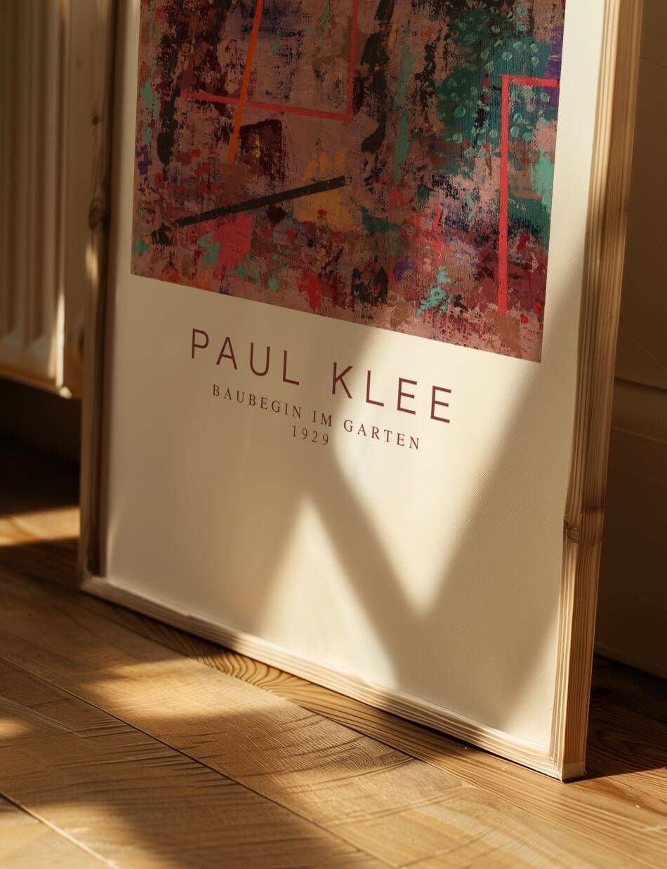 Baubegin im Garten af Paul Klee er en dynamisk og drømmende fortolkning af naturens og menneskets samspil. Med sin unikke kombination af farver og geometriske linjer skaber Klee en næsten musikalsk rytme, der inviterer beskueren til at udforske hvert hjørne af værket. De røde og sorte linjer skærer gennem de teksturerede overflader, som er fyldt med livlige toner af grønt, violet og okker, og skaber en subtil balance mellem kaos og orden.