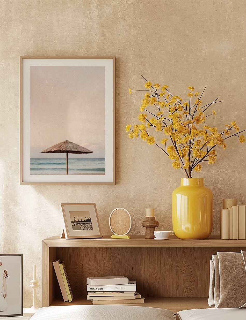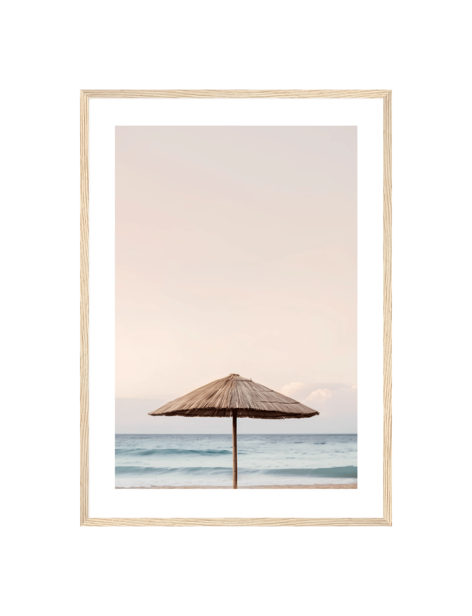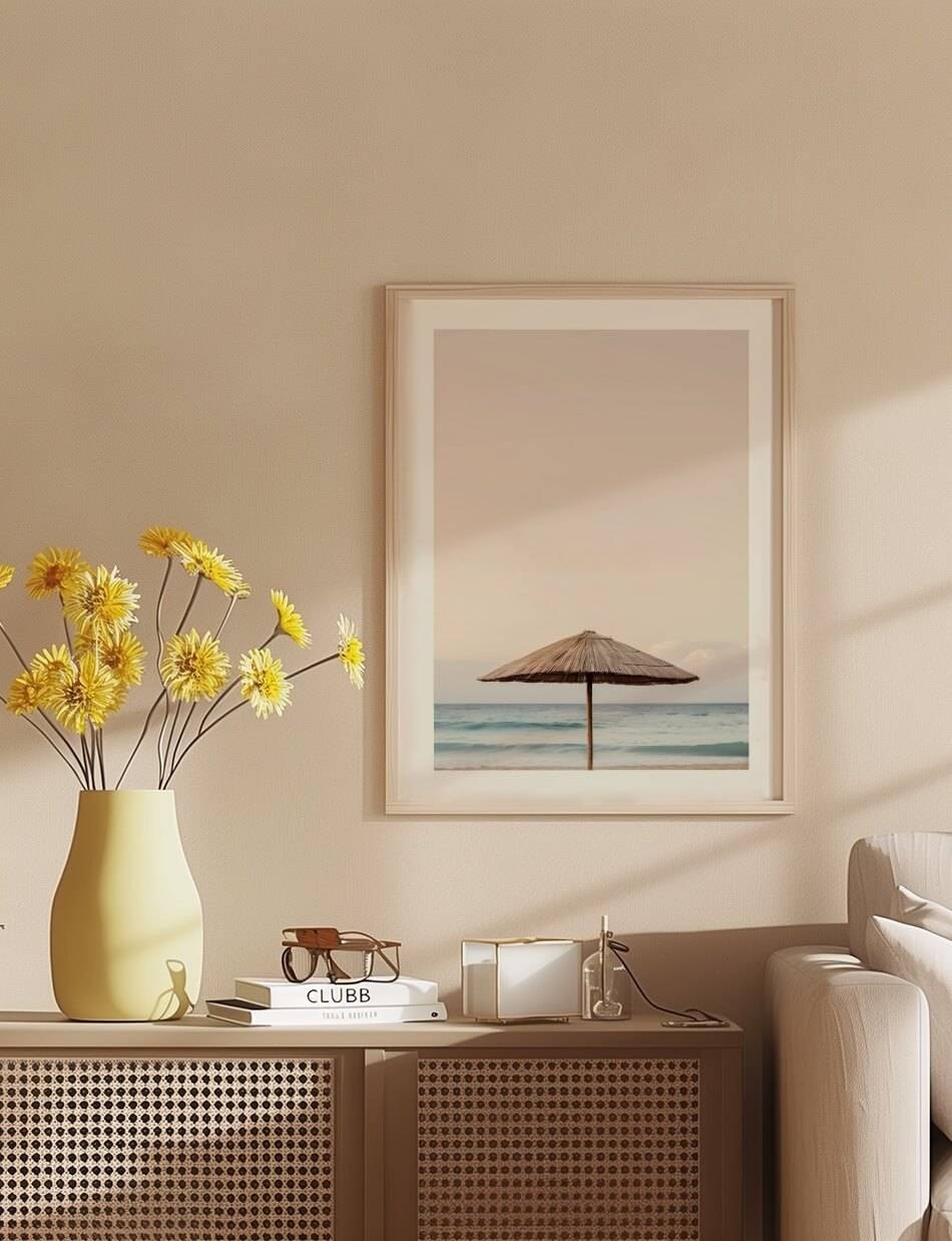 Fang den enkle skønhed af en ensom parasol ved stranden i dette minimalistiske billede. Den stråtækte parasol står mod en rolig baggrund af bølgende hav og en pastel farvet himmel, der indbyder til afslapning og fred. Perfekt til at tilføje et strejf af strandro til ethvert rum.
