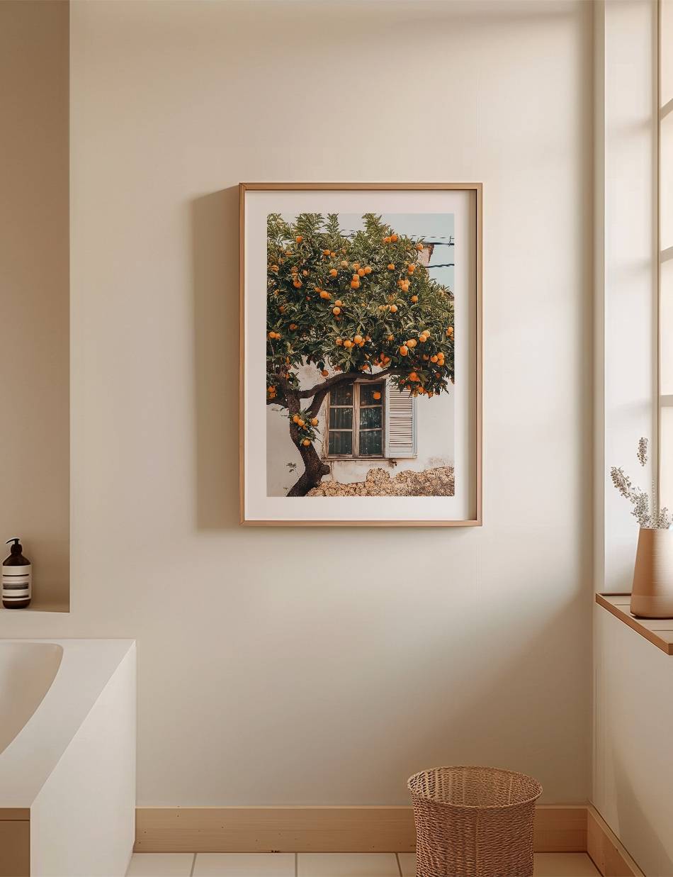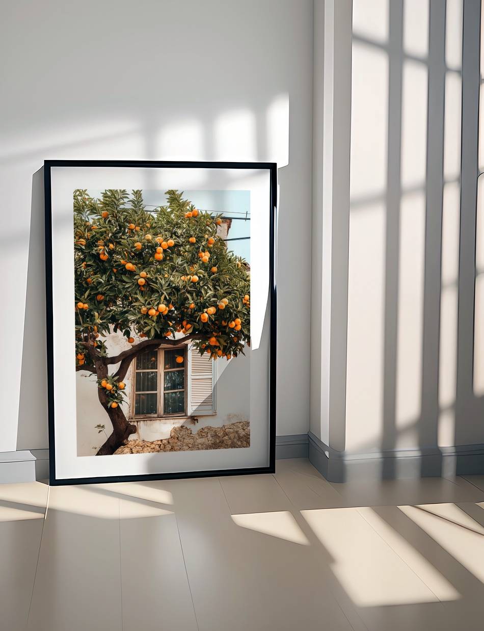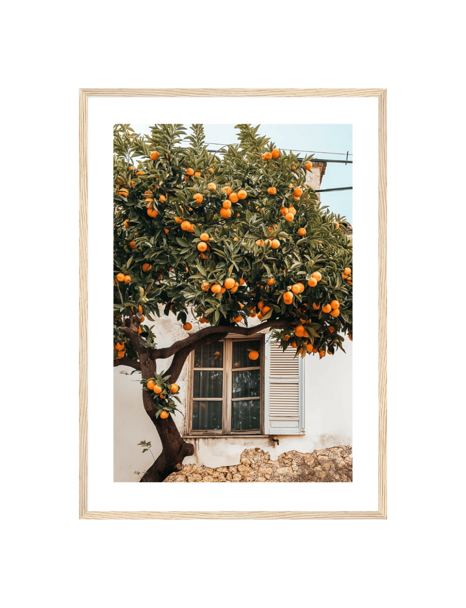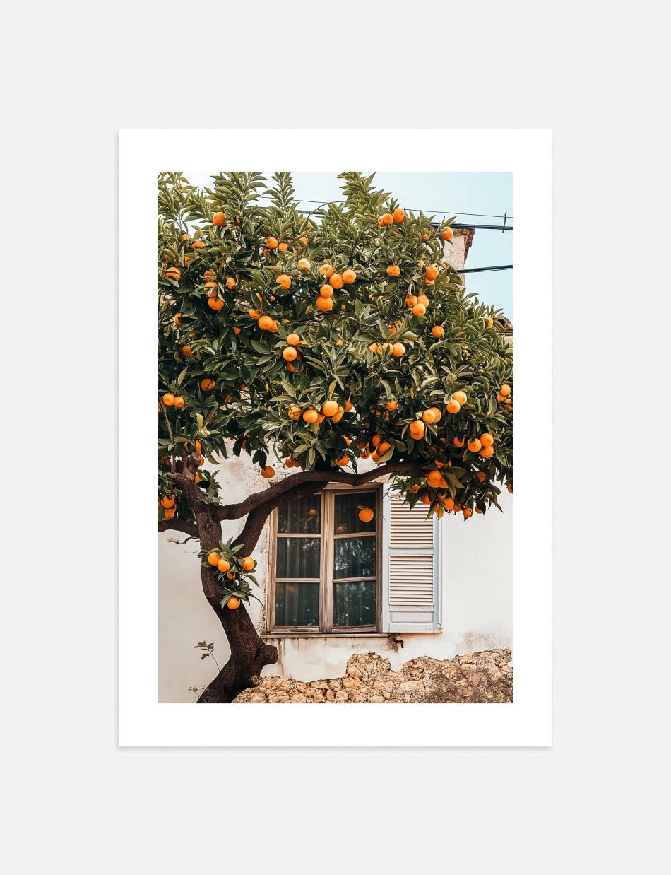 Oplev stemningen af en frodig, solbeskinnet have med denne fotoplakat, der viser et bugnende appelsintræ. Billedet indfanger det charmerende syn af modne appelsiner, der hænger tungt på grene, omrammet af en gammel landsbybygning med klassiske vinduer og skodder. Dette billede bringer varmen og farven fra Middelhavet ind i dit hjem, perfekt for alle, der værdsætter naturlig skønhed og ro.