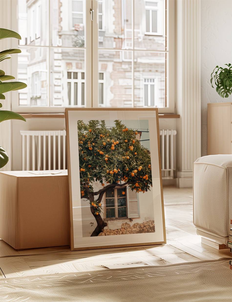 Oplev stemningen af en frodig, solbeskinnet have med denne fotoplakat, der viser et bugnende appelsintræ. Billedet indfanger det charmerende syn af modne appelsiner, der hænger tungt på grene, omrammet af en gammel landsbybygning med klassiske vinduer og skodder. Dette billede bringer varmen og farven fra Middelhavet ind i dit hjem, perfekt for alle, der værdsætter naturlig skønhed og ro.