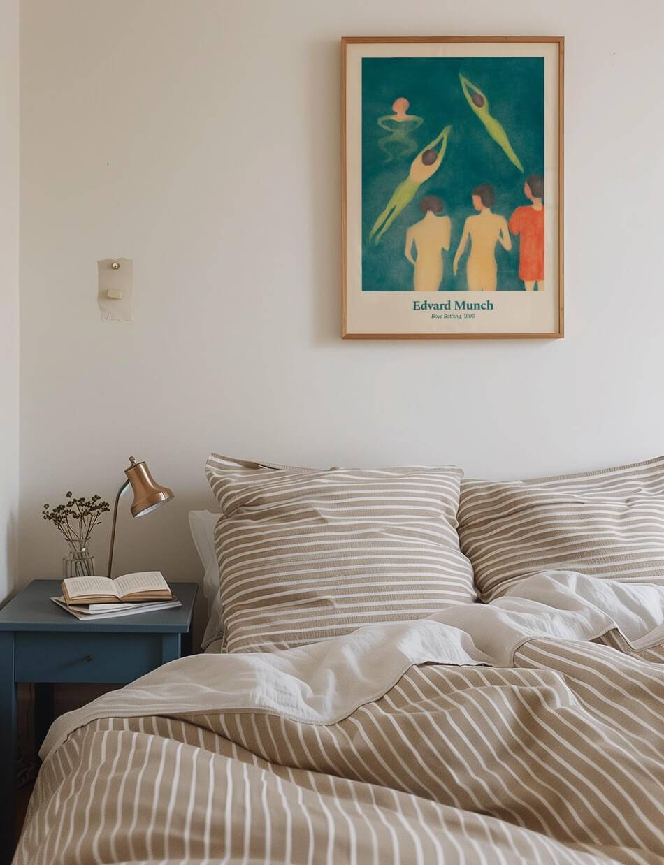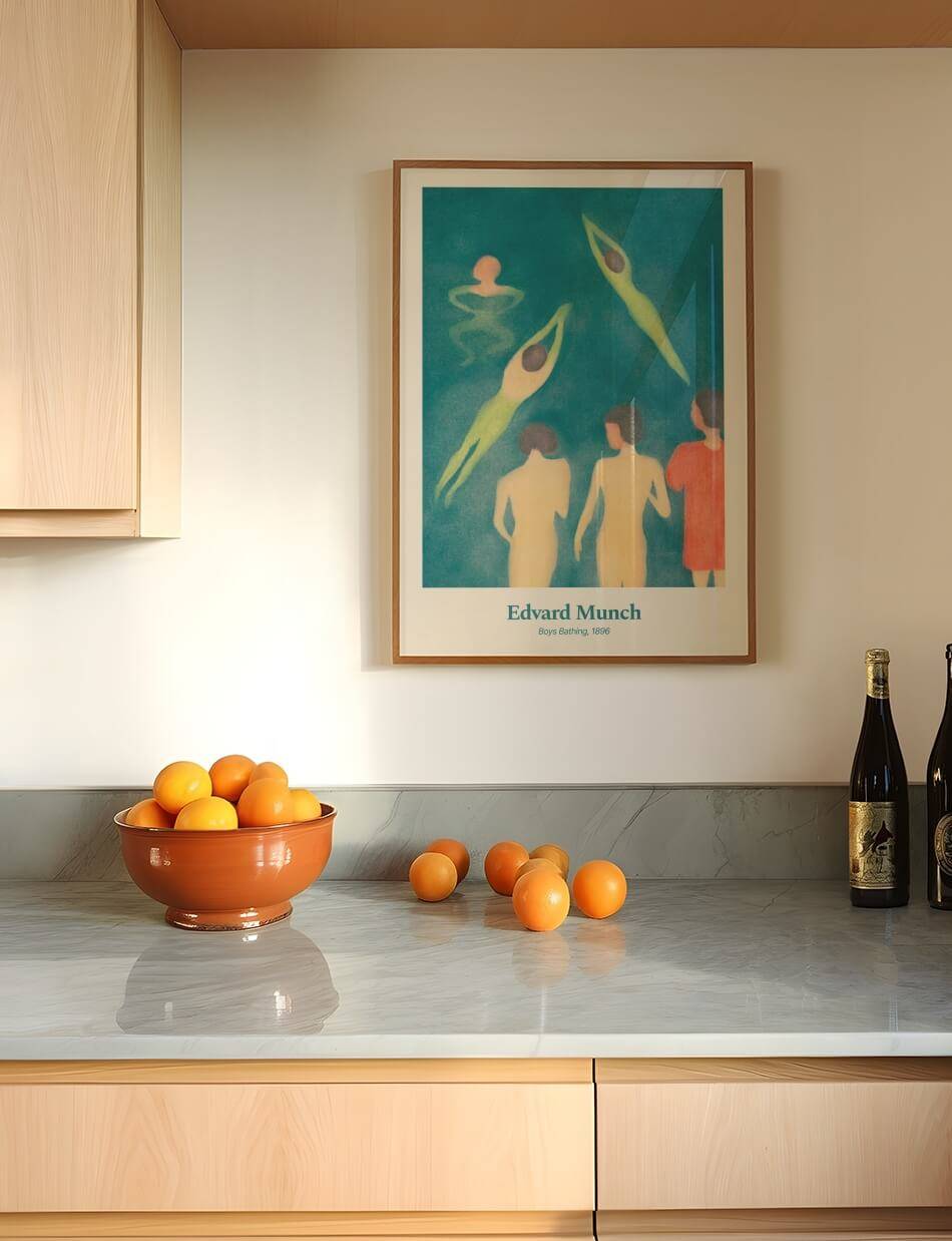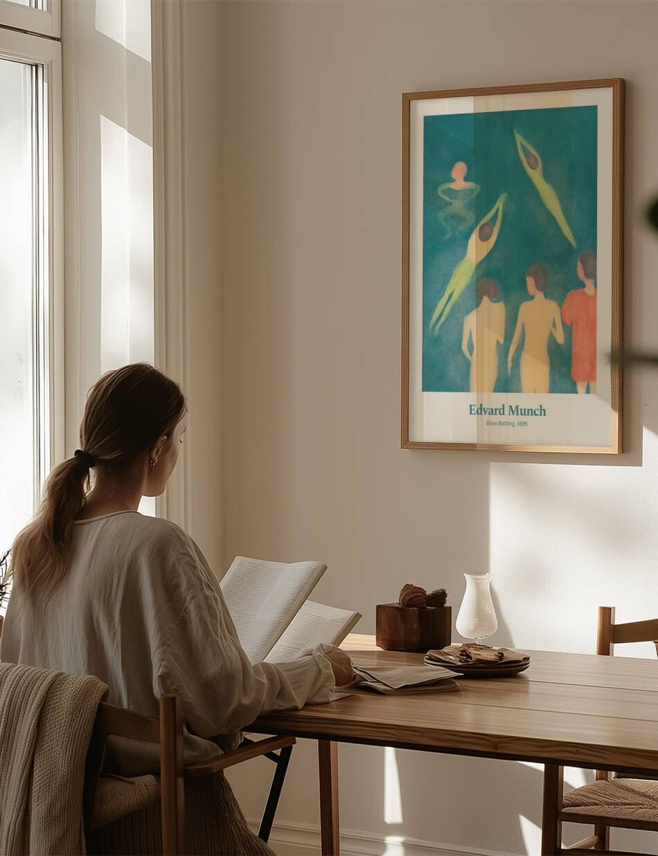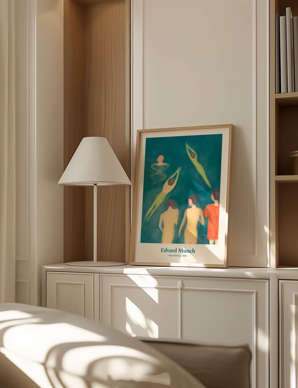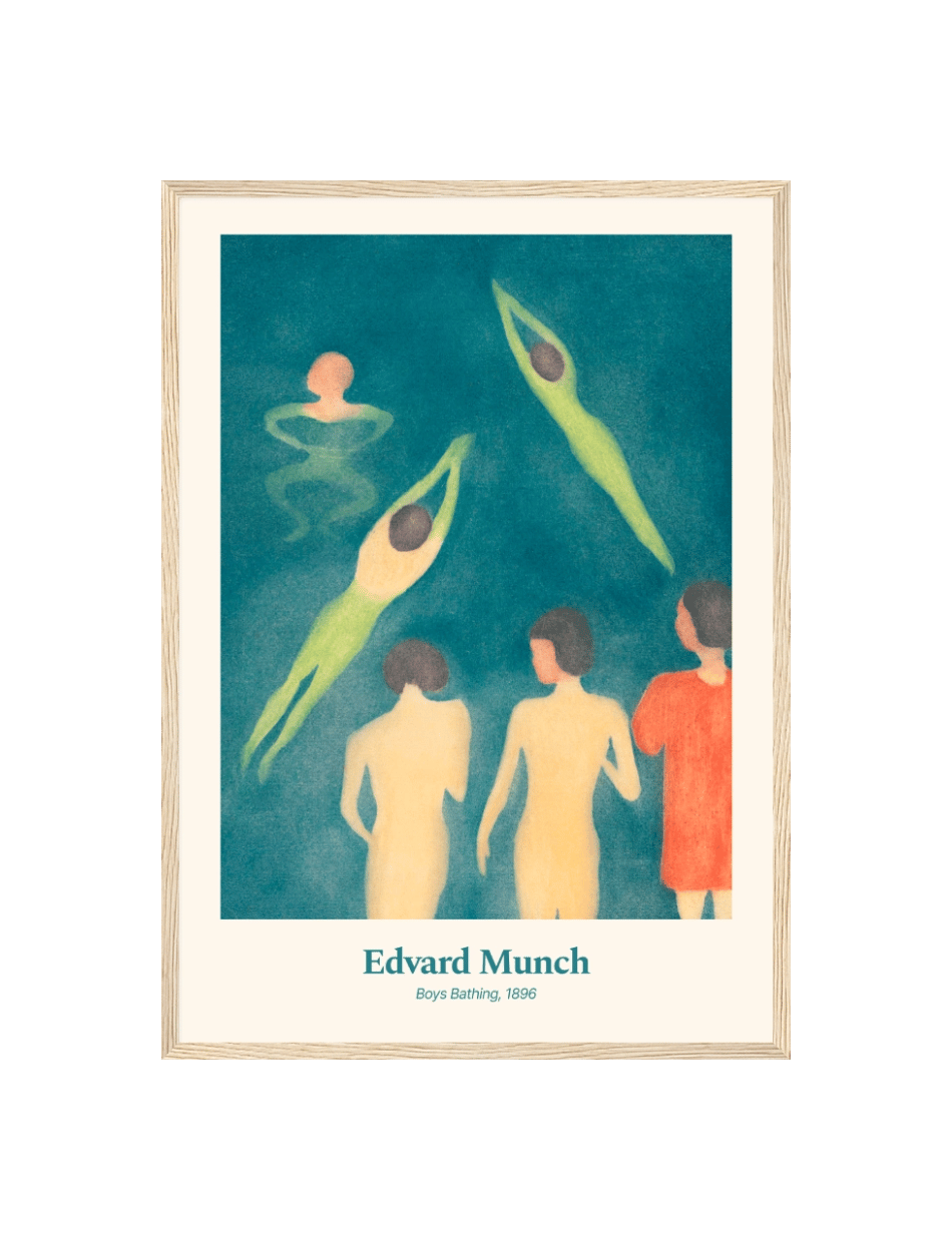 Boys Bathing, skabt af Edvard Munch i 1896, fanger en livlig og uskyldig scene af drenge, der svømmer og leger i vandet. Maleriet bruger bløde farver og flydende linjer til at fremhæve bevægelse og lethed, mens de nyder sommerens frihed. Den grønne og blå palette skaber en beroligende atmosfære, som indfanger essensen af en varm sommerdag. Dette værk fremkalder minder om barndommens glæder og enkelhed.