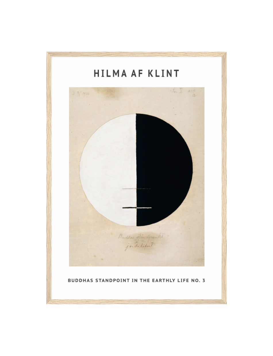 Hilma af Klints ‘Buddhas Standpoint in the Earthly Life No. 3,’ er en abstrakt repræsentation af dualiteten i tilværelsen. Den enkle, men kraftfulde kontrast mellem sort og hvid i den cirkulære form symboliserer den evige balance mellem lys og mørke, mellem ånd og materie. De subtile linjer, der krydser cirklen, tilføjer en dimension af bevægelse og forbindelse, som indfanger det spirituelle og jordiske på en harmonisk måde. Dette værk inviterer til refleksion over dualiteten i menneskets eksistens og den søgen efter indre ro.