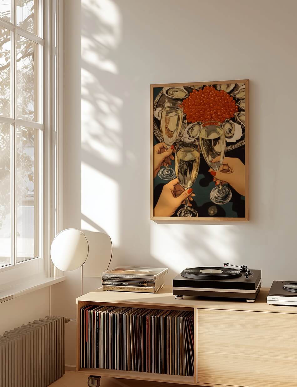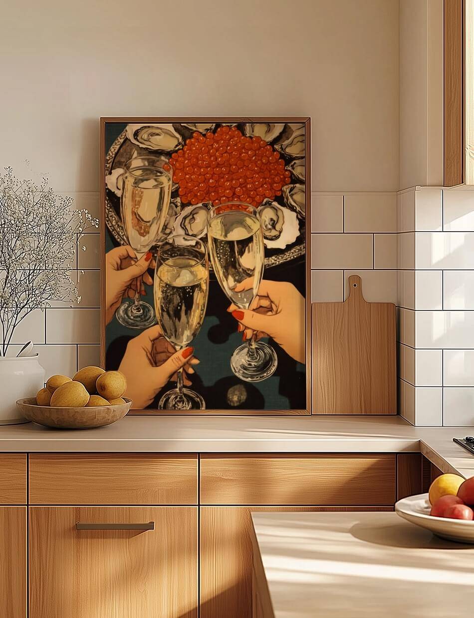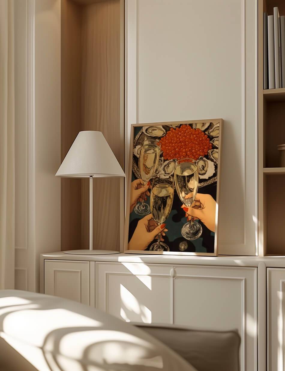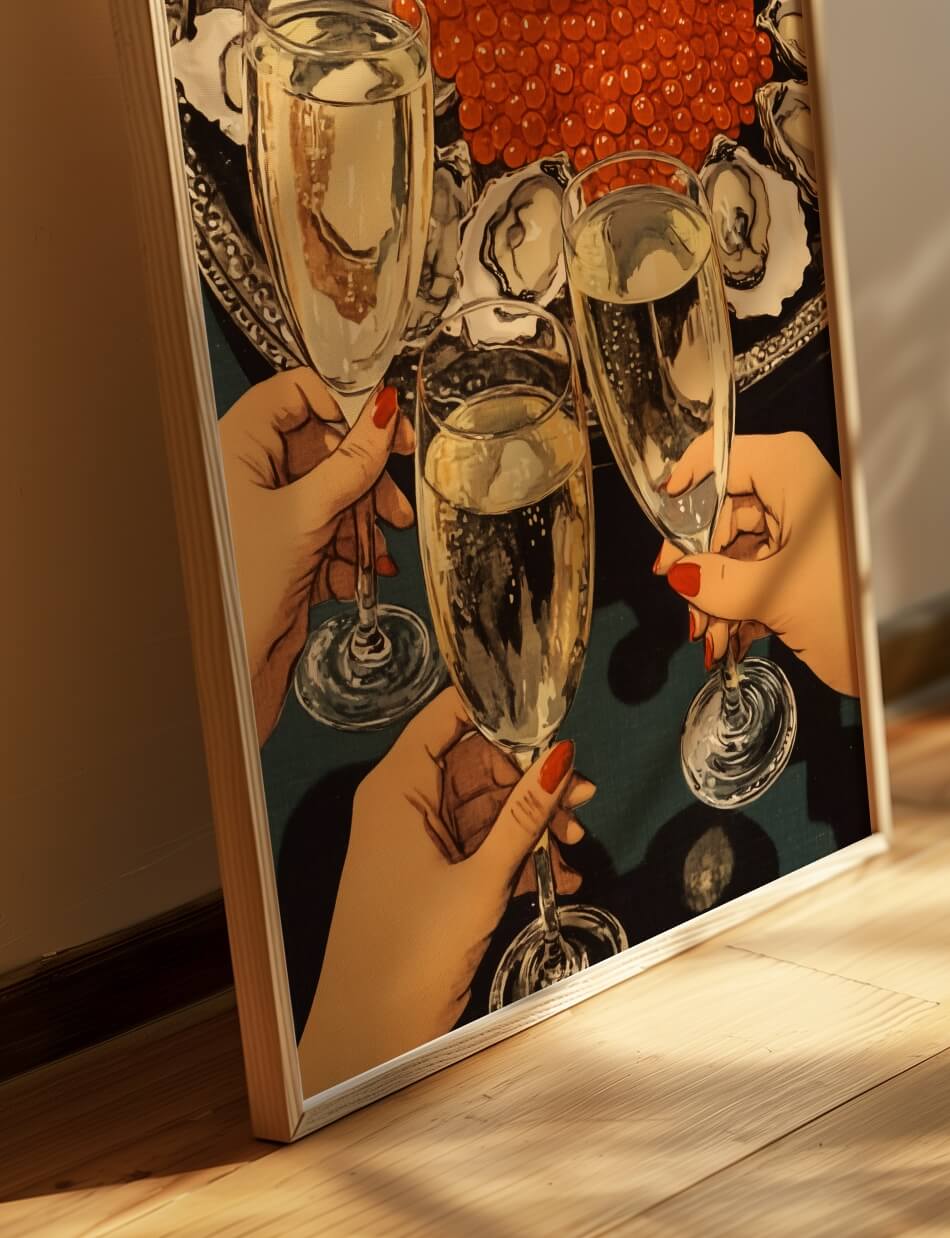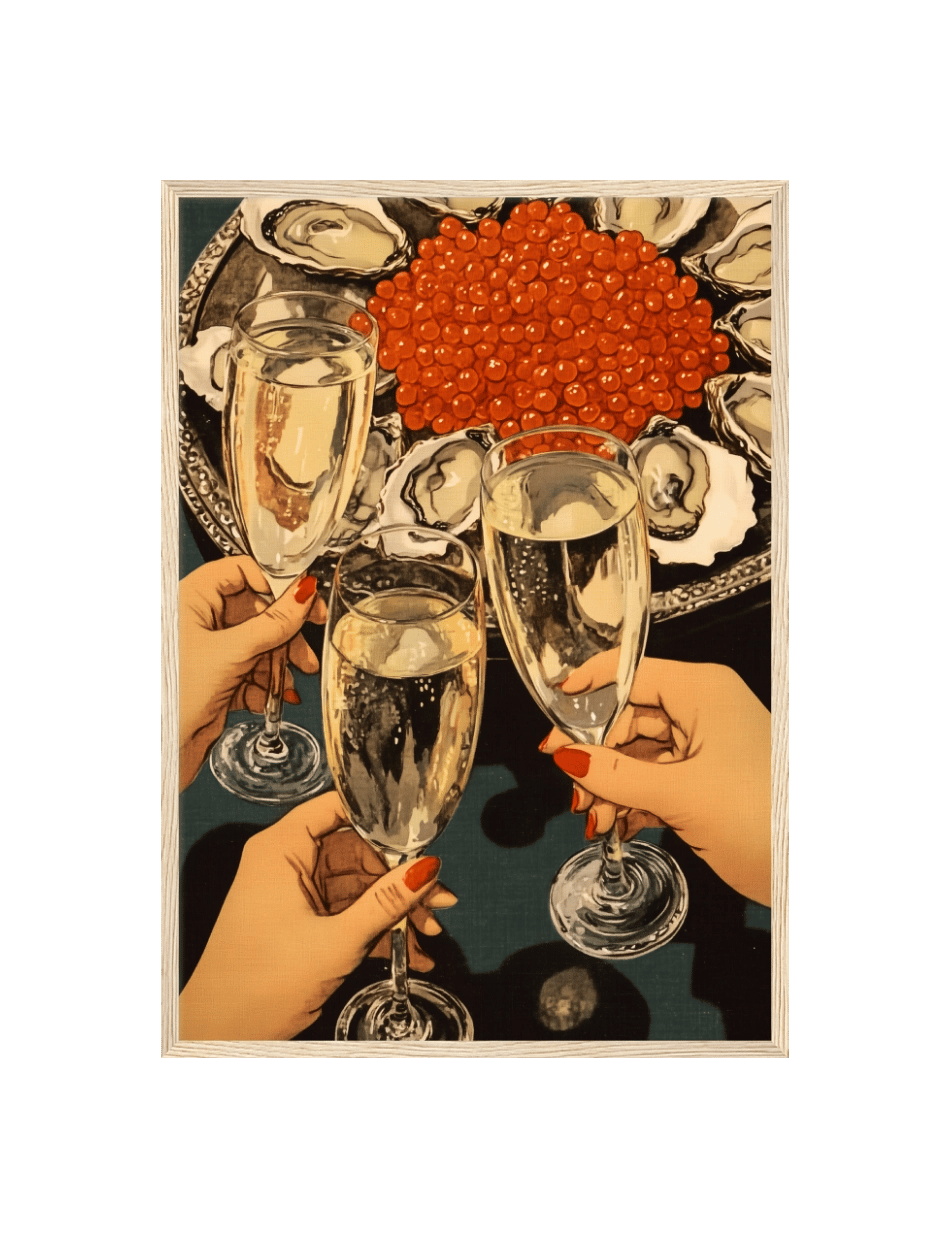Cheers er en hyldest til luksus og fejring, hvor gyldne bobler, friske østers og glitrende rød kaviar skaber en stemning af raffineret elegance. Tre hænder løfter champagneglas i en skål, der emmer af glæde og socialt samvær. Detaljerne i værket fremhæver skønheden i det enkle, fra perlende champagne til de delikate skaldyr, der indrammer scenen.
