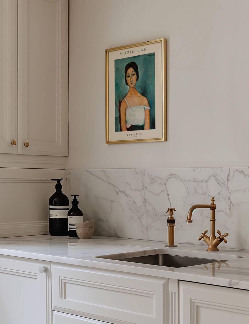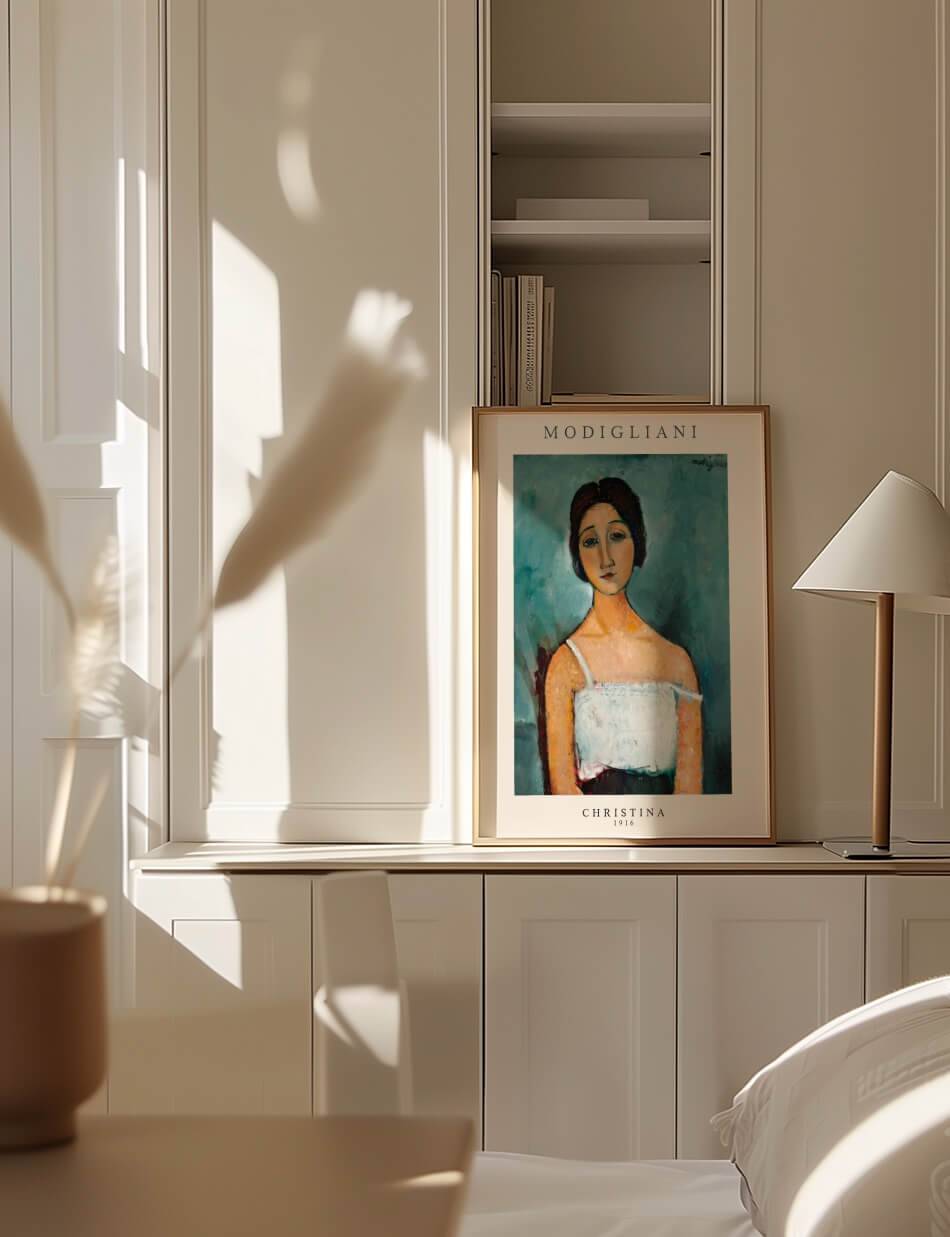 Amedeo Modiglianis “Christina” (1916) portrætterer en kvinde med en yndefuld holdning og et roligt, men melankolsk udtryk. Hendes lange hals og ovale ansigt er typiske for Modiglianis stil, og hendes store, udtryksfulde øjne formidler en følelse af introspektion. Maleriet er kendetegnet ved sine bløde, flydende linjer og dæmpede farver, som skaber en følelse af ro og eftertænksomhed. Værket er et smukt eksempel på Modiglianis evne til at fange det menneskelige sind og følelser gennem sin unikke kunstneriske stil.