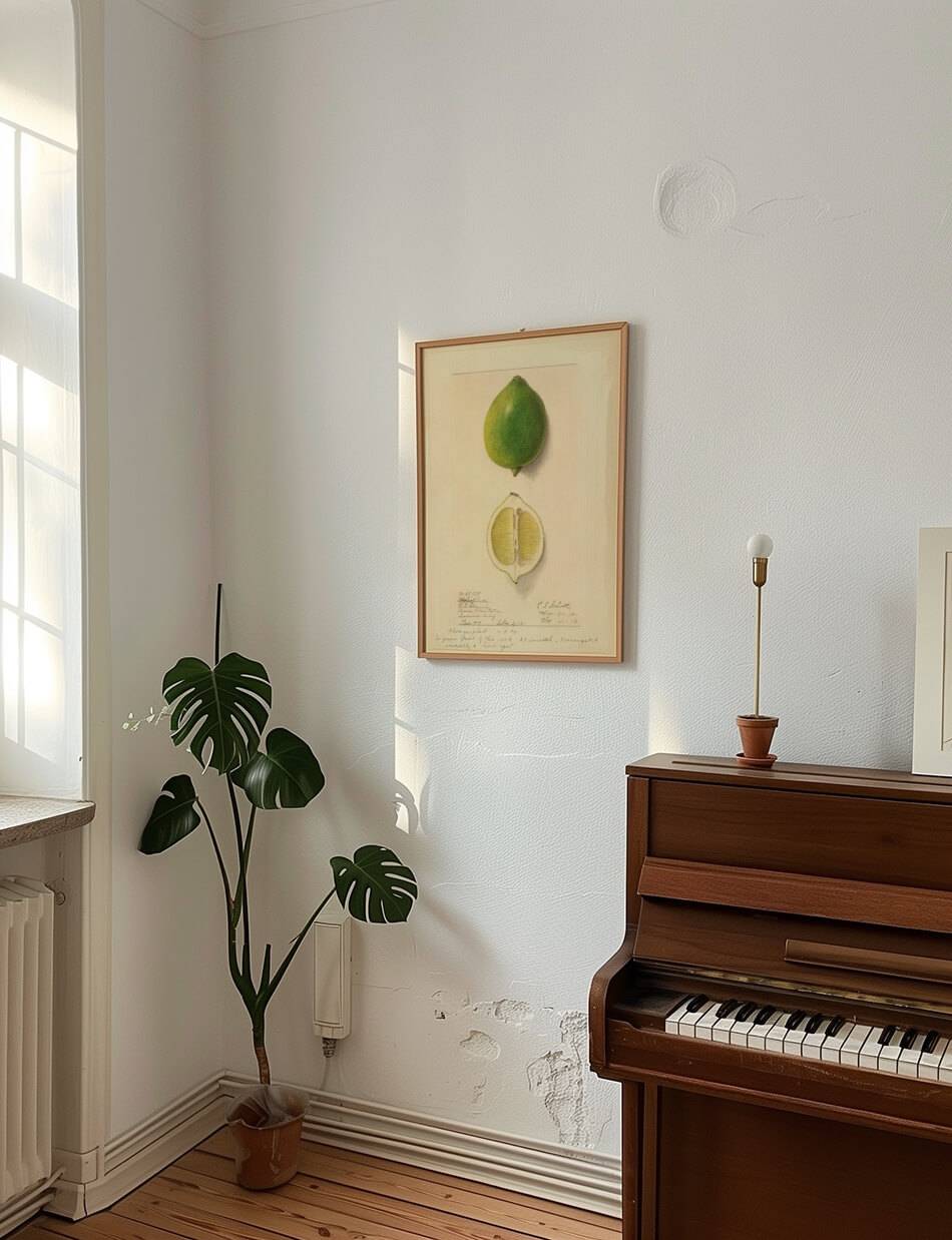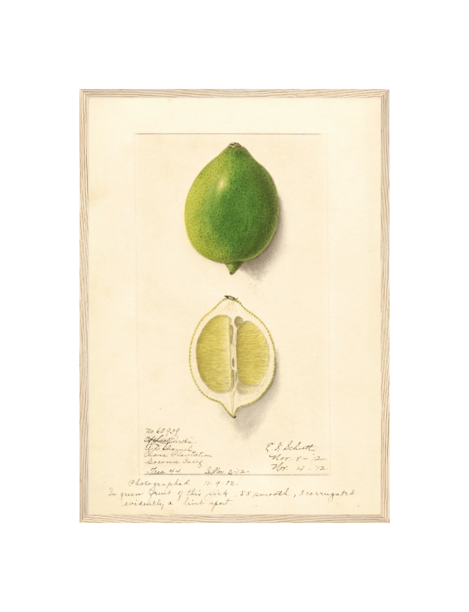 Denne detaljerede illustration viser en ‘Eureka’ citron i både hel og halv form. Med en dyb grøn farve og delikate skygger, præsenterer Schutt citronens tekstur og saftige indre med stor præcision. Den omhyggelige gengivelse fanger frugtens naturlige skønhed og dens karakteristiske form, hvilket gør det til et enestående stykke botanisk kunst.