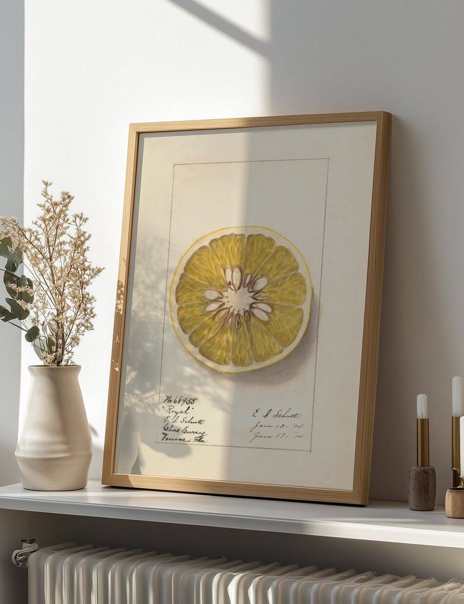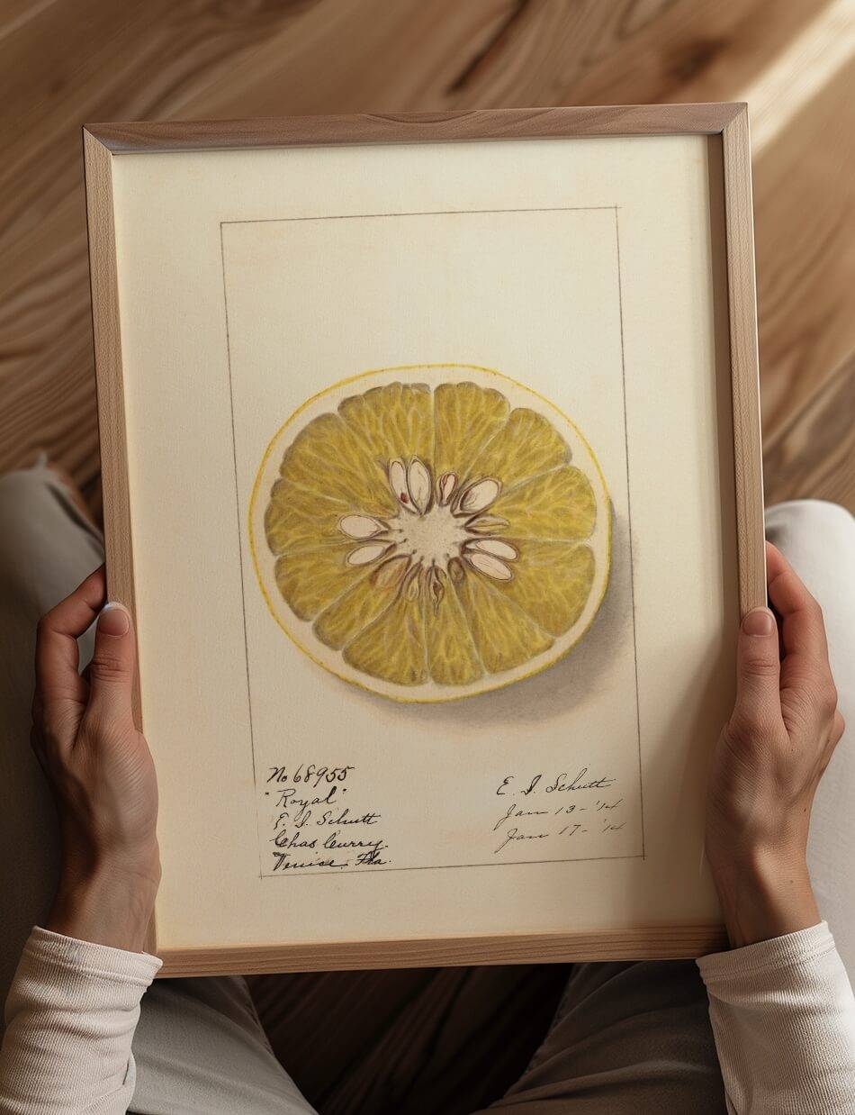 Denne plakat, skabt af kunstneren Ellen Isham Schutt, præsenterer en delikat og detaljeret illustration af en grapefrugt skåret i halve, kendt som “Royal.” Tegningen fremhæver frugtens struktur med dens mange saftige segmenter og kerner i midten. Farverne og de fine detaljer giver et realistisk indtryk af frugtens tekstur og friskhed. Plakaten er en hyldest til naturens skønhed og botanisk kunst og viser Schutts talent for præcise og æstetisk tiltalende botaniske illustrationer. Den fungerer som en videnskabelig og kunstnerisk fejring af grapefrugten.