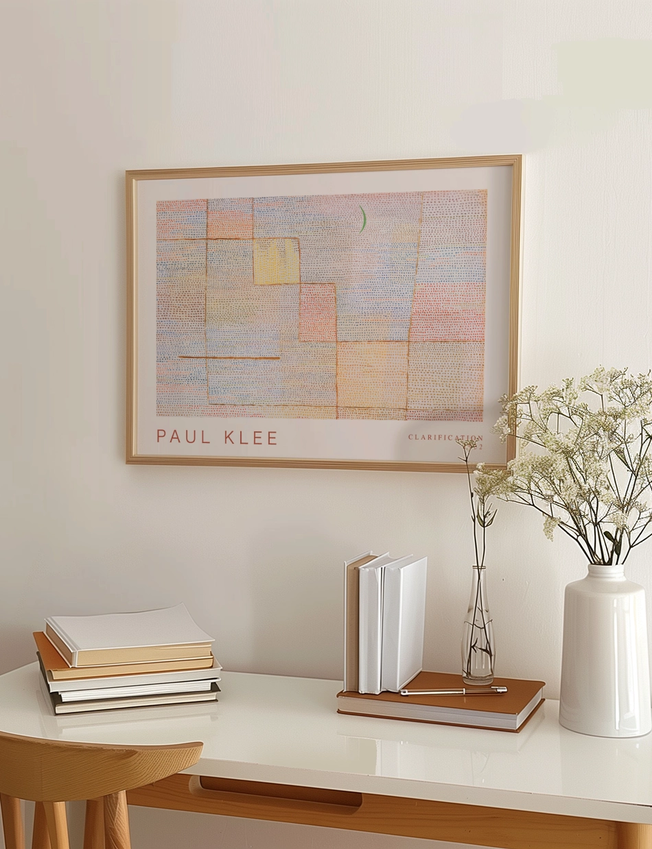Dette kunstprint er en hyldest til Bauhaus-æstetikken og Klees filosofi om at “tage en linje med på en gåtur”. Med sit sofistikerede farvespil og de fine detaljer bringer “Clarification” en intellektuel og kunstnerisk dybde til rummet. Værkets teksturerede udseende og de dæmpede pastelfarver gør det både moderne og tidløst, perfekt til dem der ønsker et stykke verdenskunst, der udstråler harmoni, orden og kreativ opdagelse.