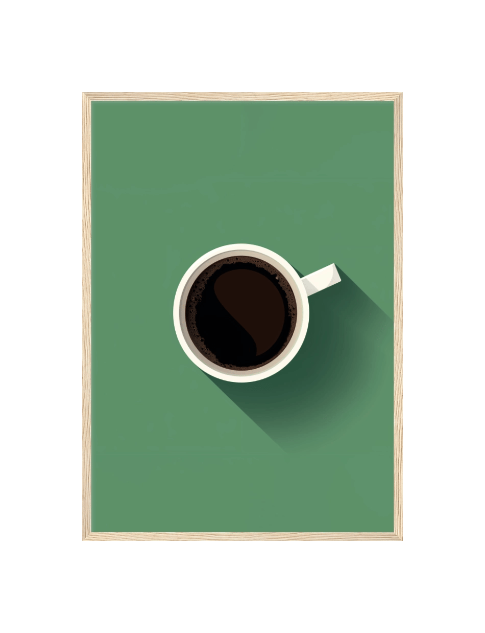Inviter til en pause med denne enkle, men stemningsfulde plakat, der fremhæver en klassisk kop sort kaffe set oppefra. Den minimalistiske stil og de bløde skygger skaber en afslappende og næsten meditativ atmosfære, perfekt for kaffeelskere og dem, der værdsætter de små øjeblikke i hverdagen.