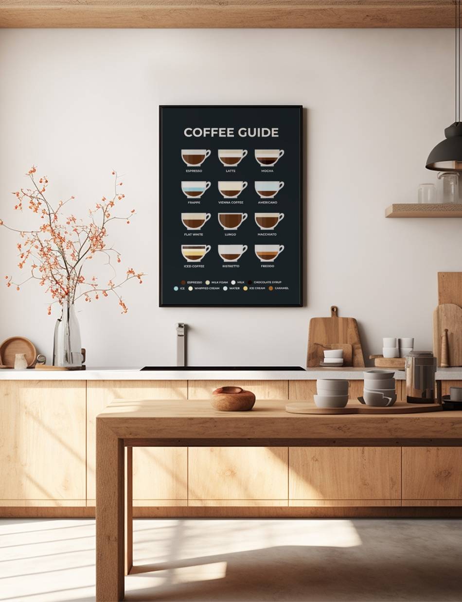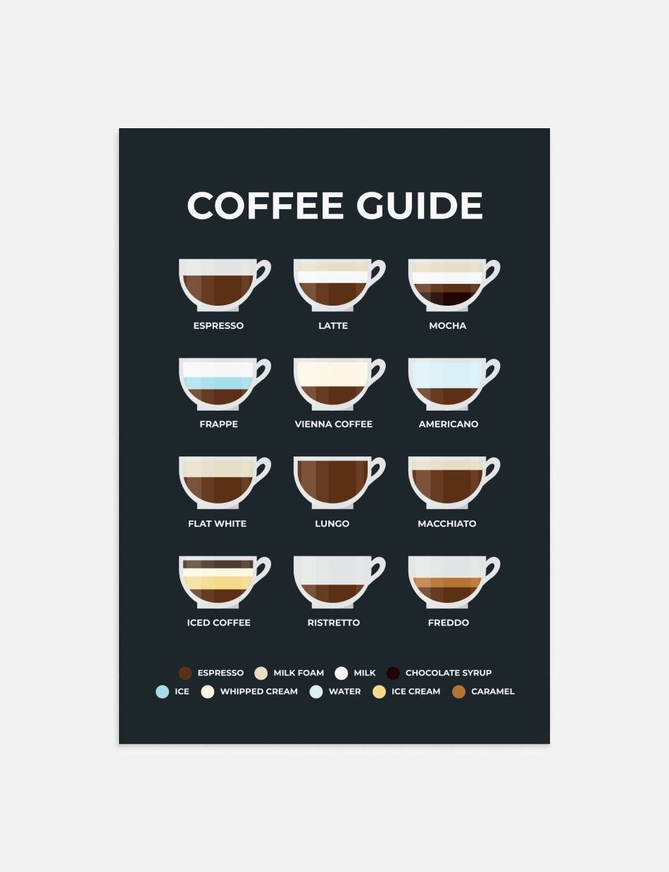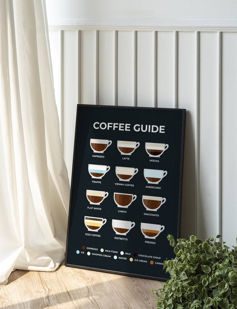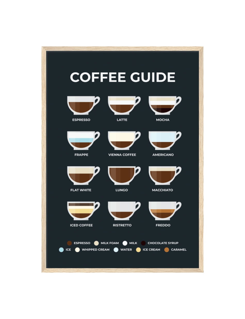 Vores ‘Coffee Guide’ plakat er en hyldest til kaffens verden. Med illustrationer og beskrivelser af forskellige bryggeteknikker, er det den ultimative vejledning for enhver kaffeentusiast.