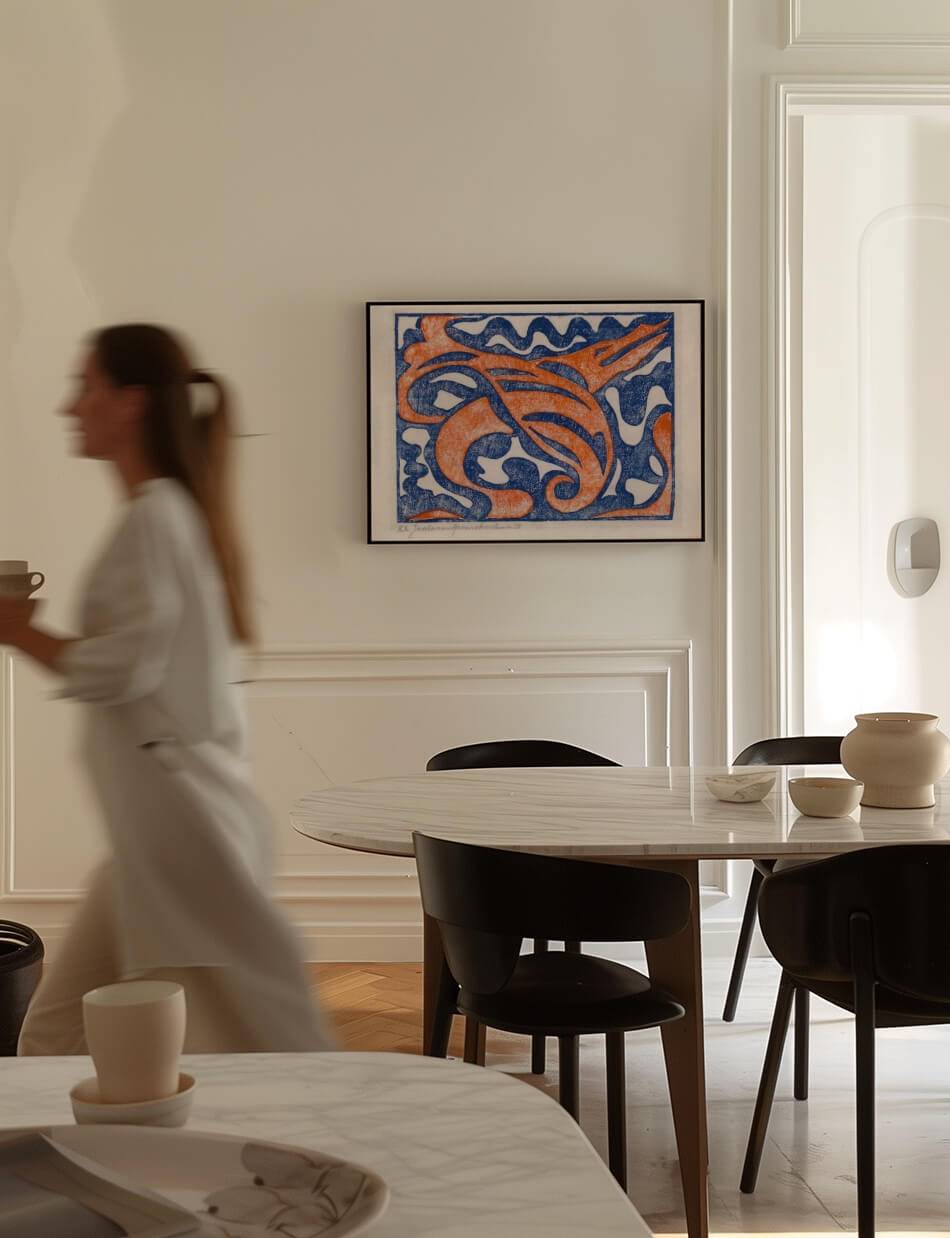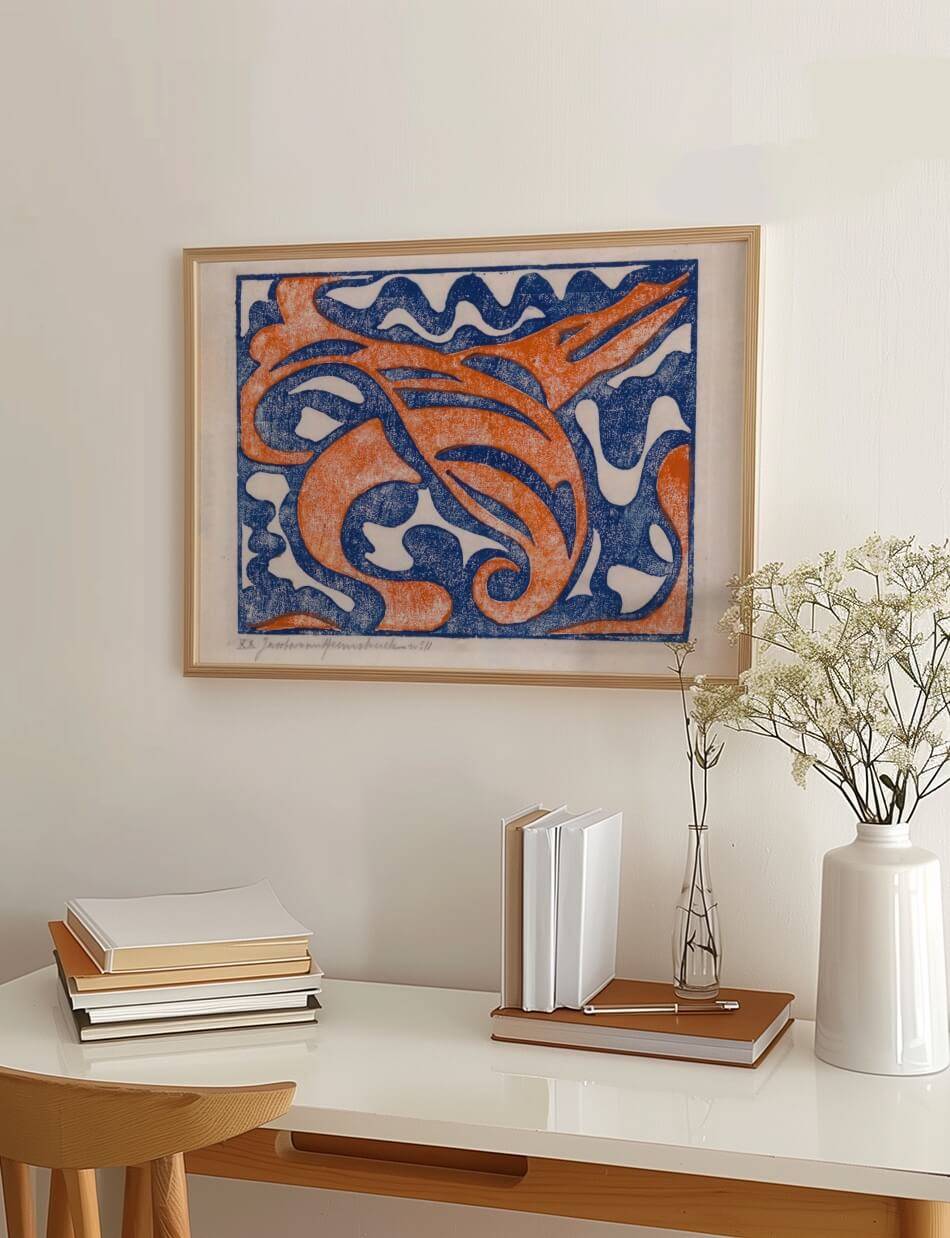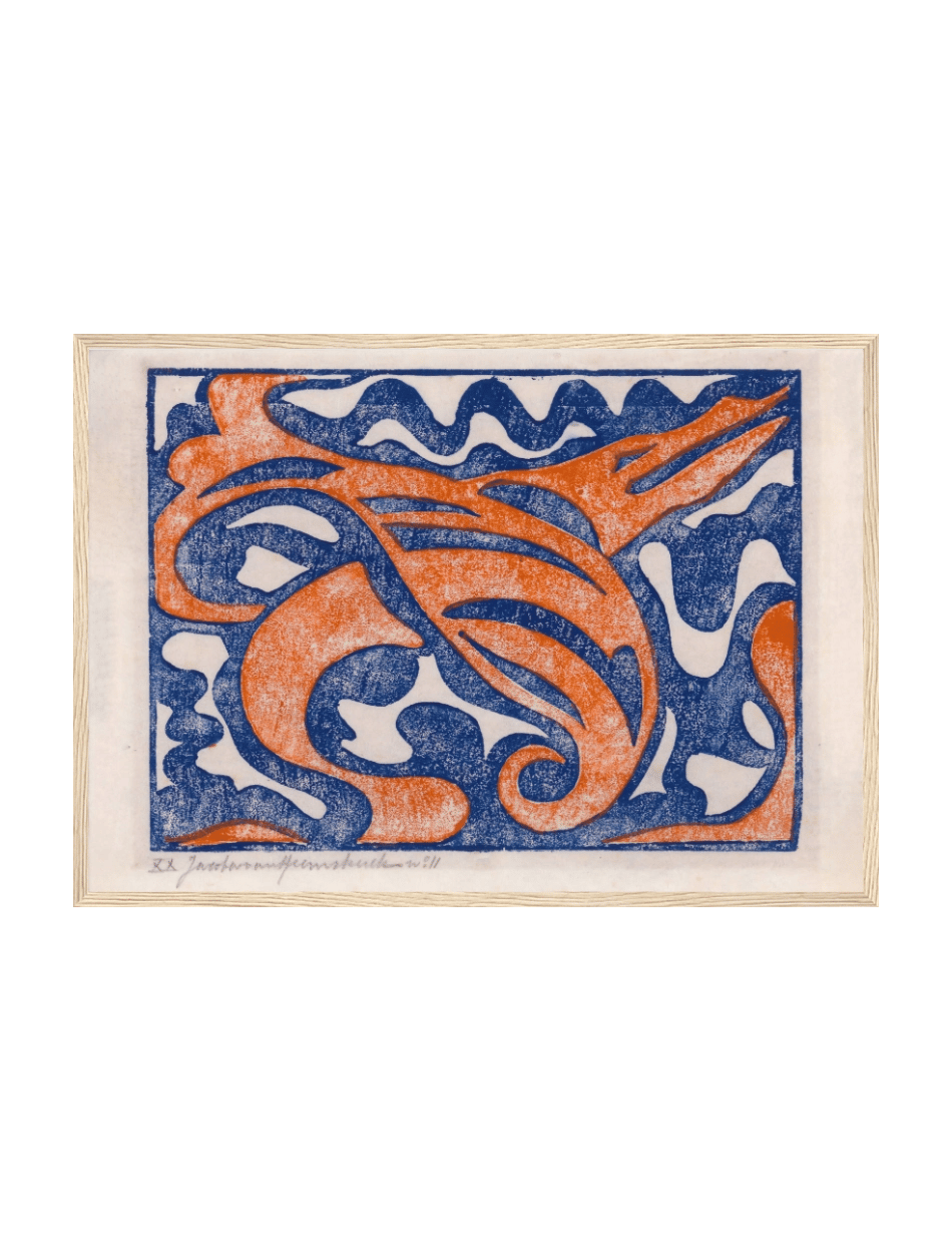 Jacoba van Heemskercks Compositie XX er en kraftfuld og levende komposition, hvor bølgende linjer og dynamiske former smelter sammen i en harmonisk kontrast mellem dyb blå og intens orange. Værket fremkalder en følelse af bevægelse og energi, hvor det abstrakte mønster kan tolkes som en fusion af naturens organiske linjer og menneskeskabt design.