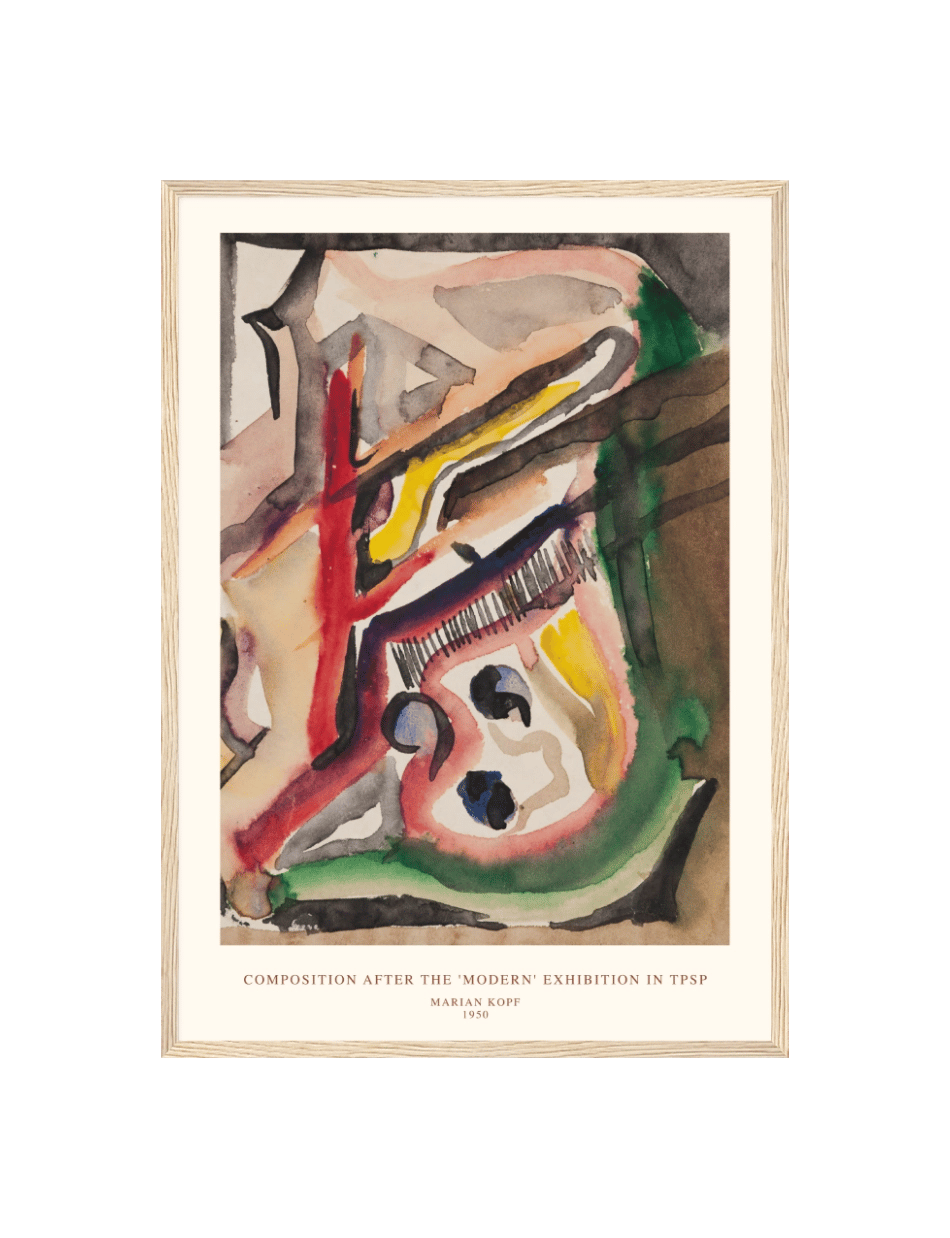 Marian Kopfs ‘Composition After the ‘Modern’ Exhibition in Tpsp’ fra 1950 er en eksplosion af farver og abstrakte former, der fanger essensen af den avantgarde kunstbevægelse. Med dristige penselstrøg og en legende komposition inviterer værket til at udforske et dynamisk og farverigt univers.