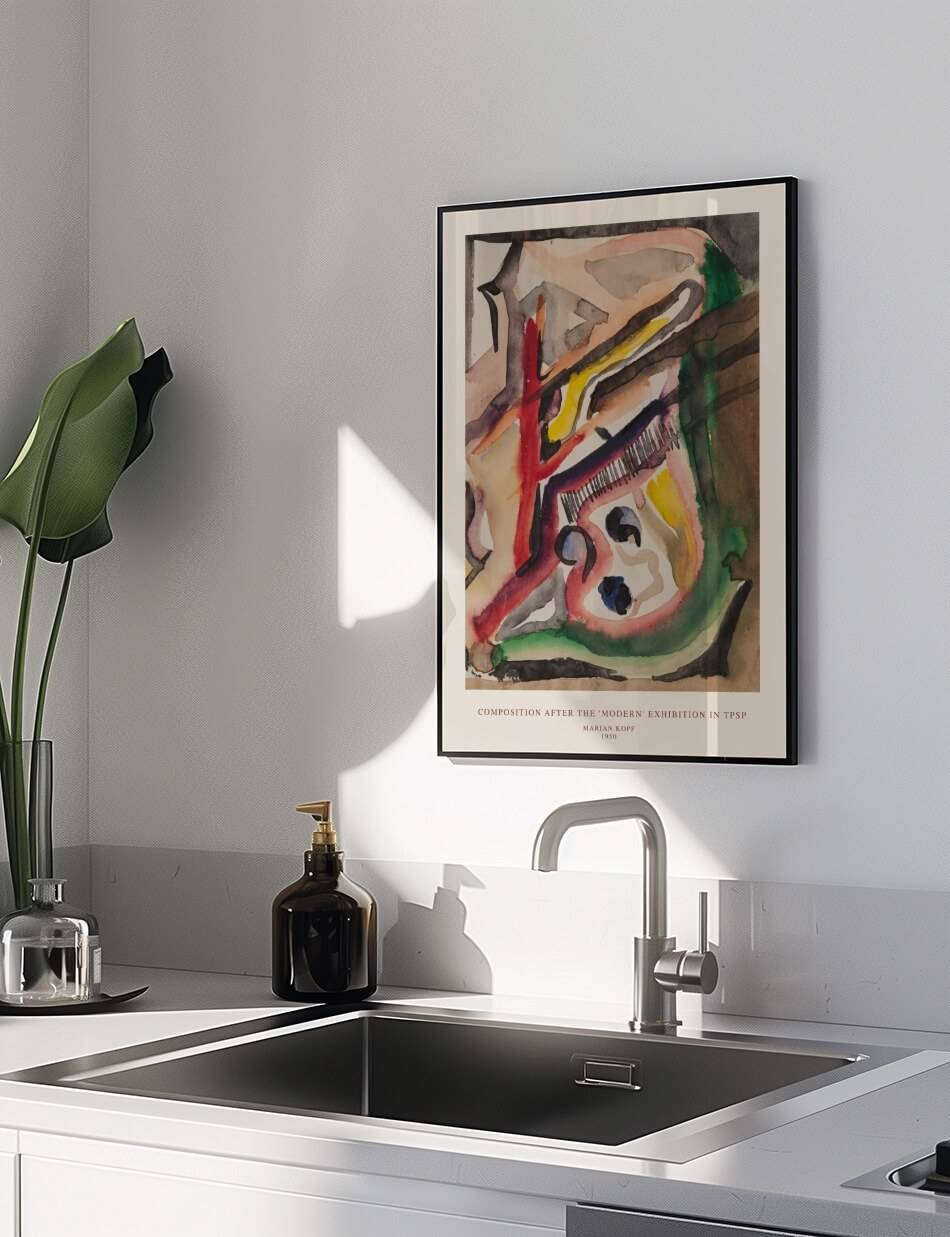 Værkets abstrakte natur giver plads til individuelle fortolkninger, og det er netop denne åbenhed, der gør det til et fascinerende kunstværk. ‘Composition After the ‘Modern’ Exhibition in Tpsp’ er et must-have for enhver kunstelsker, der ønsker at tilføje et strejf af modernisme og farve til deres hjem.