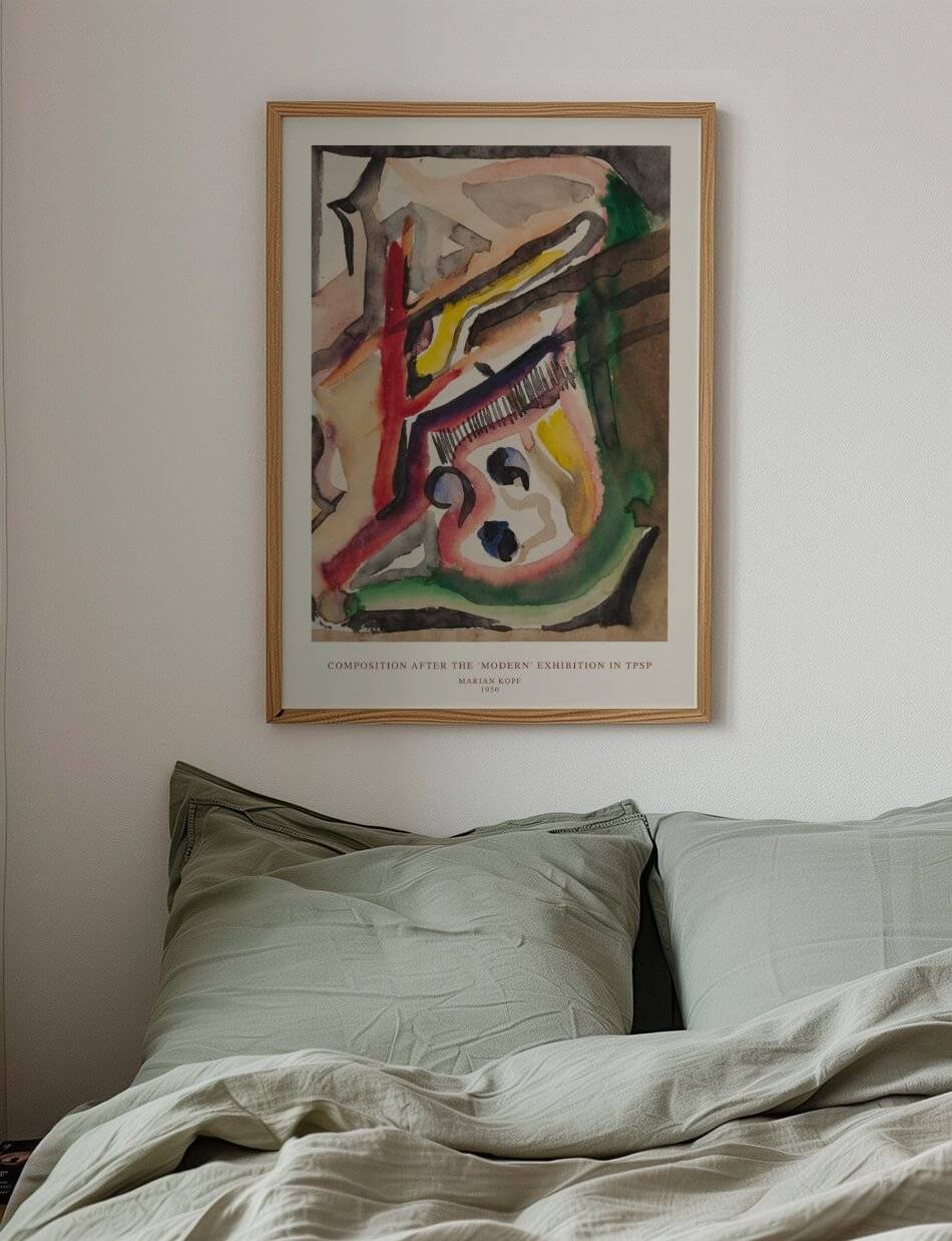 Marian Kopfs ‘Composition After the ‘Modern’ Exhibition in Tpsp’ fra 1950 er en eksplosion af farver og abstrakte former, der fanger essensen af den avantgarde kunstbevægelse. Med dristige penselstrøg og en legende komposition inviterer værket til at udforske et dynamisk og farverigt univers.