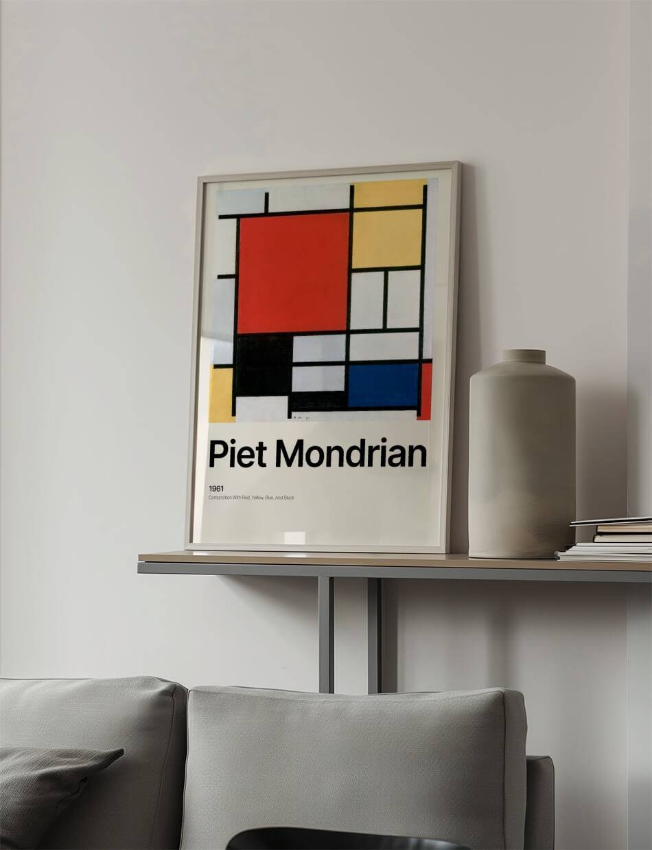 Denne plakat, Composition with Red, Yellow, Blue, and Black, skabt af Piet Mondrian i 1921, er et fremragende eksempel på neoplasticisme. Mondrian bruger enkle geometriske former og primærfarver til at skabe en harmonisk balance mellem farve og komposition, hvilket gør dette værk til et tidløst mesterværk inden for modernistisk kunst.
