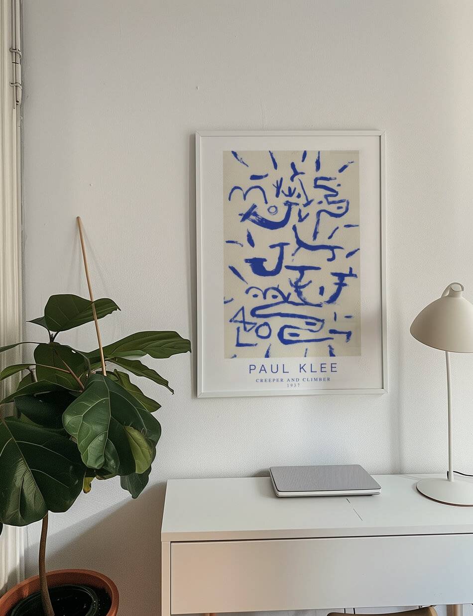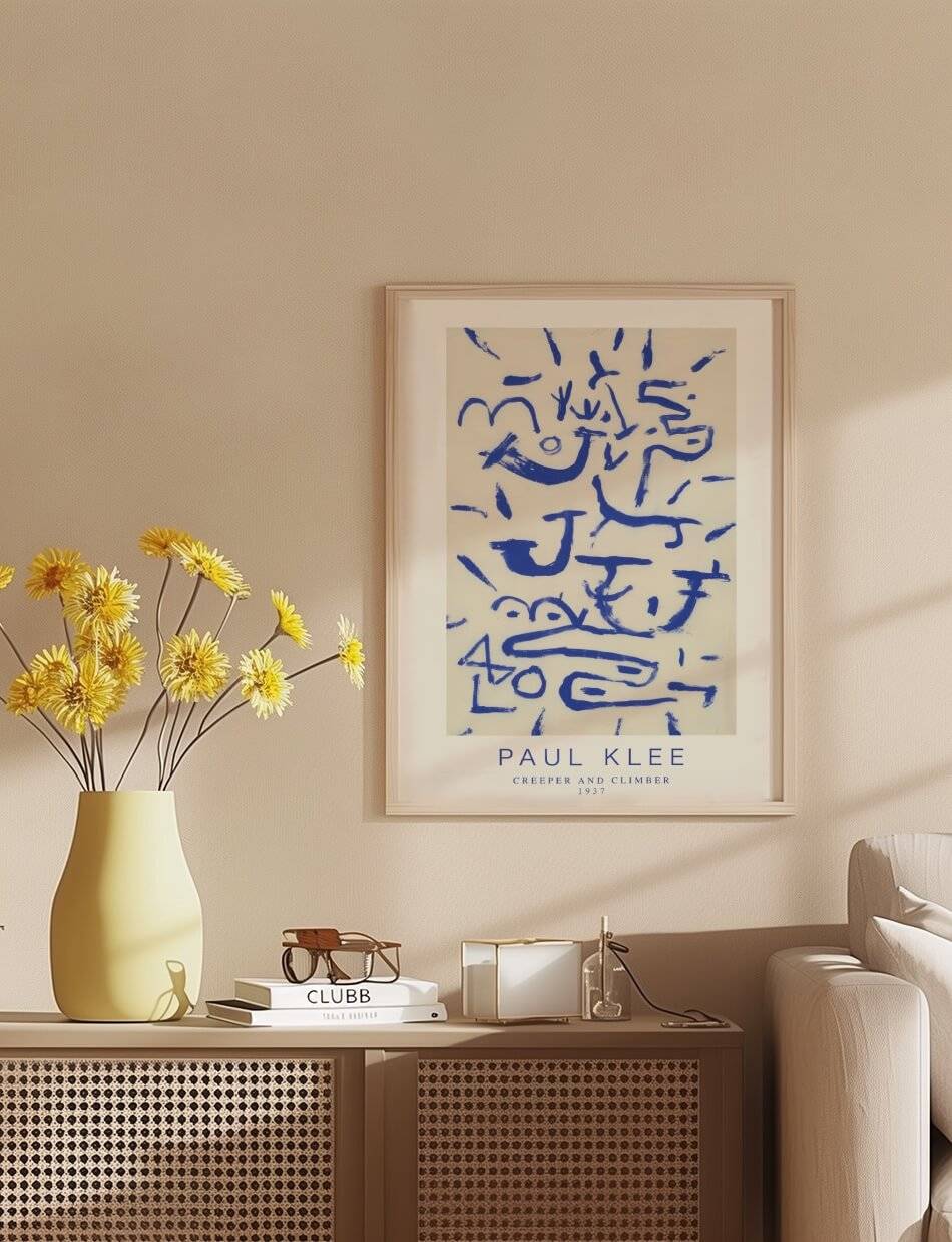 Creeper and Climber af Paul Klee er et dynamisk kunstværk, der bruger dybe blå nuancer mod en lys baggrund for at skabe en følelse af bevægelse og liv. De abstrakte former og linjer minder om klatrende og krybende væsner, hvilket giver værket en organisk og næsten levende kvalitet. Klees minimalistiske stil kombineret med hans mestre brug af farve gør dette kunstværk både enkelt og komplekst, og inviterer beskueren til at fortolke de symbolske figurer og mønstre på mange forskellige måder. Dette værk er et fantastisk eksempel på Klees evne til at skabe dybtgående kunst med enkle midler.
