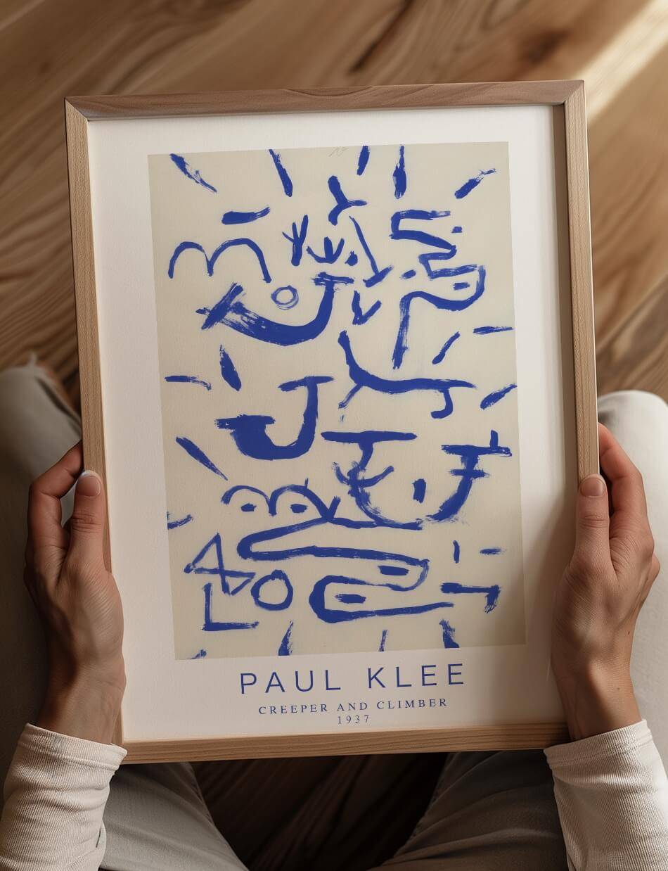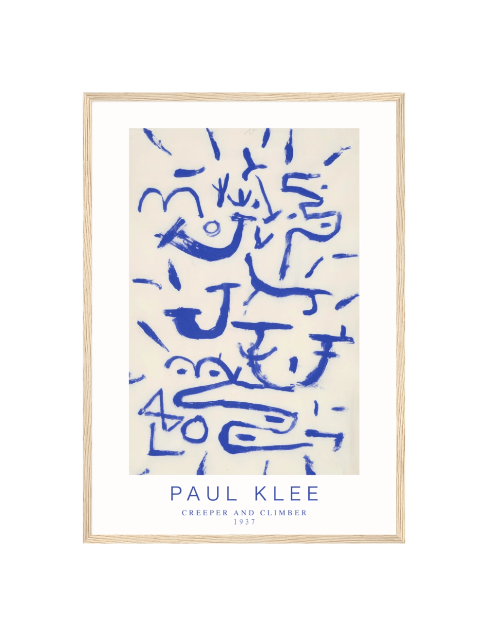 Creeper and Climber af Paul Klee er et dynamisk kunstværk, der bruger dybe blå nuancer mod en lys baggrund for at skabe en følelse af bevægelse og liv. De abstrakte former og linjer minder om klatrende og krybende væsner, hvilket giver værket en organisk og næsten levende kvalitet. Klees minimalistiske stil kombineret med hans mestre brug af farve gør dette kunstværk både enkelt og komplekst, og inviterer beskueren til at fortolke de symbolske figurer og mønstre på mange forskellige måder. Dette værk er et fantastisk eksempel på Klees evne til at skabe dybtgående kunst med enkle midler.