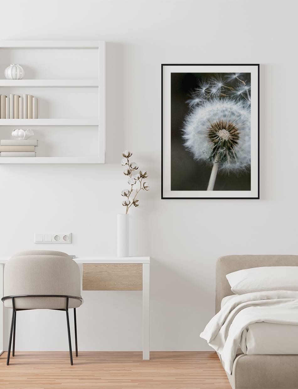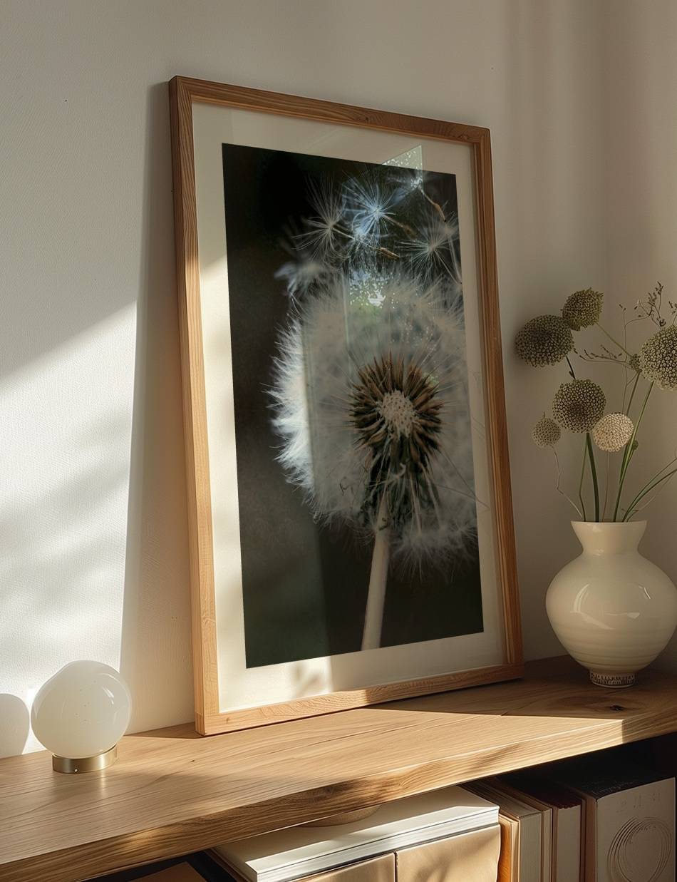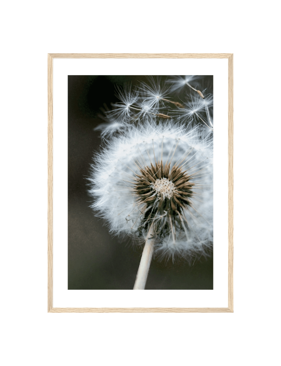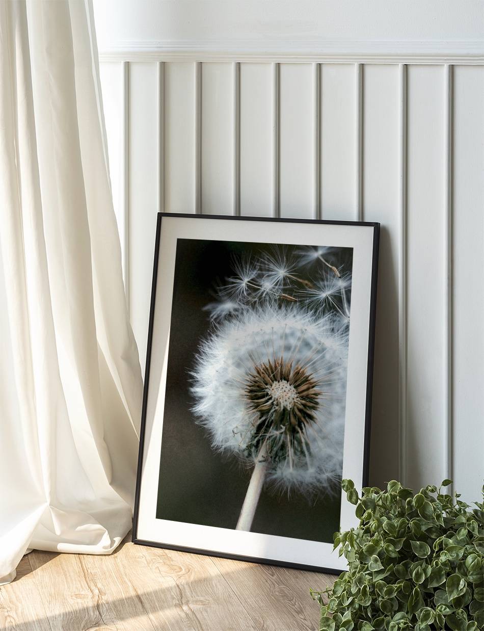 Lad denne plakat af en mælkebøtte, der sender sine frø af sted i vinden, minde dig om barndommens enkle glæder og drømmenes kraft. En harmonisk tilføjelse til ethvert kreativt rum.