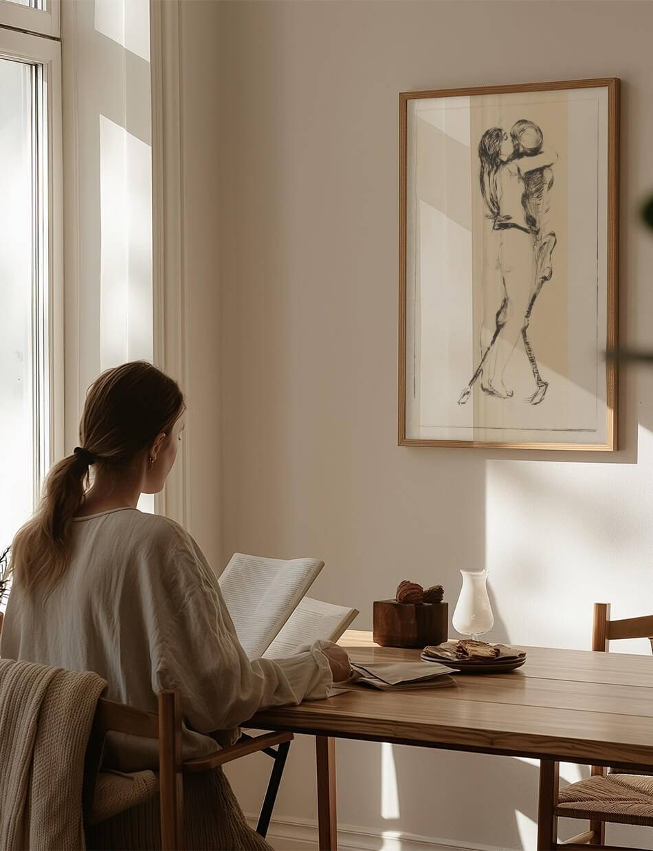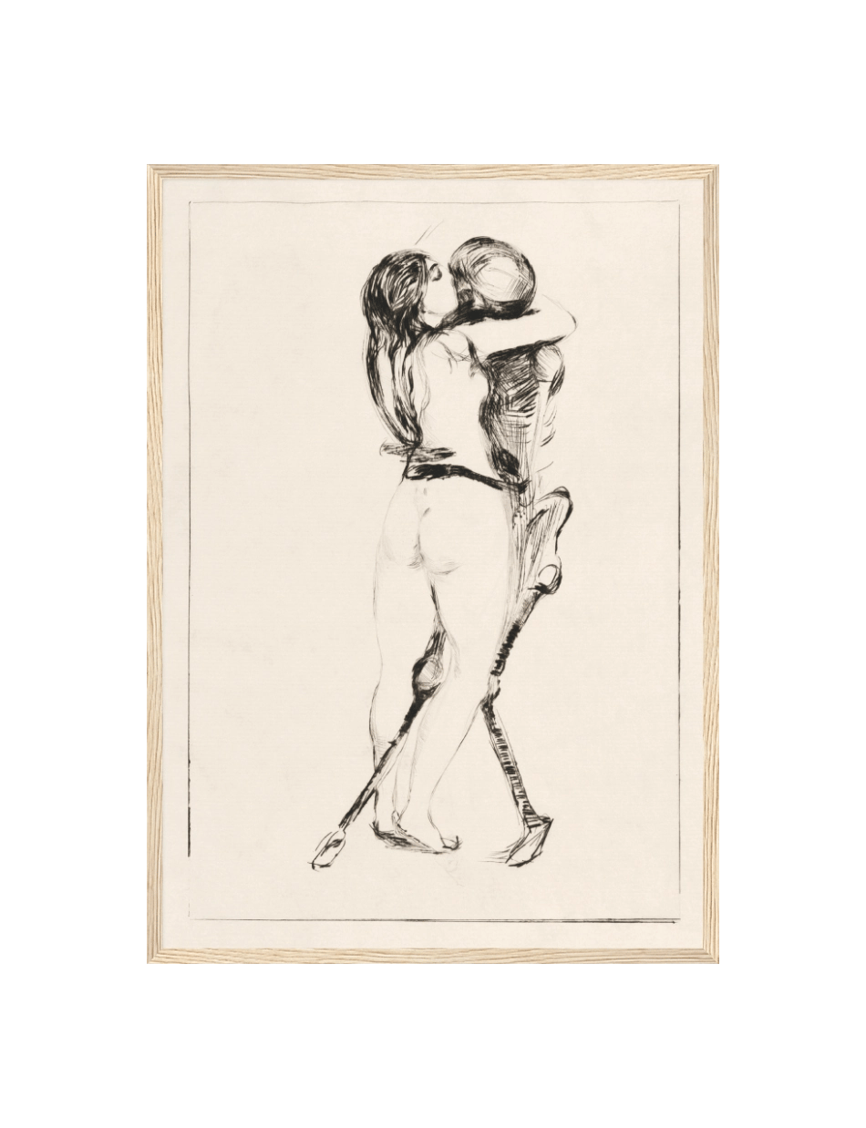 Death and the Woman, skabt af Edvard Munch, viser en intens og rørende scene af en kvinde i en tæt omfavnelse med Døden, repræsenteret som et skelet. Kvinden står nøgen, mens hun klynger sig til Døden med en blanding af hengivenhed og fortvivlelse. De skarpe, ekspressive linjer og den enkle komposition fremhæver kontrasten mellem liv og død, samt den menneskelige frygt og accept af det uundgåelige. Dette værk fanger den dybe psykologiske kompleksitet og følelsesmæssige intensitet, som Munch ofte udforsker i sine malerier.