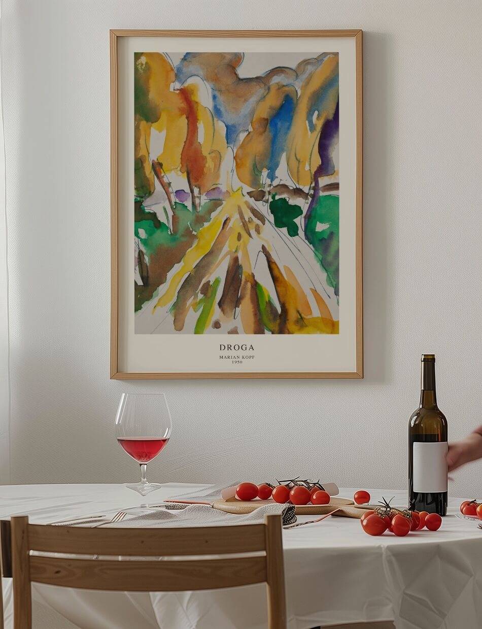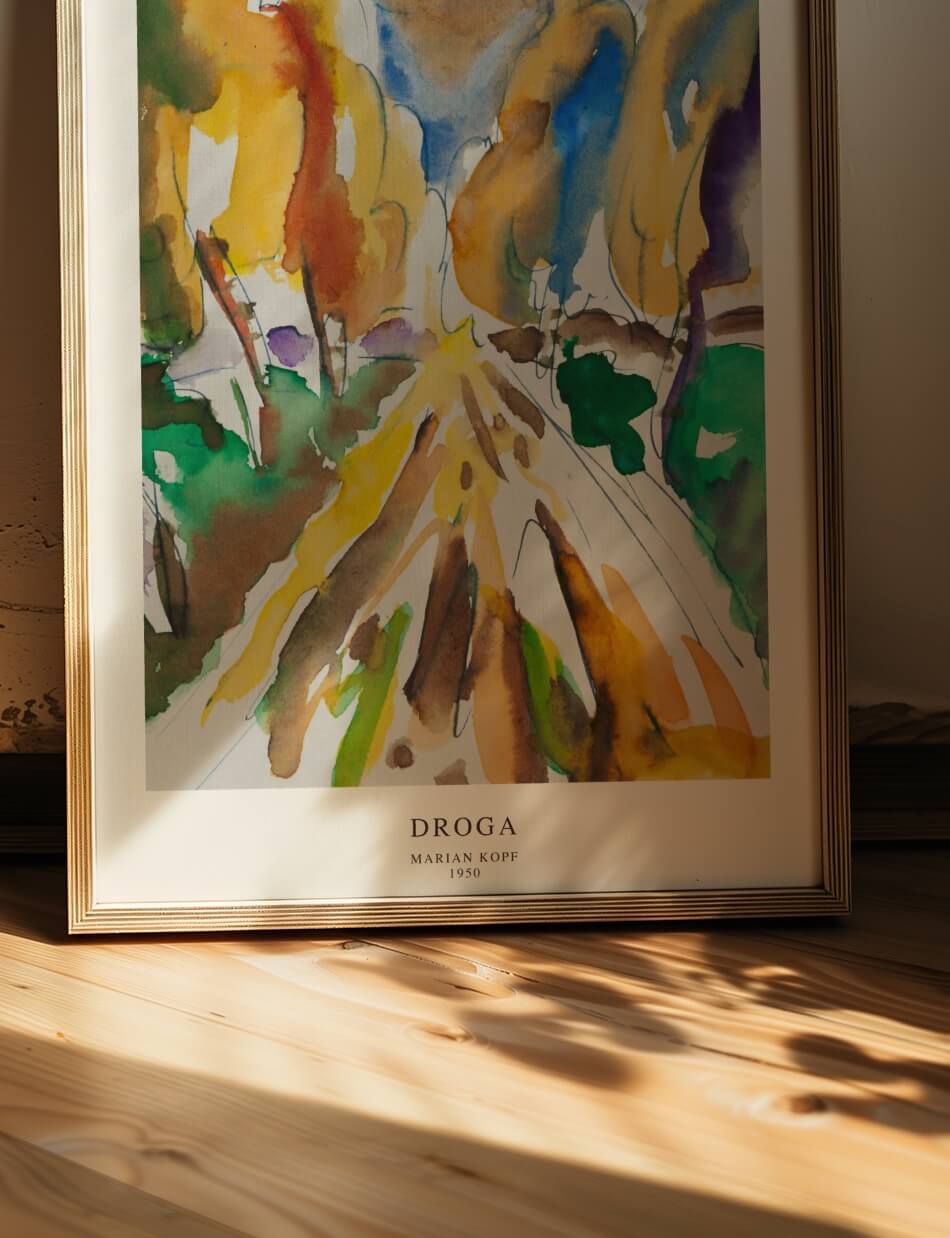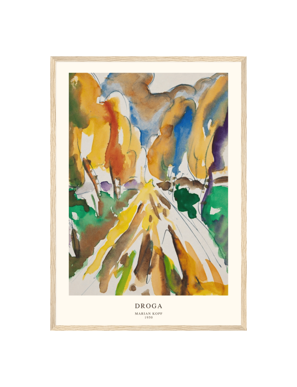 Marian Kopfs ‘Droga’ fra 1950 indfanger essensen af en solbeskinnet vej, der snor sig gennem et landskab i forvandling. Maleriet er en eksplosion af farver, hvor varme gule og orange toner møder kølige blå og grønne nuancer. Med legende penselstrøg og en løs komposition skaber Kopf en følelse af bevægelse og foranderlighed.