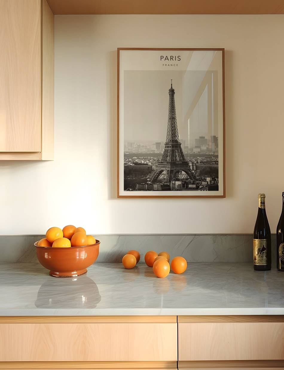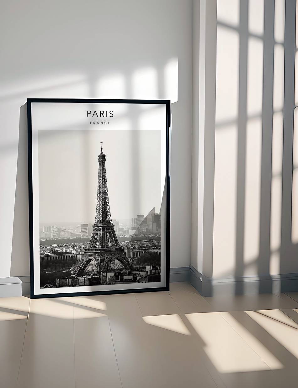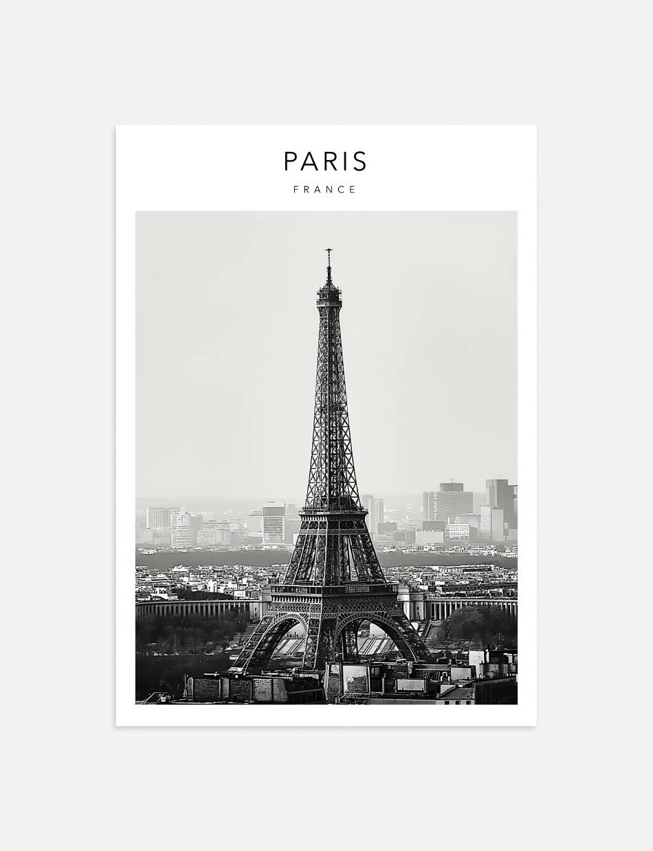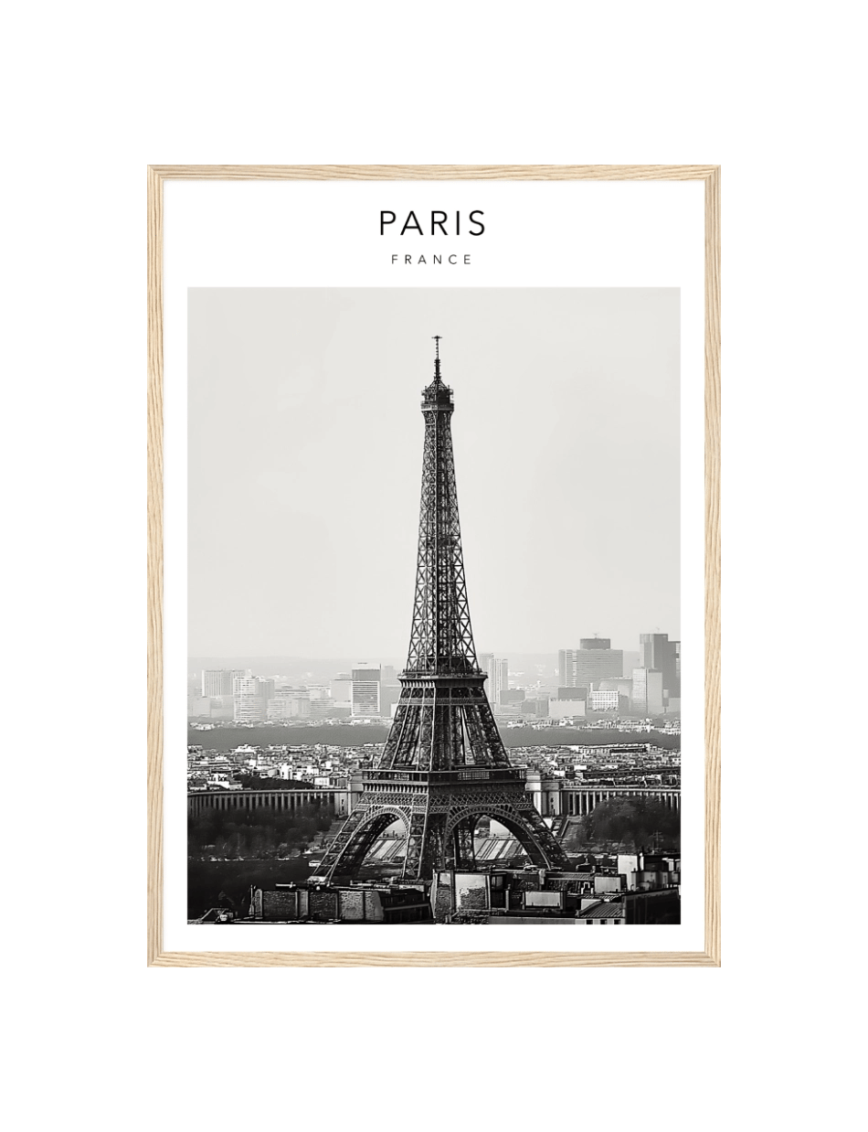 Denne fotopalakt fanger Eiffeltårnets ikoniske silhuet mod Paris’ bylandskab. Dette tidløse sort-hvid fotografi fremhæver tårnets detaljerede konstruktion samt byens charme, hvilket gør den til en elegant tilføjelse til enhver indretning.