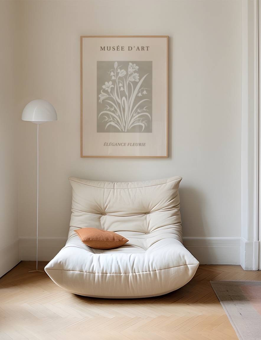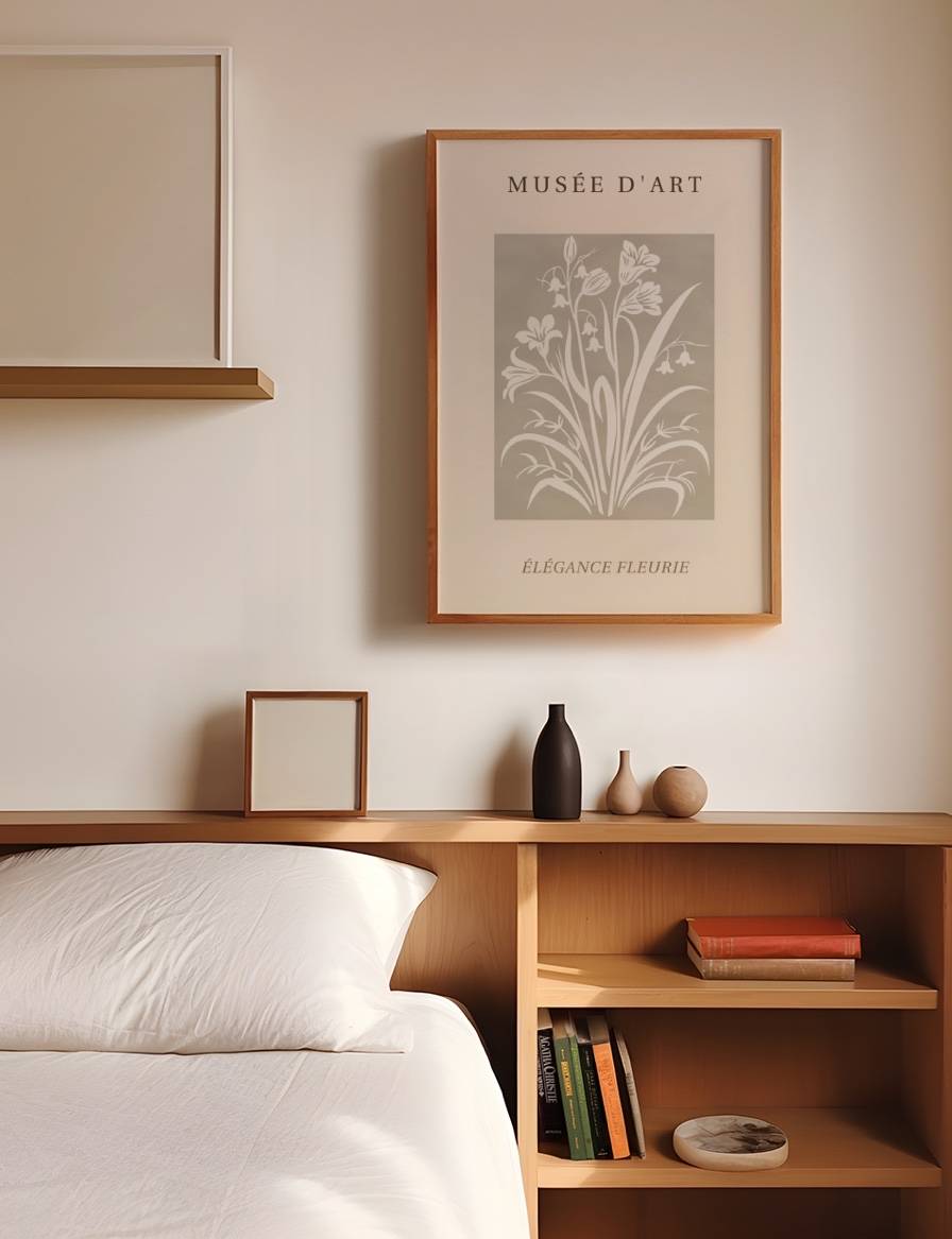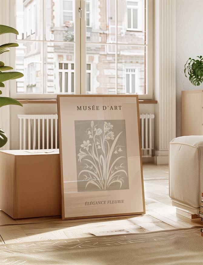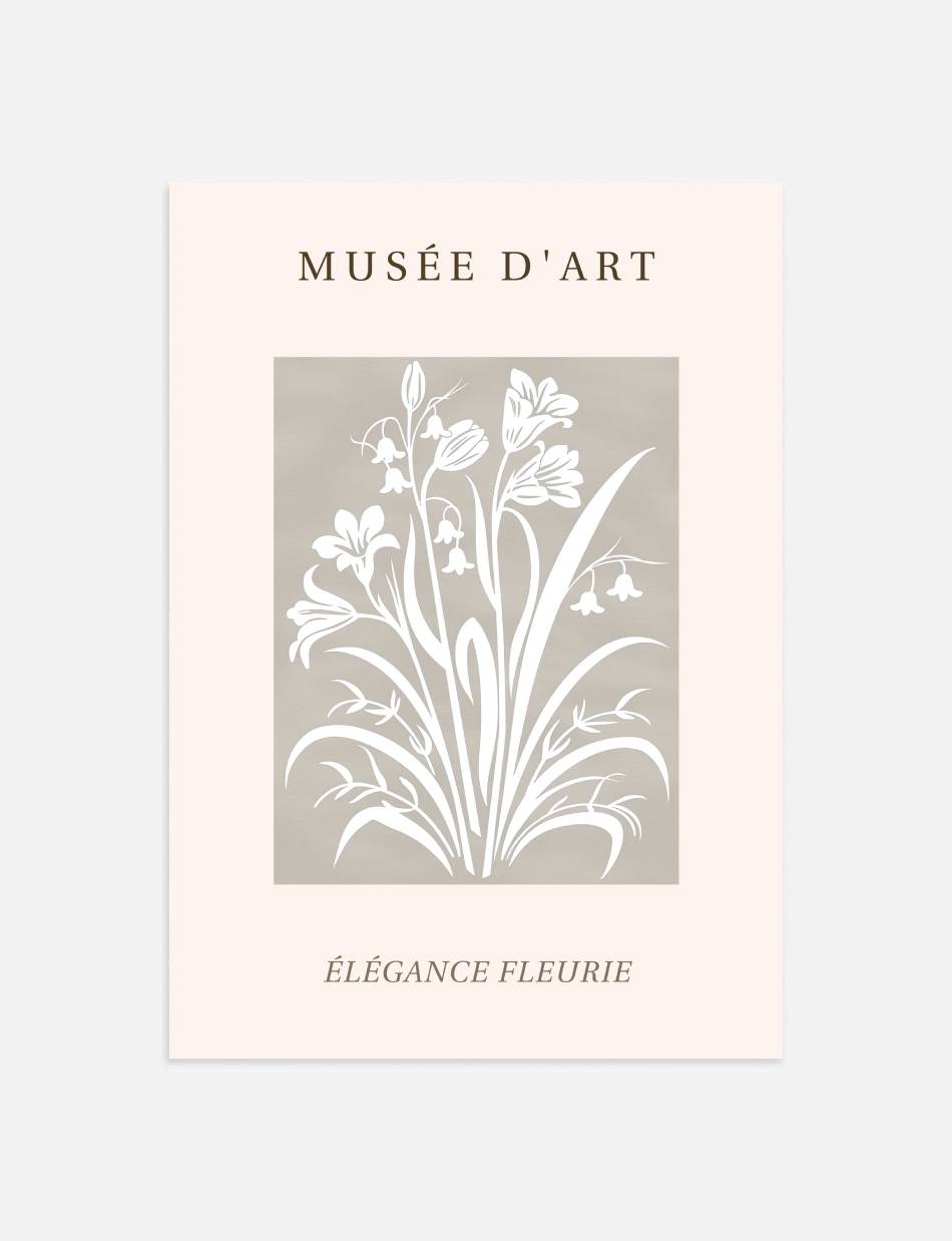 Indfang naturens delikate charme med Élégance Fleurie grafik plakaten. Denne grafiske plakat fejrer blomsternes enkle elegance med et raffineret, hvidt silhuet-design mod en grå baggrund. Perfekt til at tilføre et strejf af natur og finhed til dit hjem.