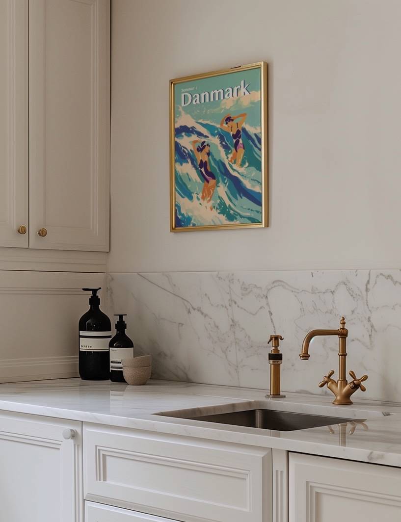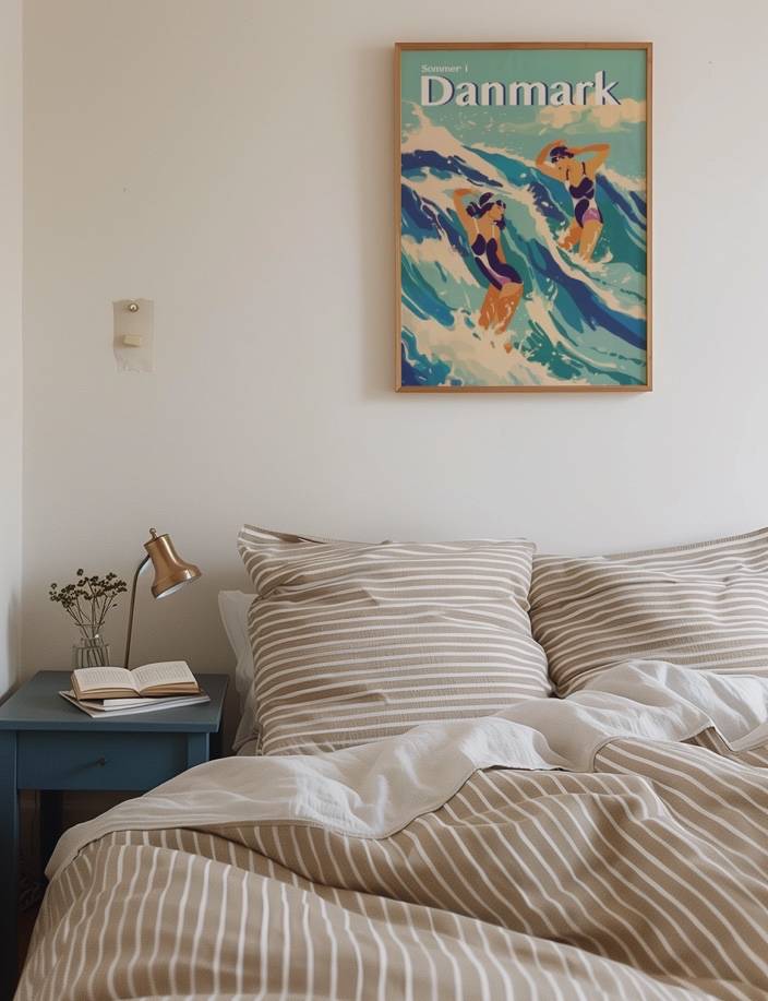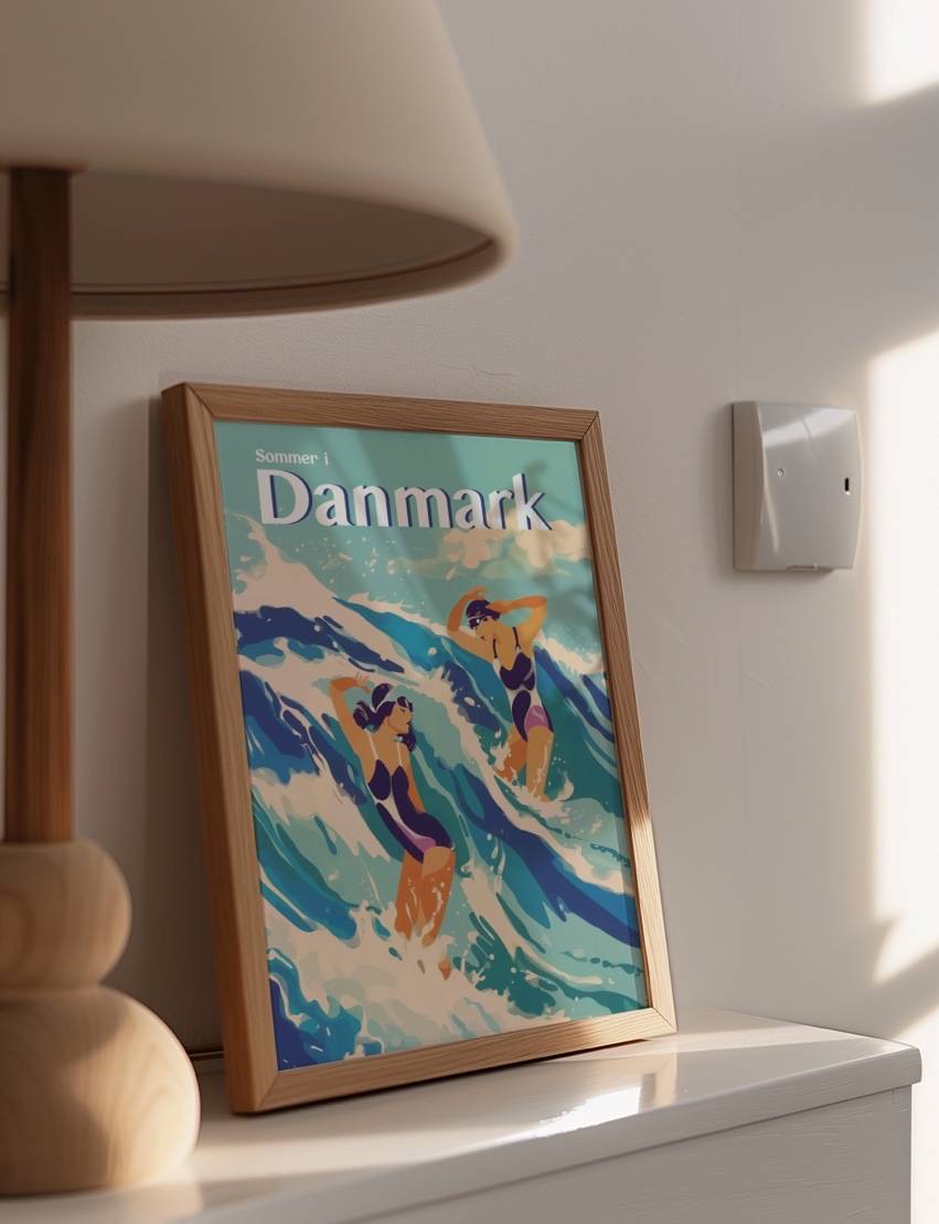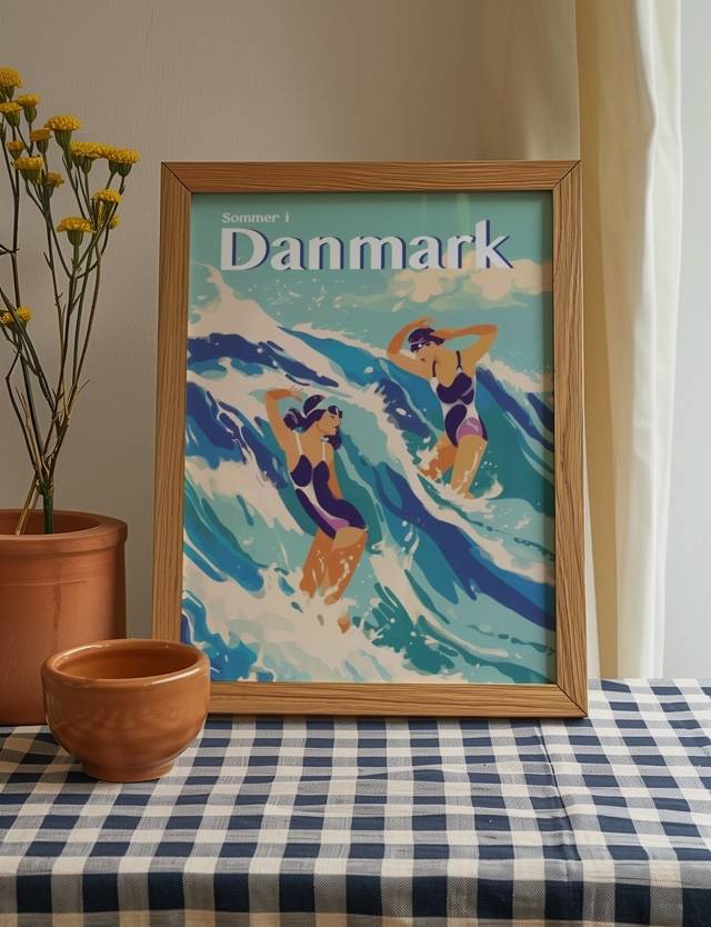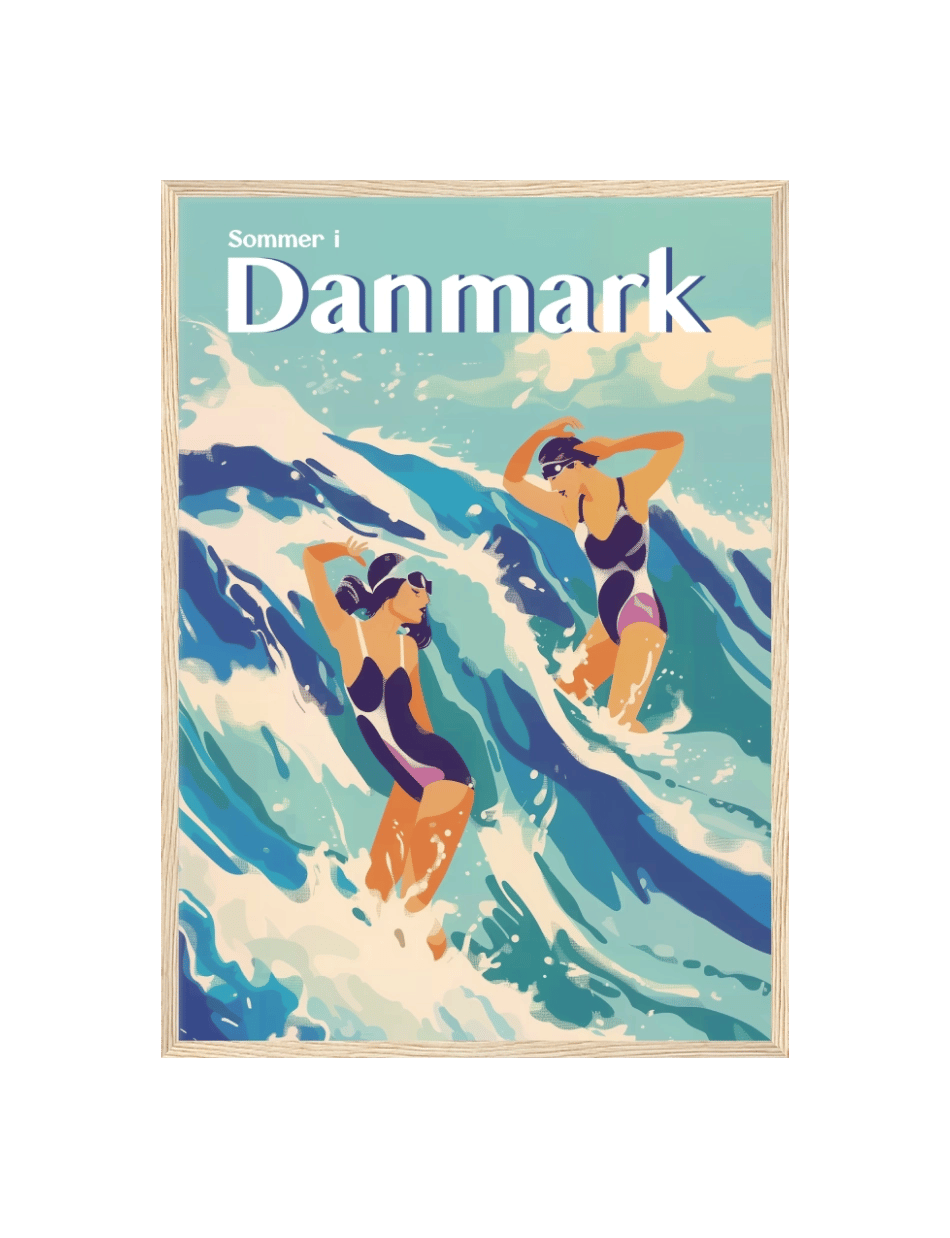 Mærk den friske havbrise og de brusende bølger denne plakat. Med de to svømmeres dynamiske bevægelser og farverige badetøj, fanger denne plakat følelsen af frihed og glæde på en sommerdag ved den danske kyst. Plakaten er en del af kollektionen Summer In Denmark.