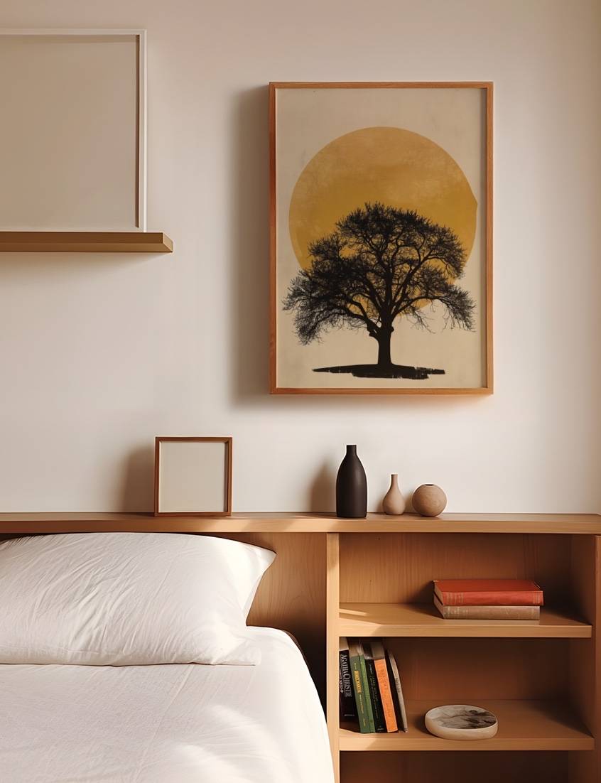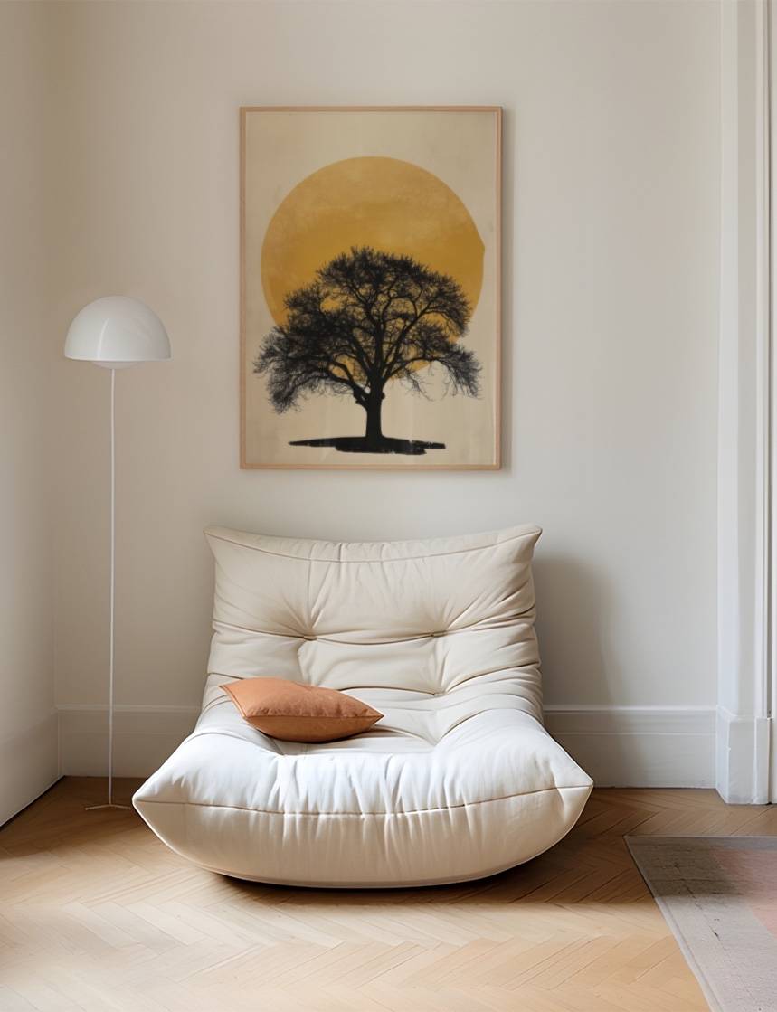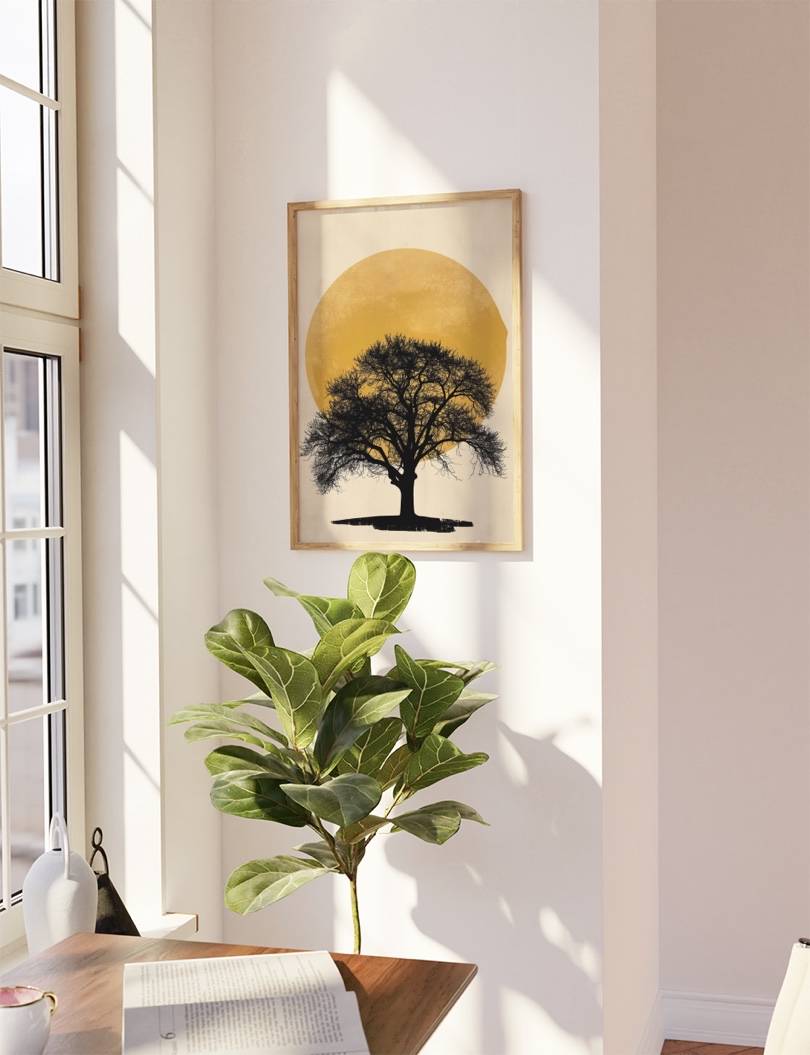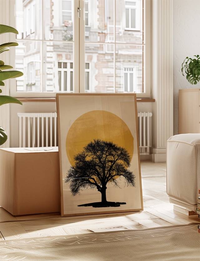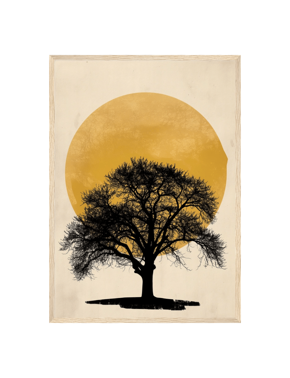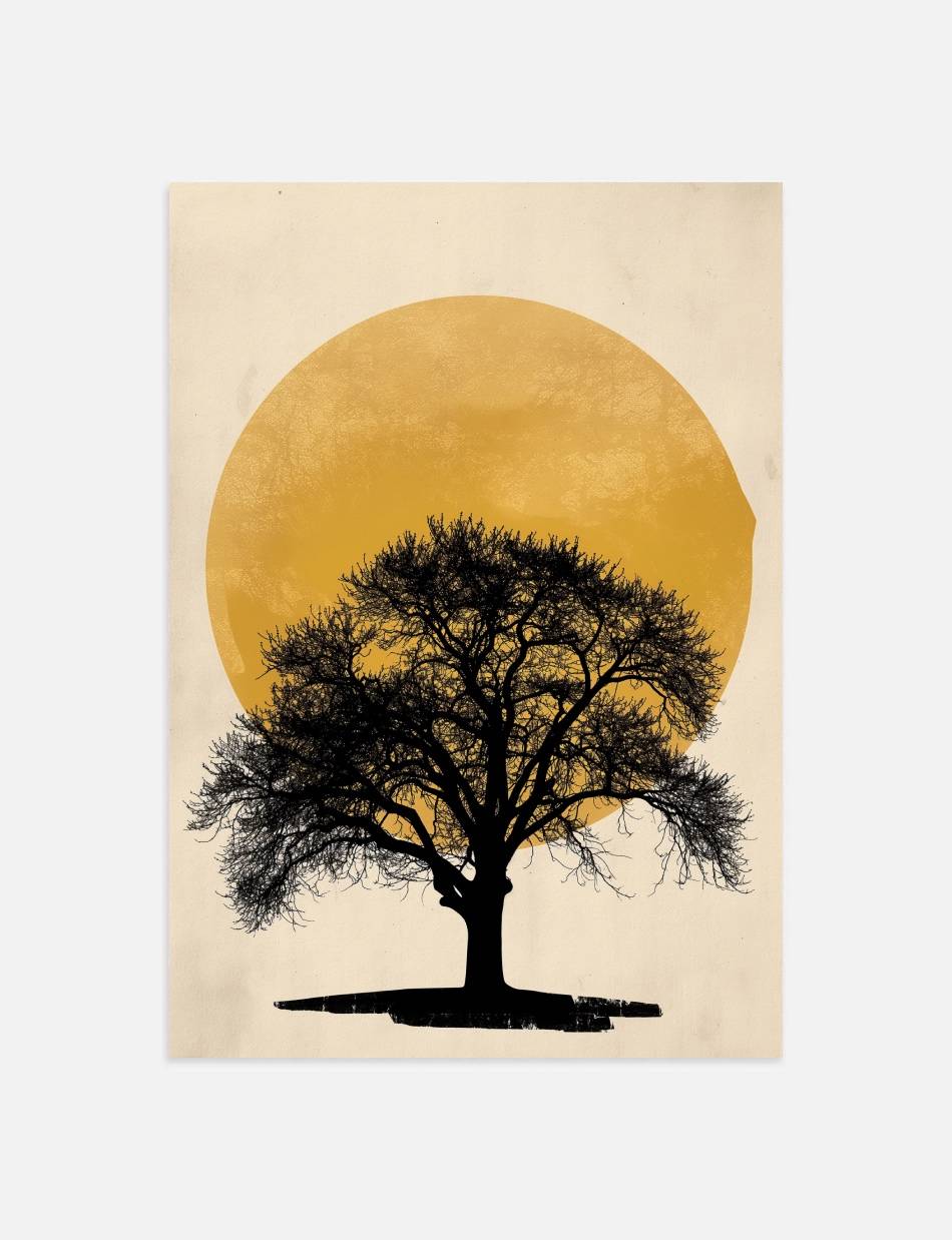 Eternal Radiance forener det majestætiske med det jordlige i en fængslende grafisk plakat. Træets silhuet står skarpt mod den gyldne sol, en scene der indfanger naturens stille kraft og skønhed. Baggrunden giver en fornemmelse af historie og dybde, hvilket gør dette værk til en tidløs tilføjelse til enhver indretning, der søger en forbindelse til naturens evige cyklusser.