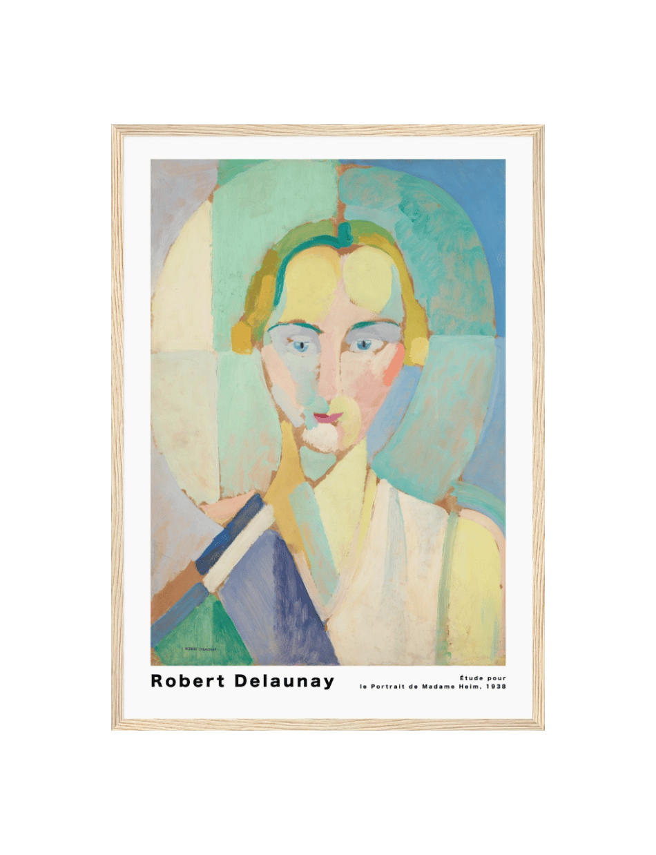 Étude pour le Portrait de Madame Heim’ af Robert Delaunay er et fascinerende portræt, der kombinerer abstrakte former og bløde farver. Ansigtet er bygget op af geometriske flader i nuancer af pastel, hvilket skaber en næsten drømmeagtig kvalitet. De sarte farver og subtile linjer giver værket en følelse af ro og elegance, mens den abstrakte stil tilføjer en moderne kant. Dette portræt indfanger ikke kun Madame Heim’s ydre, men også en dybere, mere kompleks skønhed.