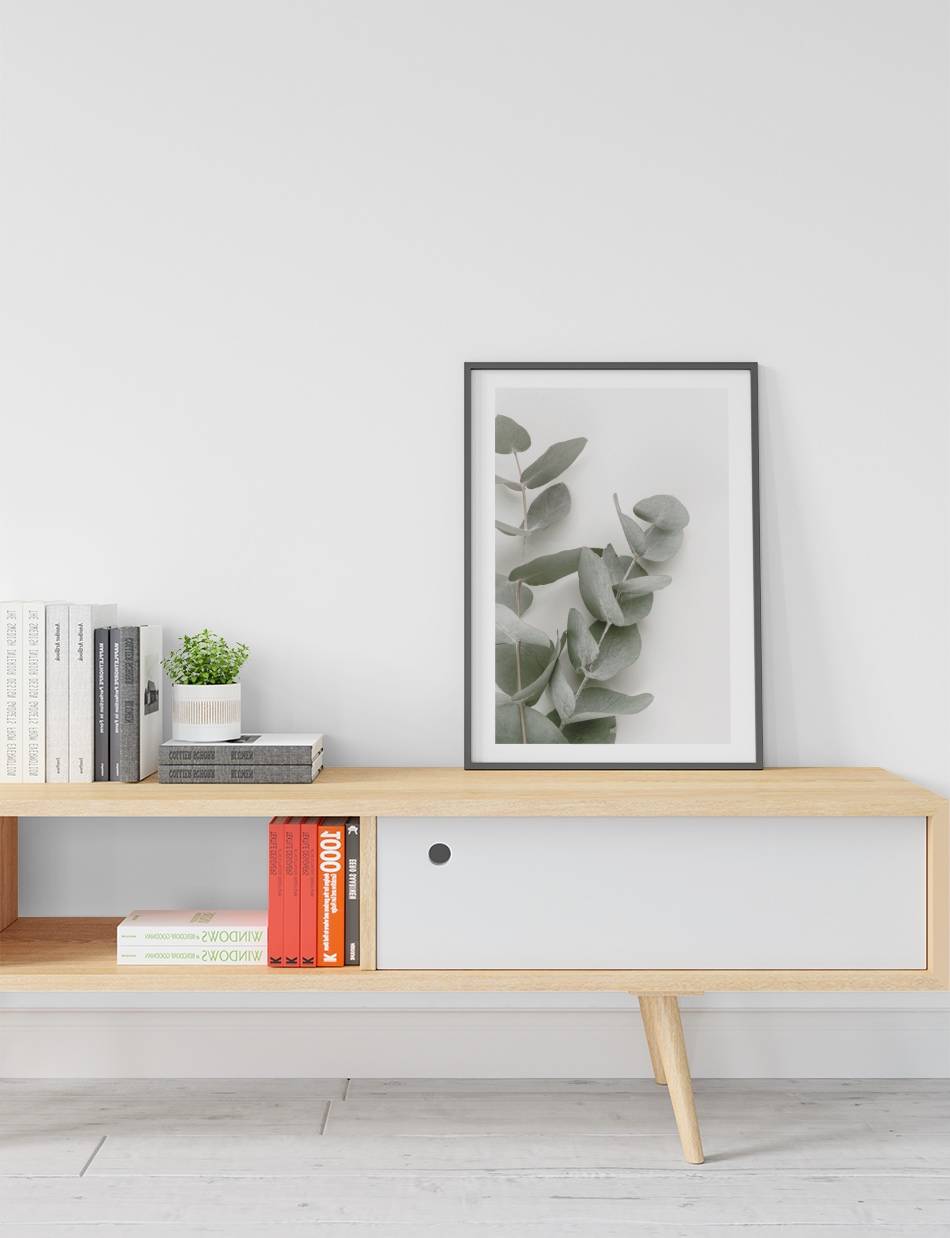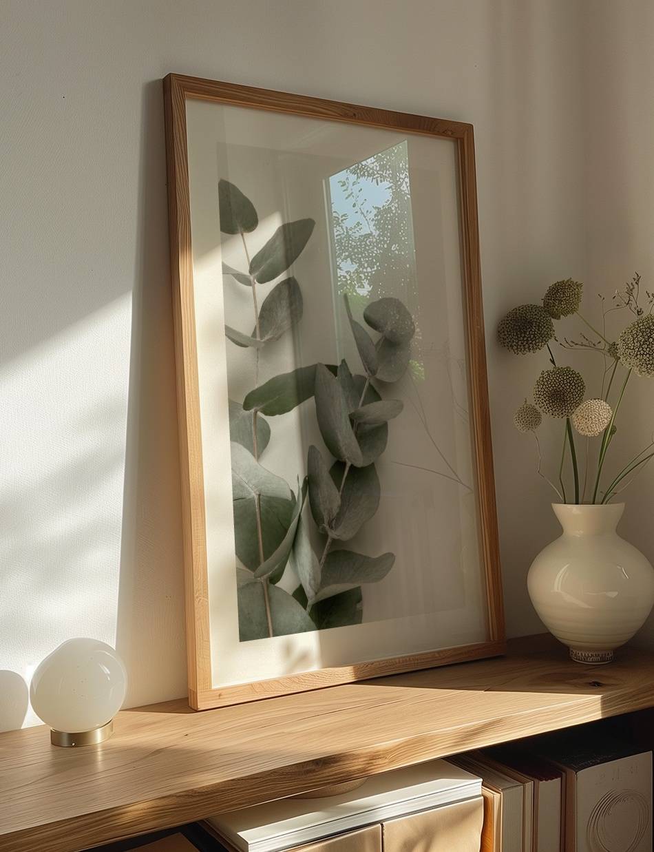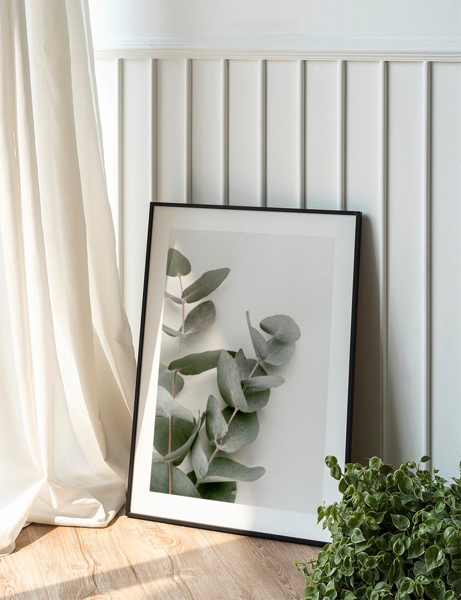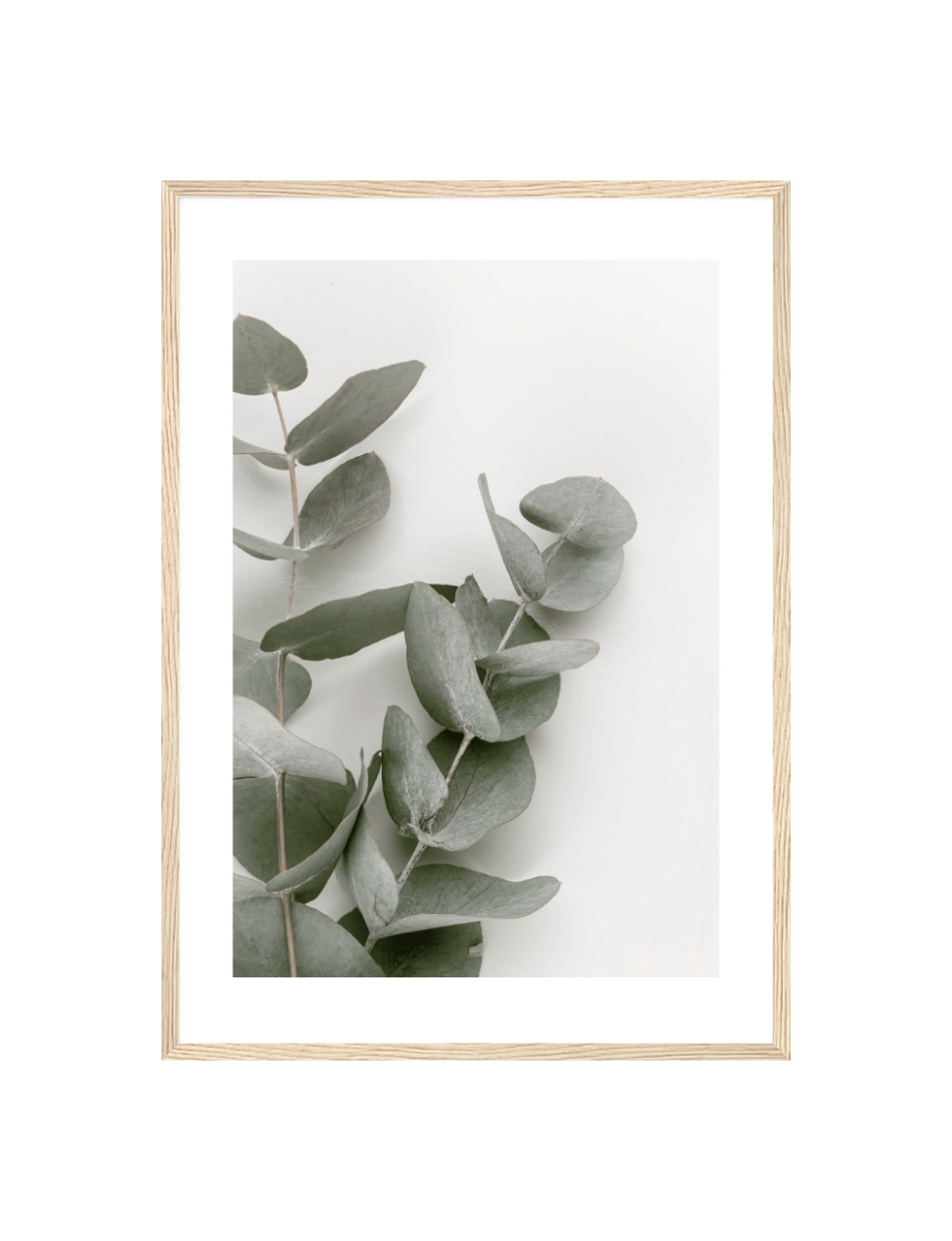 Indånd naturens rene essens med denne plakat, der fremviser friske eukalyptusblade i en minimalistisk komposition. Ideel for et touch af naturens ro og klarhed i dit hjem.