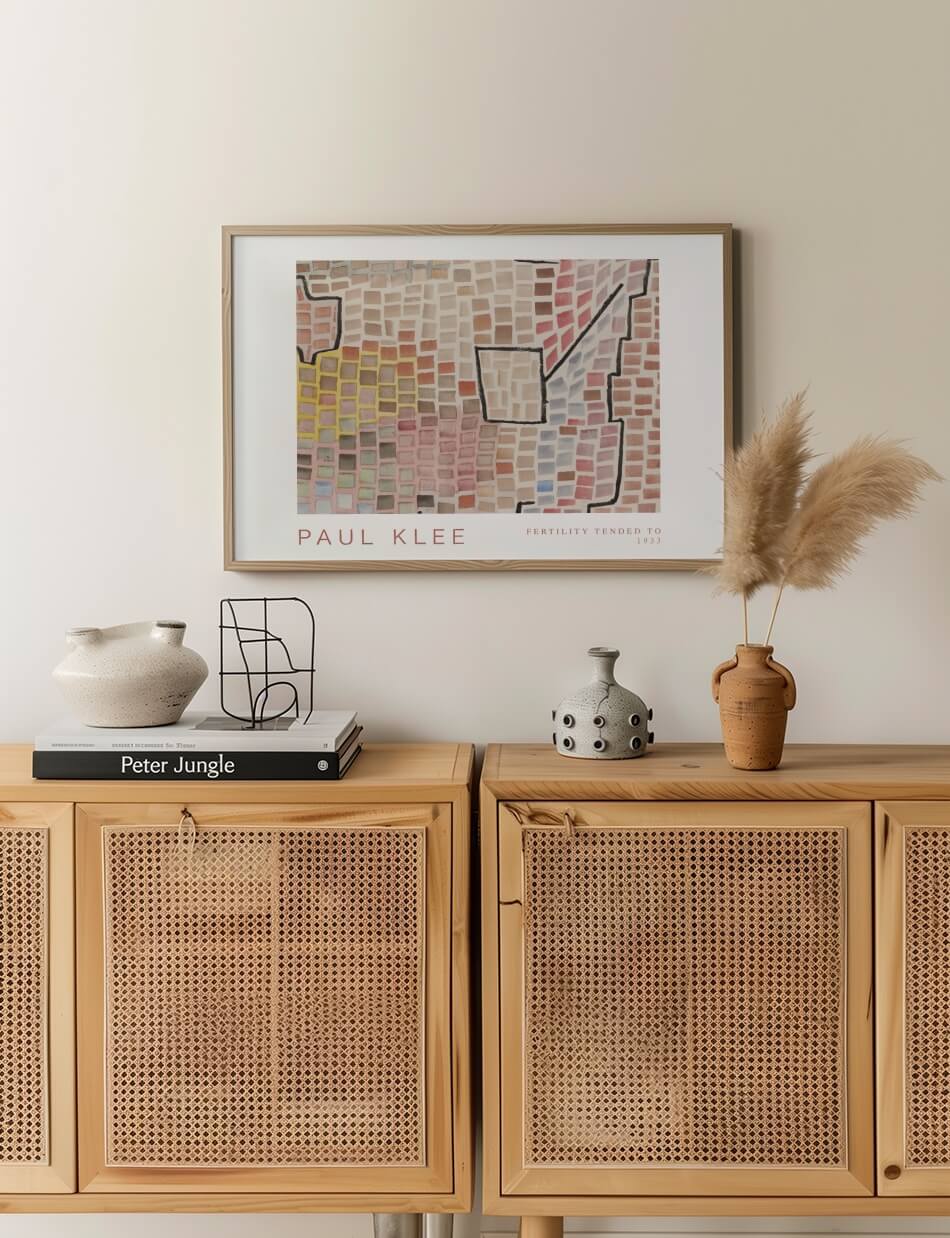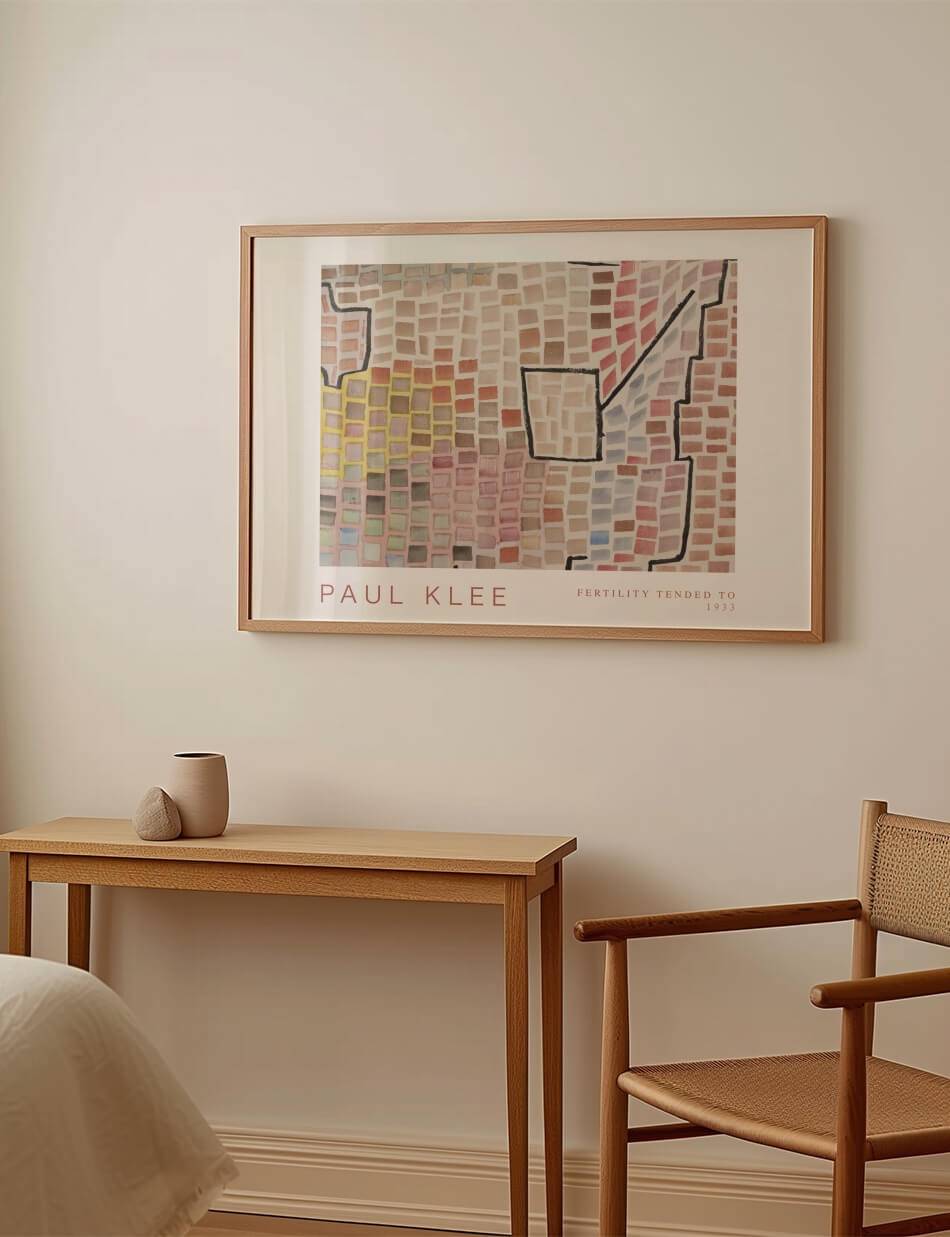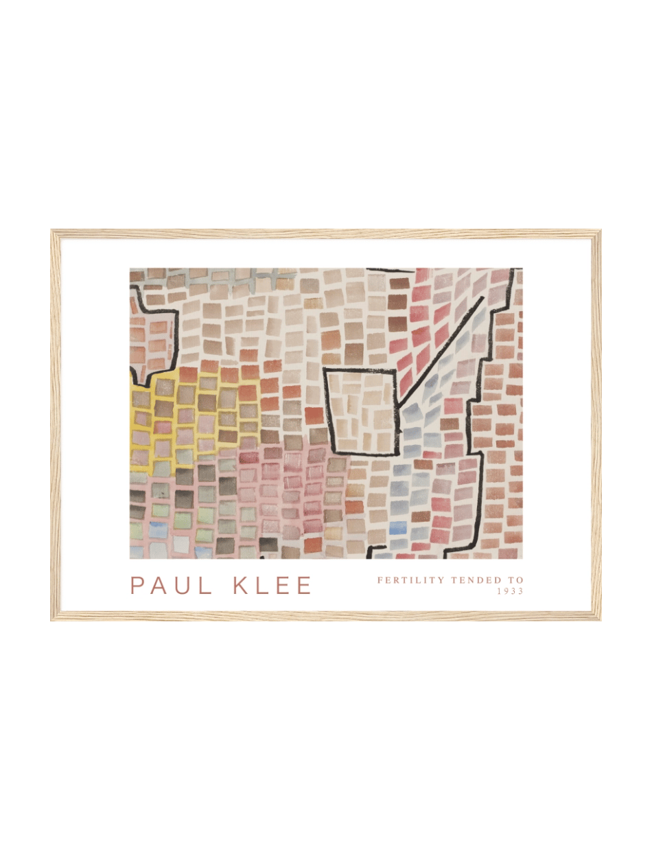 Paul Klees ‘Fertility Tended To’ er et unikt kunstværk fra 1933, der viser hans fascination af farve og struktur. Denne plakat fremviser en kompleks mosaik af små, firkantede farveblokke i forskellige nuancer, herunder pink, beige, blå, gul og brun. Klee’s brug af geometriske former og linjer skaber en følelse af liv og bevægelse, der nærmest gør billedet levende og dynamisk. Dette kunstværk er ideelt til at tilføre både energi og kunstnerisk dybde til dit hjem