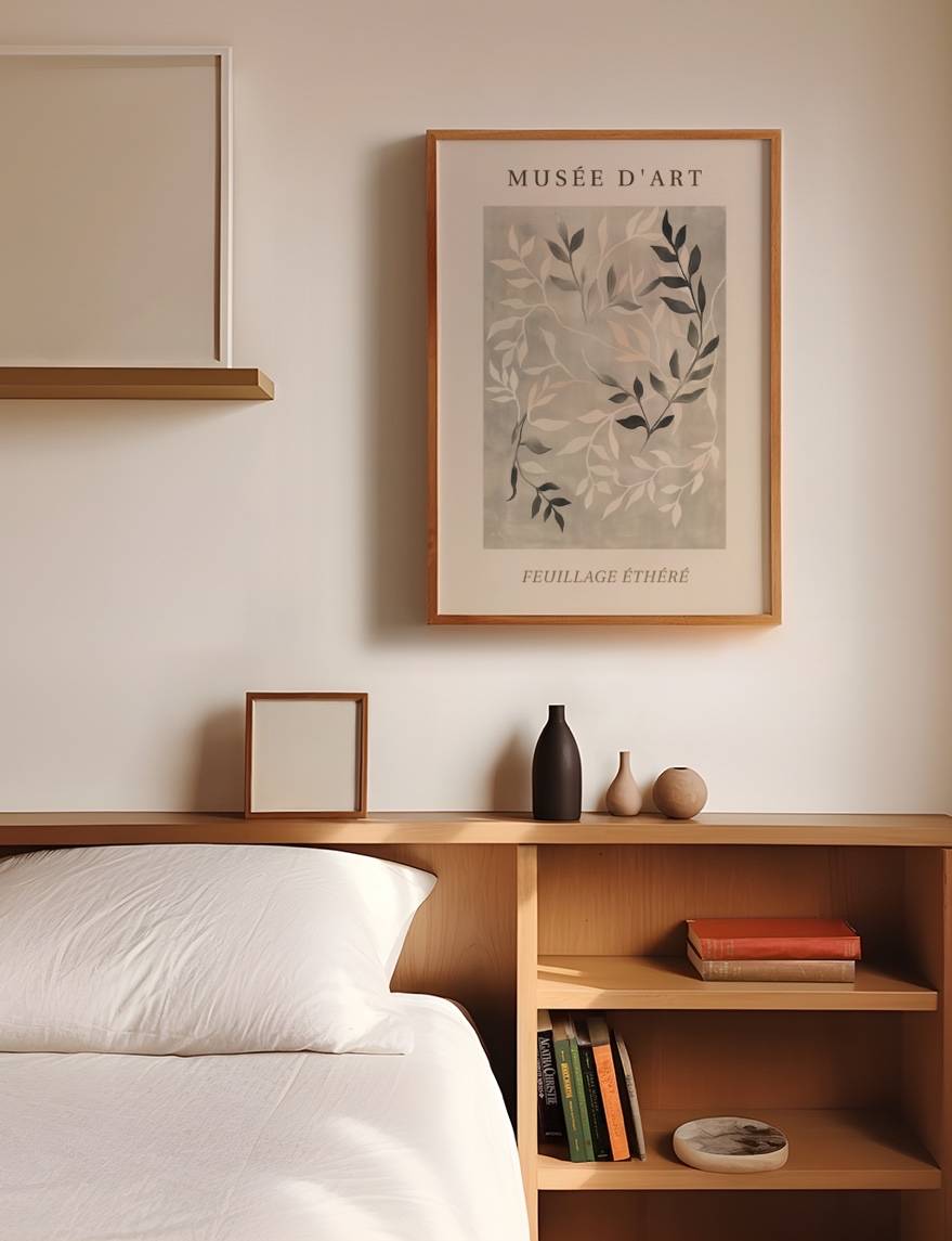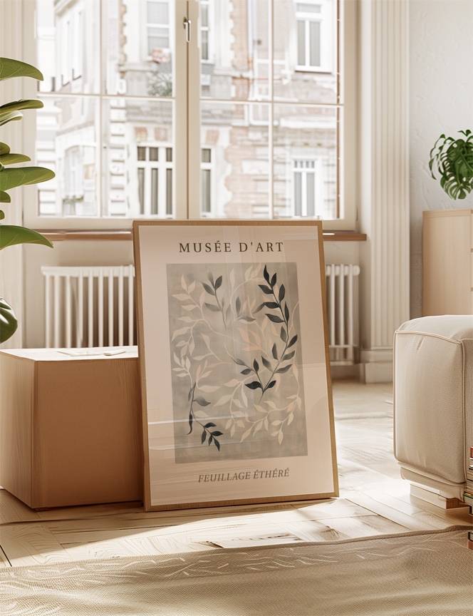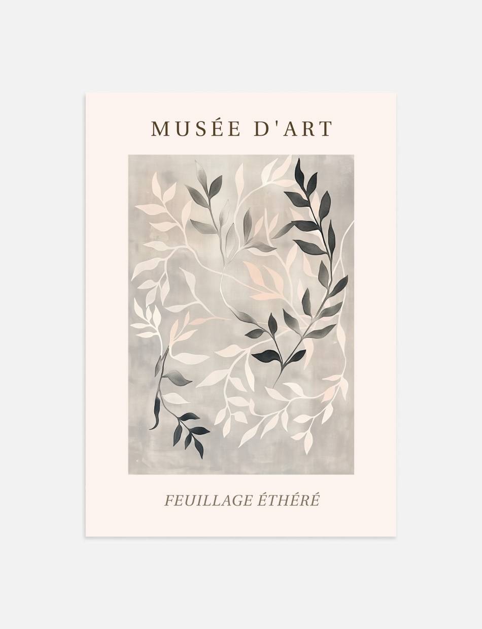 Feuillage Éthéré grafikplakaten skildrer en dans af delikate blade mod en blød grå baggrund, der udstråler en rolig elegance. Spillet mellem de lyse og mørke toner skaber en følelse af dybde og bevægelse, som om grenene blidt vugges af en usynlig brise. Denne grafiske plakat formidler en sanselig ro og tilbyder et pusterum fra den travle hverdag. Den er ideel til dem, der ønsker at indføre et element af naturens stille skønhed i deres hjem.