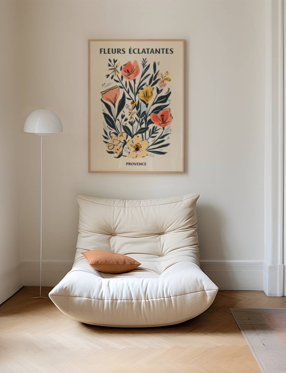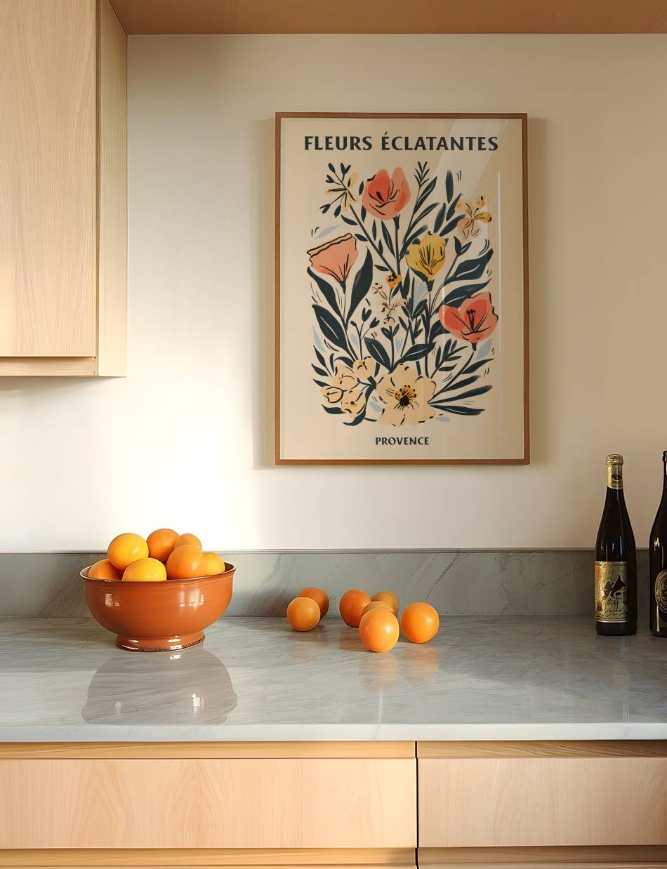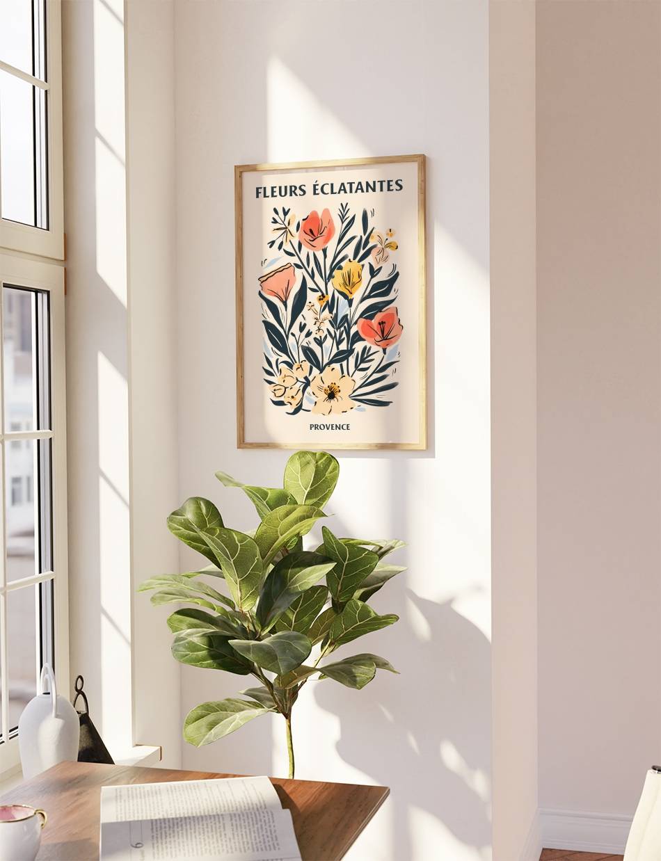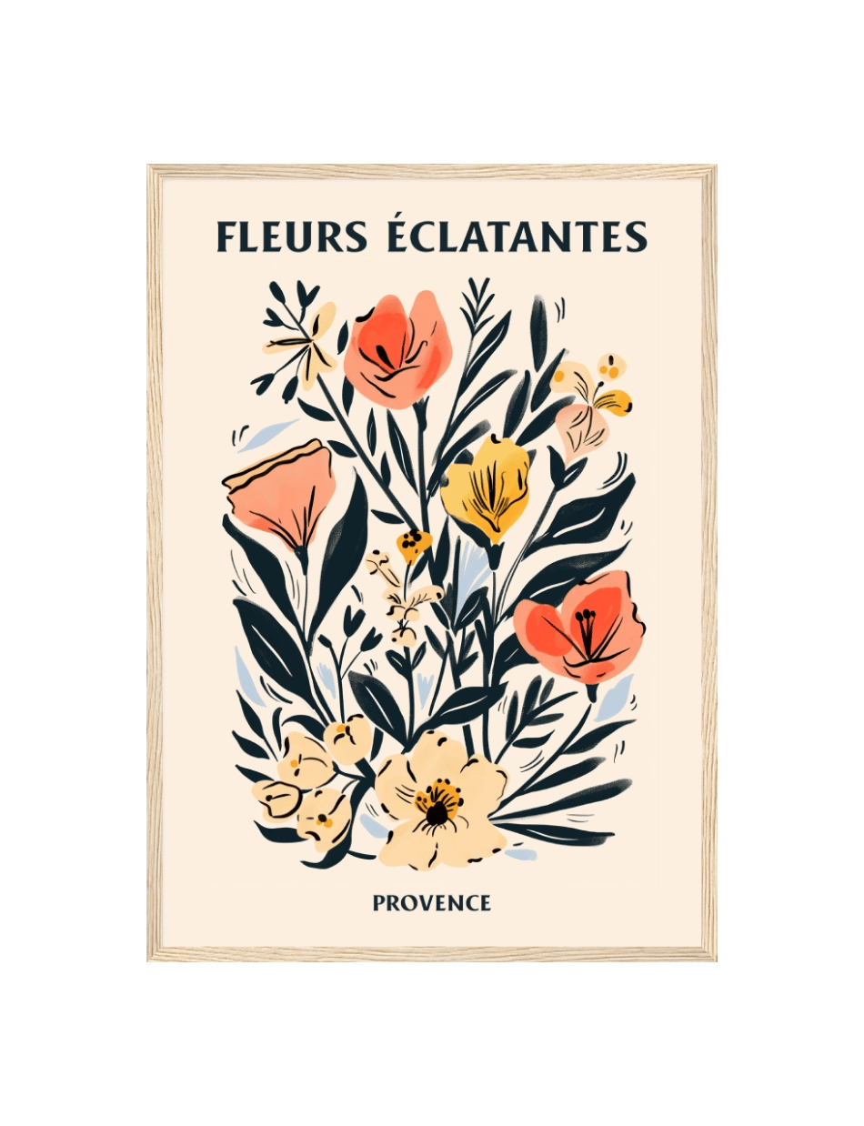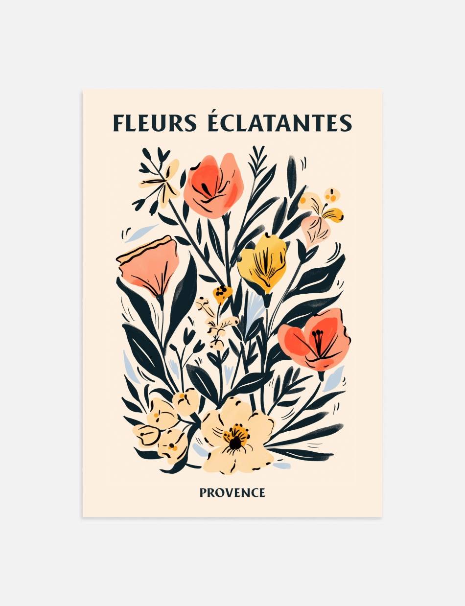 Fleurs Éclatantes kunstplakaten fejrer de strålende og farverige blomster, der er synonyme med det sydfranske landskab. Med sin stilfulde og moderne tilgang til botanisk kunst er denne illustration perfekt til at bringe et strejf af Provences charme og skønhed ind i ethvert hjem