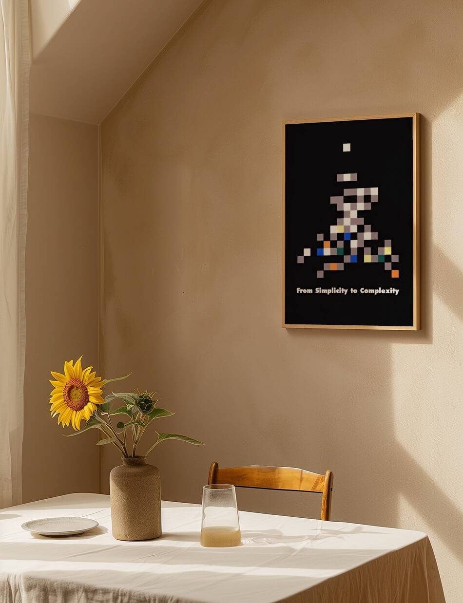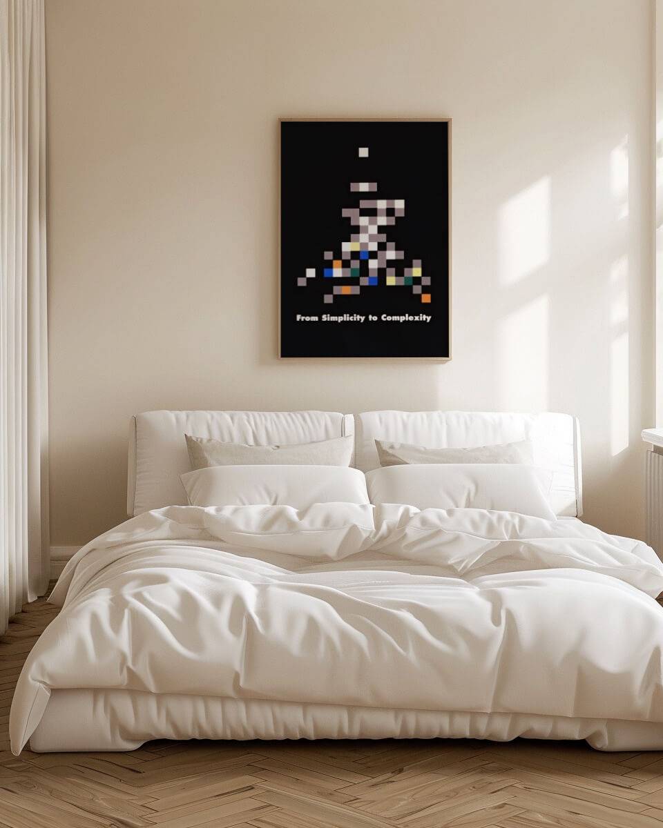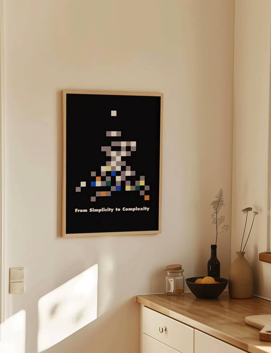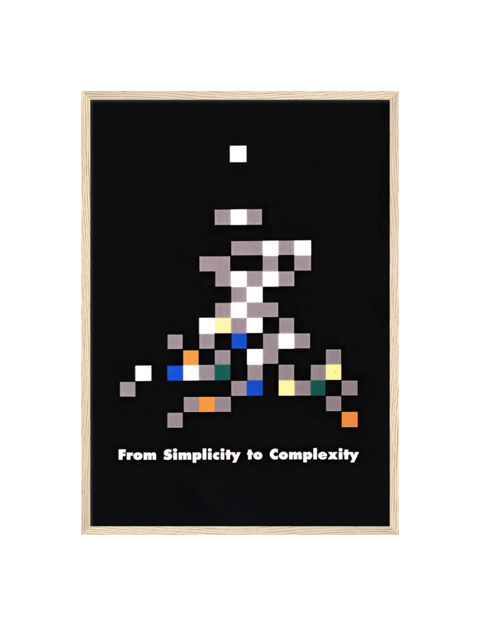 Dette kunstværk af National Institutes of Health illustrerer overgangen fra enkle til komplekse systemer gennem brug af farverige og strukturerede kvadrater. Fra en enkelt hvid firkant øverst udvikler mønstret sig gradvist til en kompleks samling af kvadrater i forskellige farver og nuancer. Dette symboliserer, hvordan simple elementer kan kombineres til at danne komplekse strukturer, hvilket afspejler mange naturlige og menneskeskabte processer.