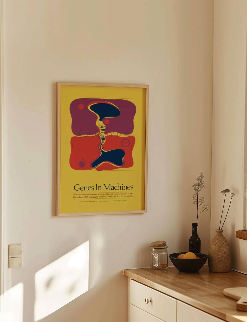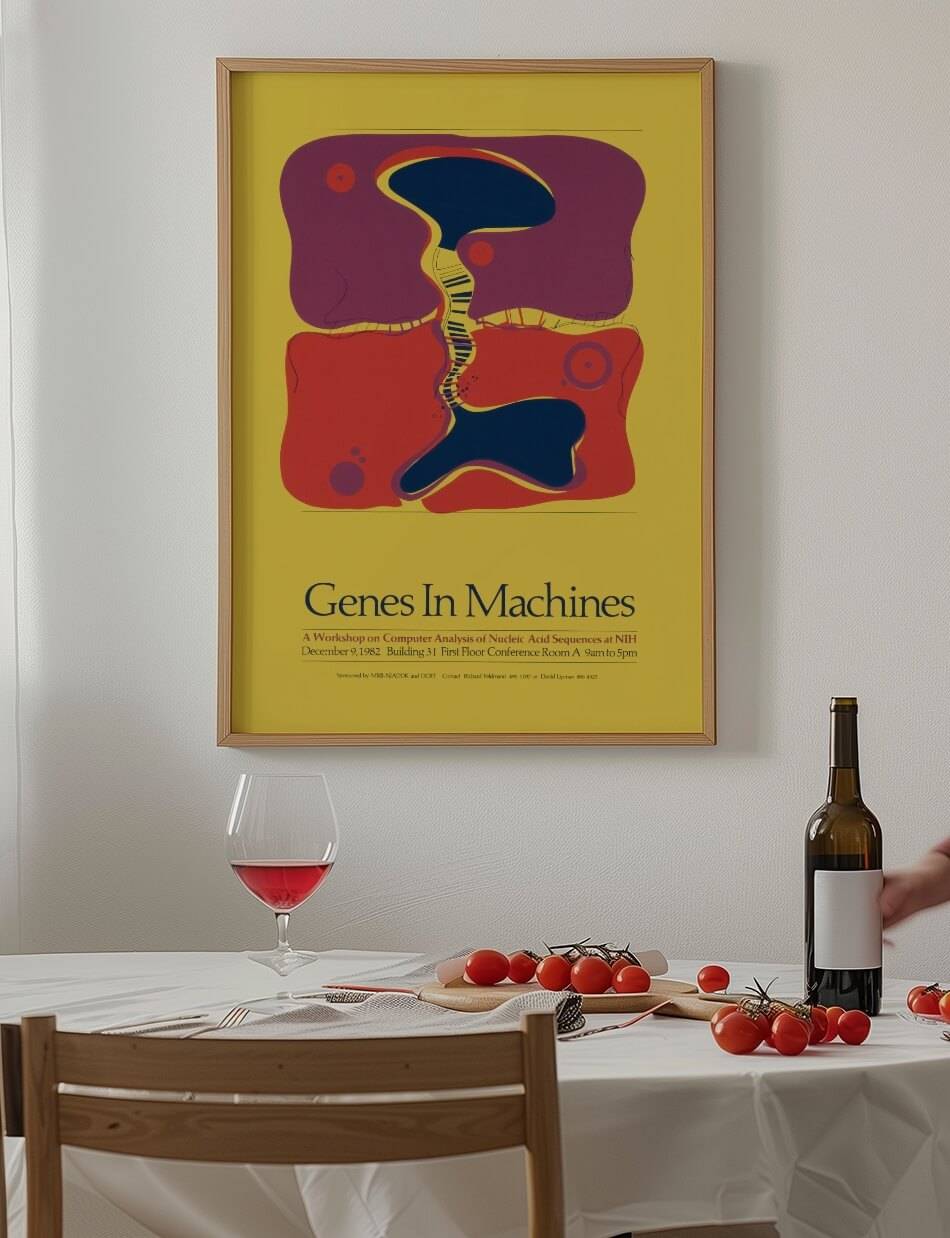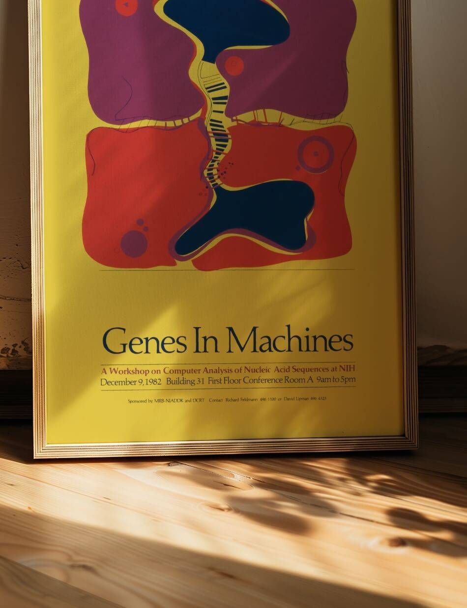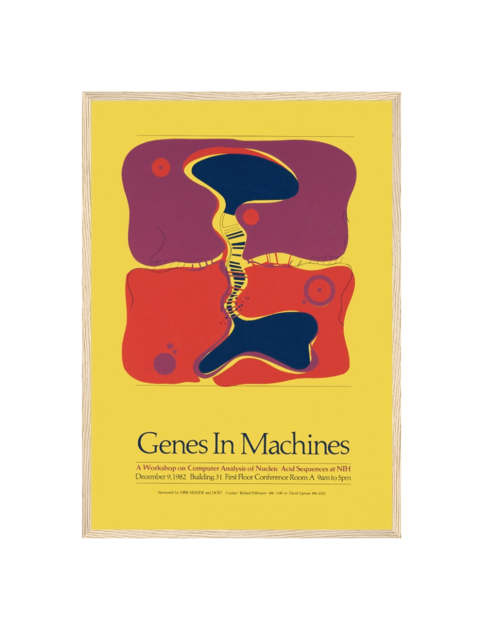 Denne plakat, skabt af National Institutes of Health, illustrerer en abstrakt repræsentation af genetiske sekvenser og deres integration med teknologiske systemer. De farverige former og mønstre symboliserer DNA-strenge, der flyder og interagerer med sine omgivelser, hvilket fremhæver samspillet mellem biologi og teknologi. Plakaten er en reklame for workshoppen “Genes in Machines,” som fandt sted den 9. december 1982 på NIH.