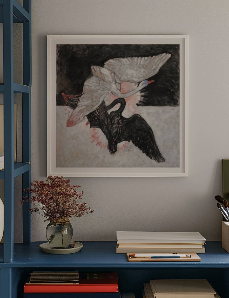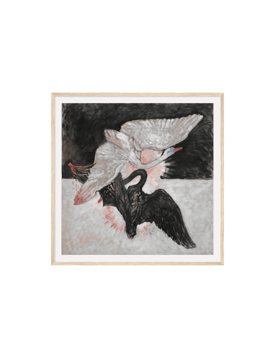 Hilma af Klints mesterværk indfanger den dramatiske dans mellem to svaner – en lys og en mørk. Deres sammenfiltrede kroppe og vinger udfolder sig mod en opdelt baggrund, hvor sort møder hvidt og skaber en visuel repræsentation af livets dualitet. Svanerne, symboler på ynde og styrke, kæmper og forenes i et kraftfuldt billede på vores indre kampe og evige søgen efter balance. Klints abstrakte stil og symbolske farvevalg inviterer til fordybelse og refleksion over livets kompleksitet.