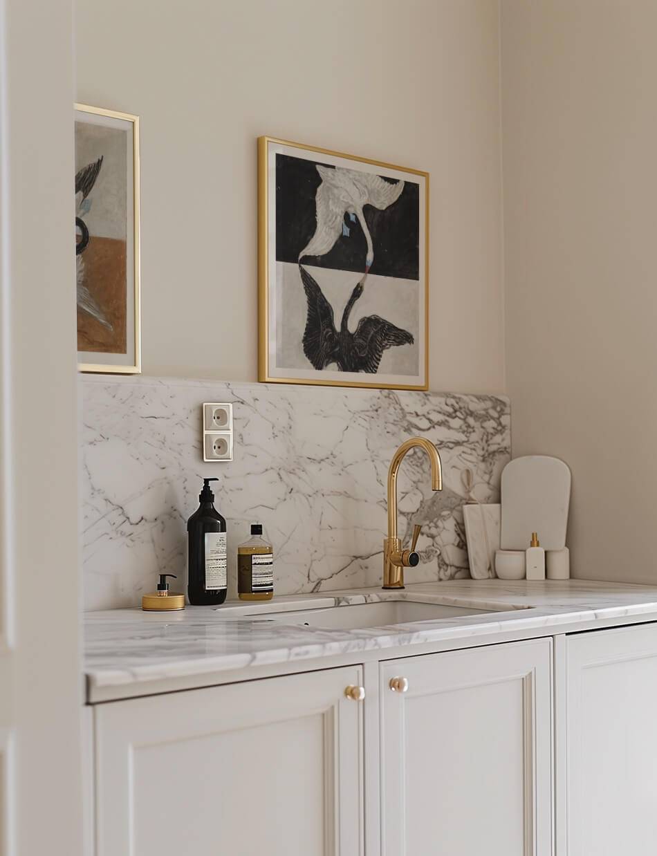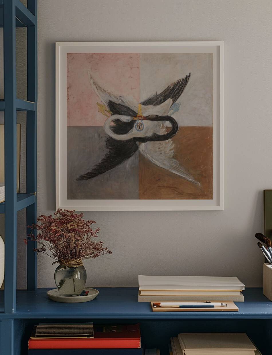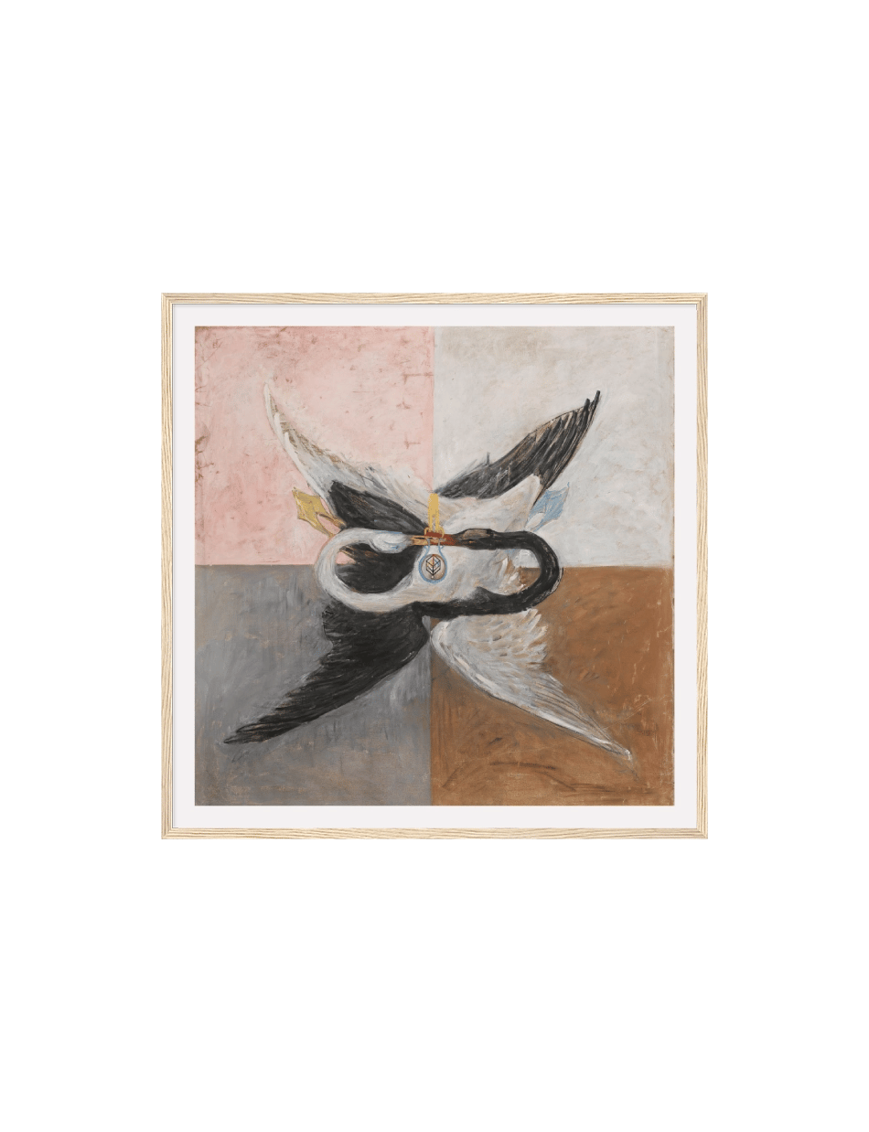 Dette kunstværk af Hilma af Klint, ‘Group IX/SUW, The Swan, No. 24’ afbilder temaerne dualitet og enhed. På lærredet ses to svaner, en sort og en hvid, hvis halse er elegant indviklet i hinanden, hvilket symboliserer balancen mellem modsætninger. Baggrunden er opdelt i fire kvadrater, hver med en forskellig farvetone, der fremhæver kontrasten og harmonien mellem svanerne. Et symbol i midten af billedet repræsenterer en dybere spirituel forbindelse, der inviterer til at reflektere over forholdet mellem lys og mørke, kærlighed og had, og hvordan de to kan forenes i en harmonisk helhed.