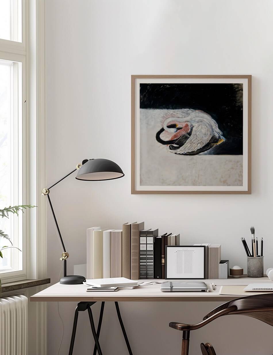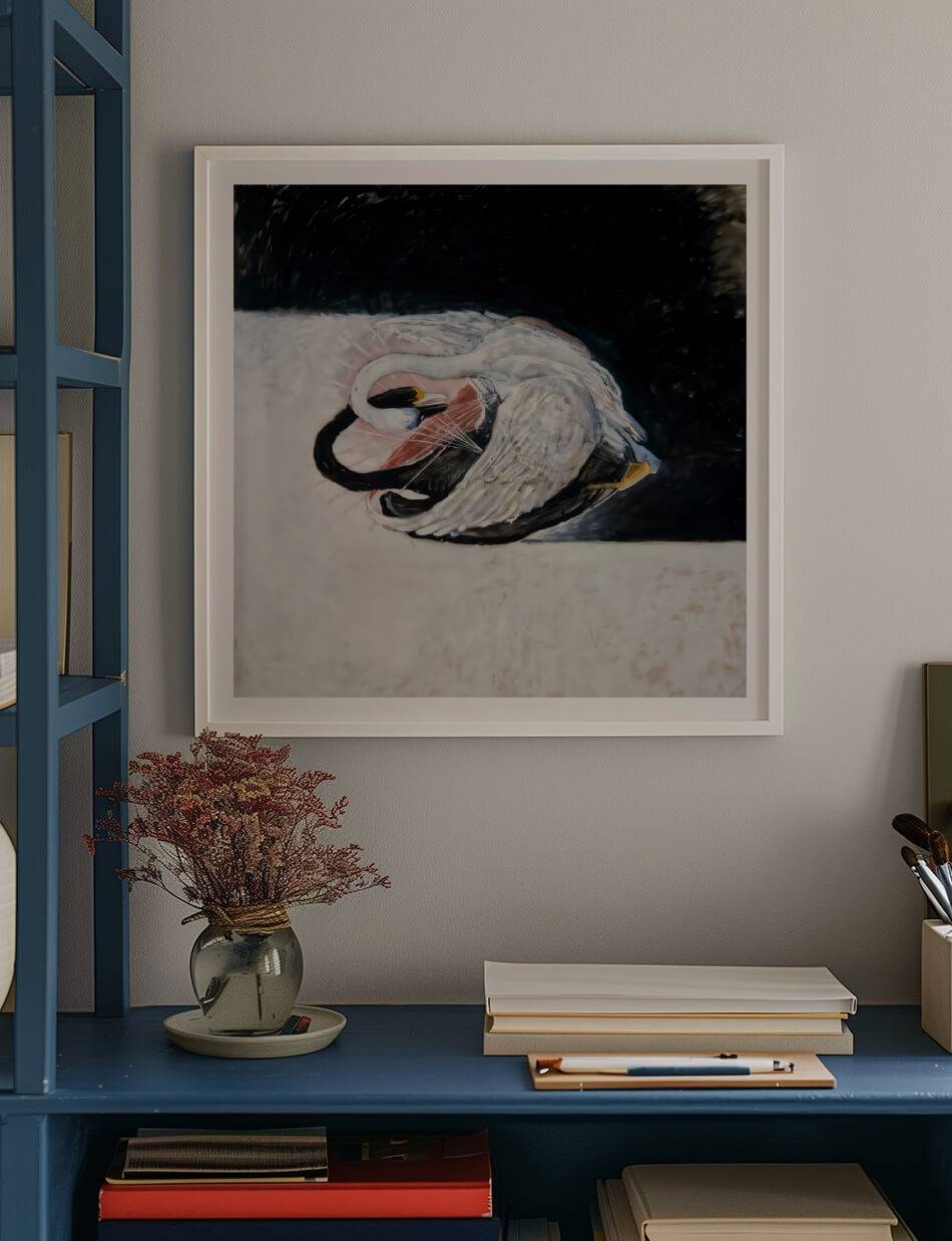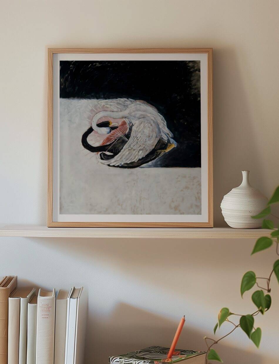 Hilma af Klints ‘Svanen nr. 3’ er et gribende kunstværk, der fanger ét øjeblik, hvor to svaner – en hvid og en sort – mødes i en intim omfavnelse. Deres kontrasterende fjerdragt smelter sammen på en delt baggrund, der skifter mellem lys og mørke. Dette billede symboliserer livets dualitet, hvor modsætninger som kærlighed og sorg, lys og mørke, sameksisterer i en delikat balance. Klints abstrakte stil og symbolske farvevalg inviterer til at reflektere over livets kompleksitet og skønhed.