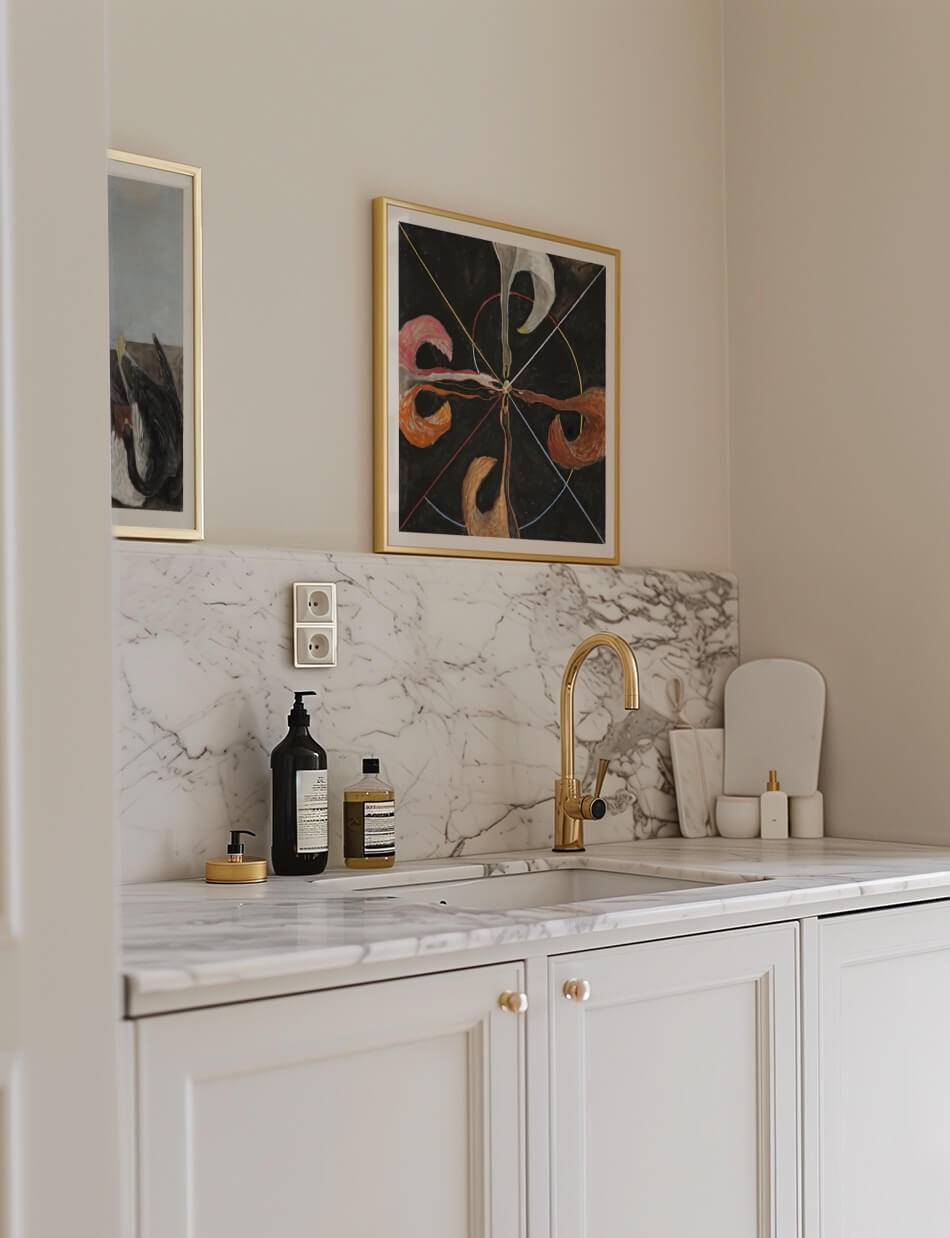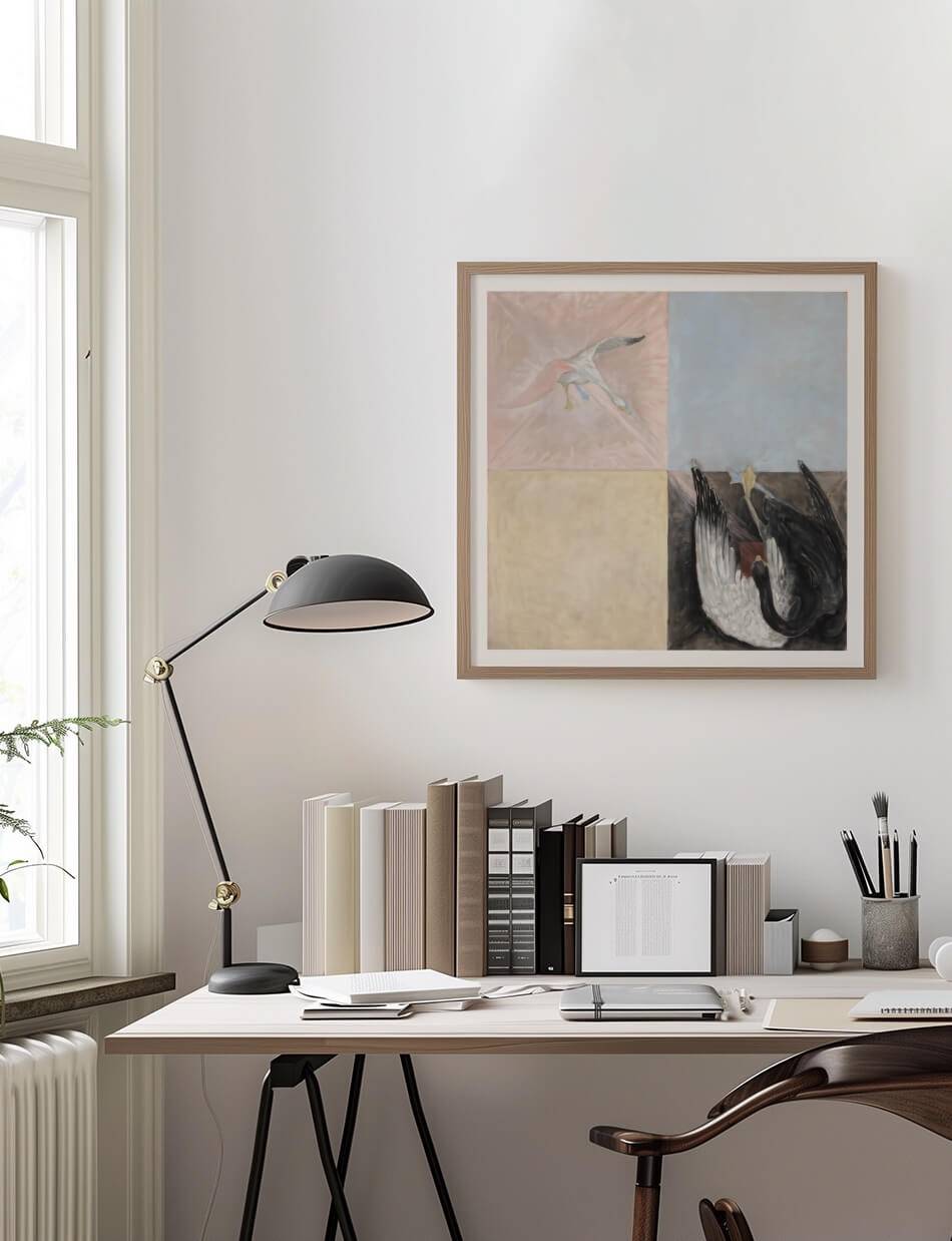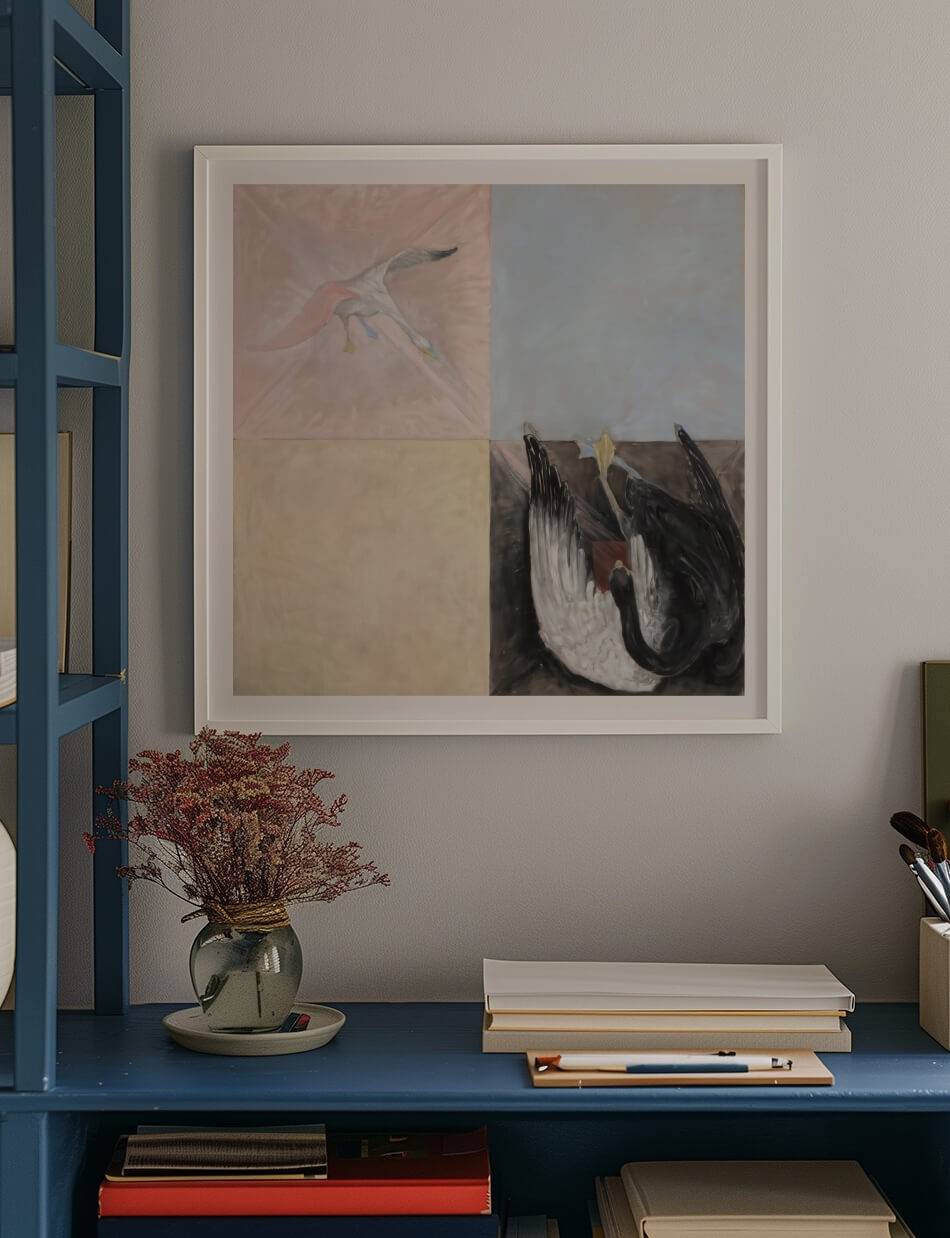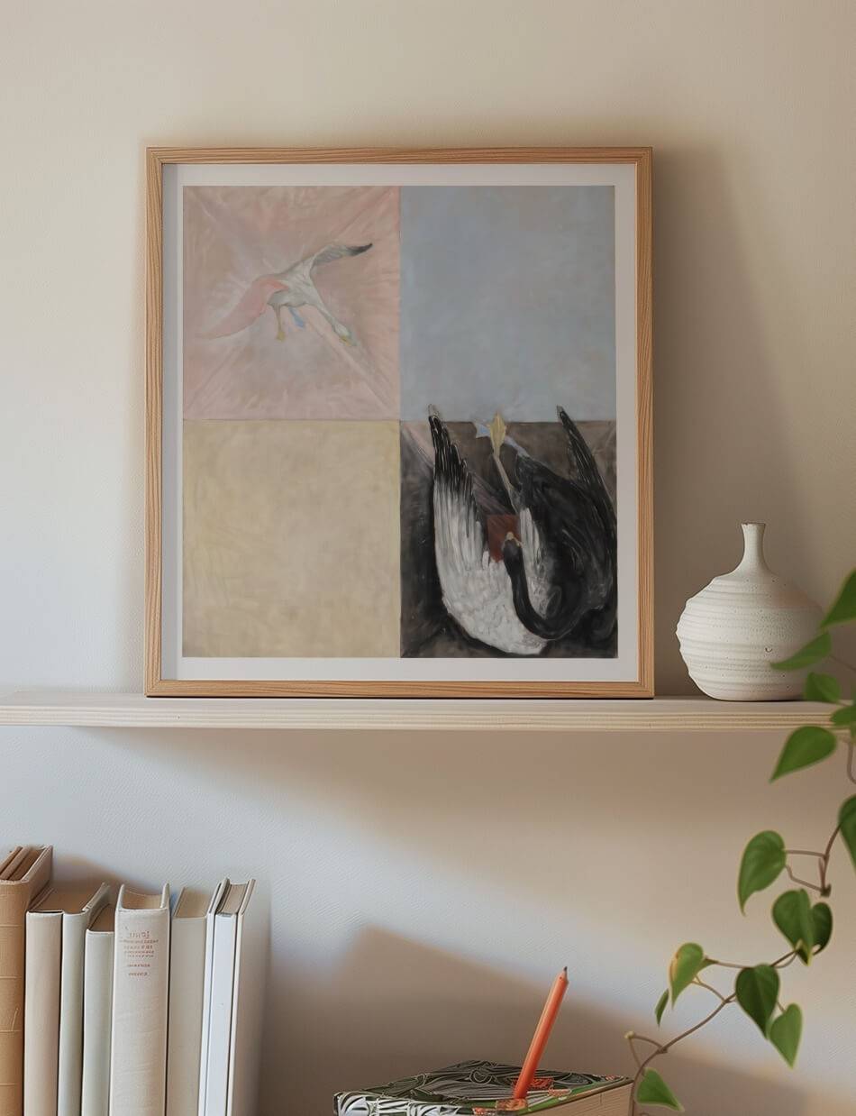 Dette fascinerende værk af den svenske kunstner Hilma af Klint udforsker dualiteten og transformationen gennem svanens symbolik. Maleriet er opdelt i fire dele, der kontrasterer en flyvende hvid fugl med en majestætisk sort-hvid svane. De rene farvefelter i blåt og gult skaber en balance mellem det æteriske og det jordiske. Et fængslende stykke abstrakt kunst, der indbyder til fordybelse og refleksion over naturens og åndens mysterier.