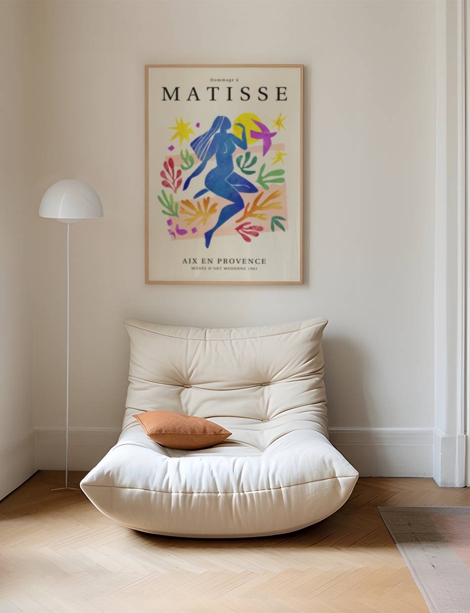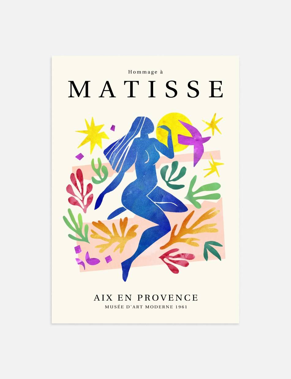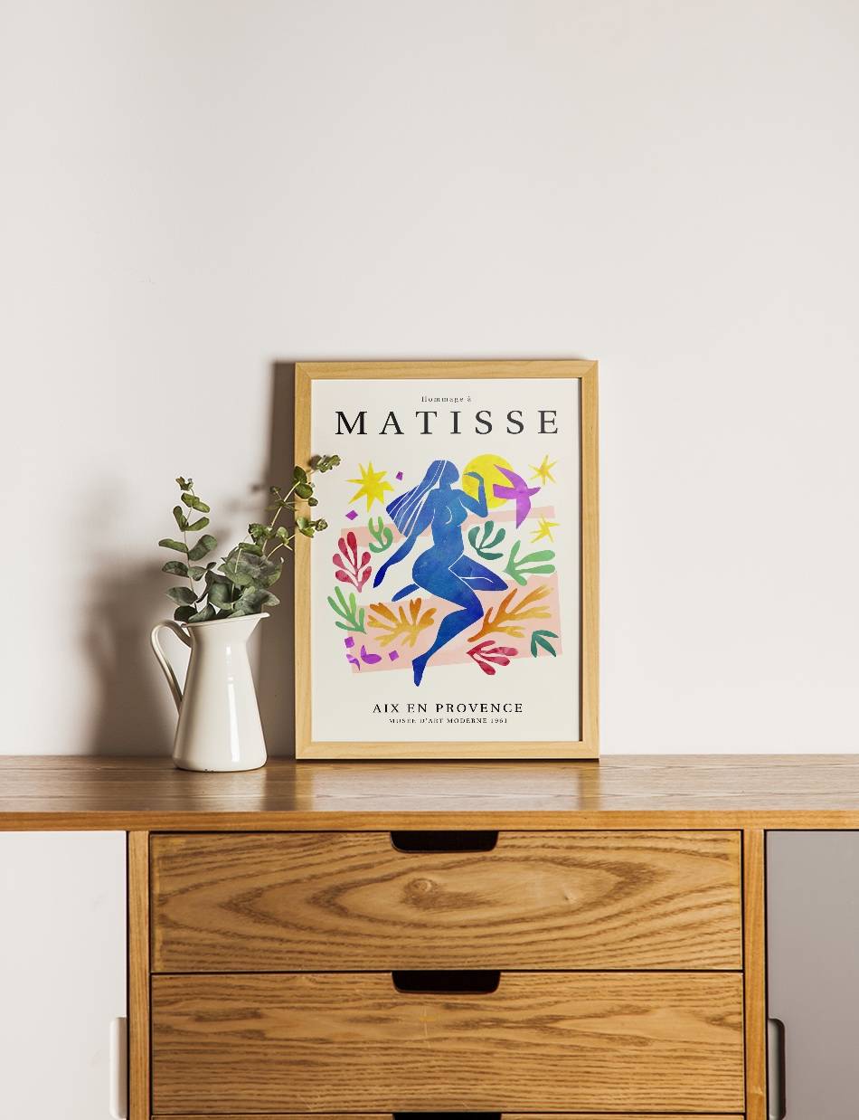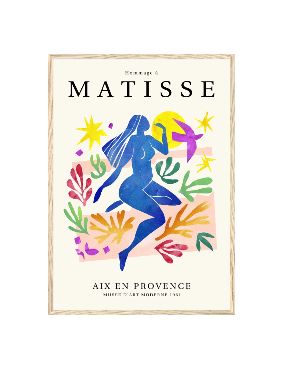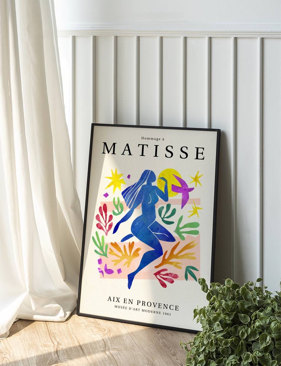 ‘Hommage à Matisse’ er en eksklusiv samling af plakater, skabt til at ære og fejre arven fra Henri Matisse, en af de mest banebrydende kunstnere i det 20. århundrede. Denne samling, som er udarbejdet af Prints Charmings eget design team, formidler Matisse’s enestående brug af farve og form, der revolutionerede den moderne kunst. Hver plakat i samlingen er inspireret af Matisse’s mest ikoniske værker.