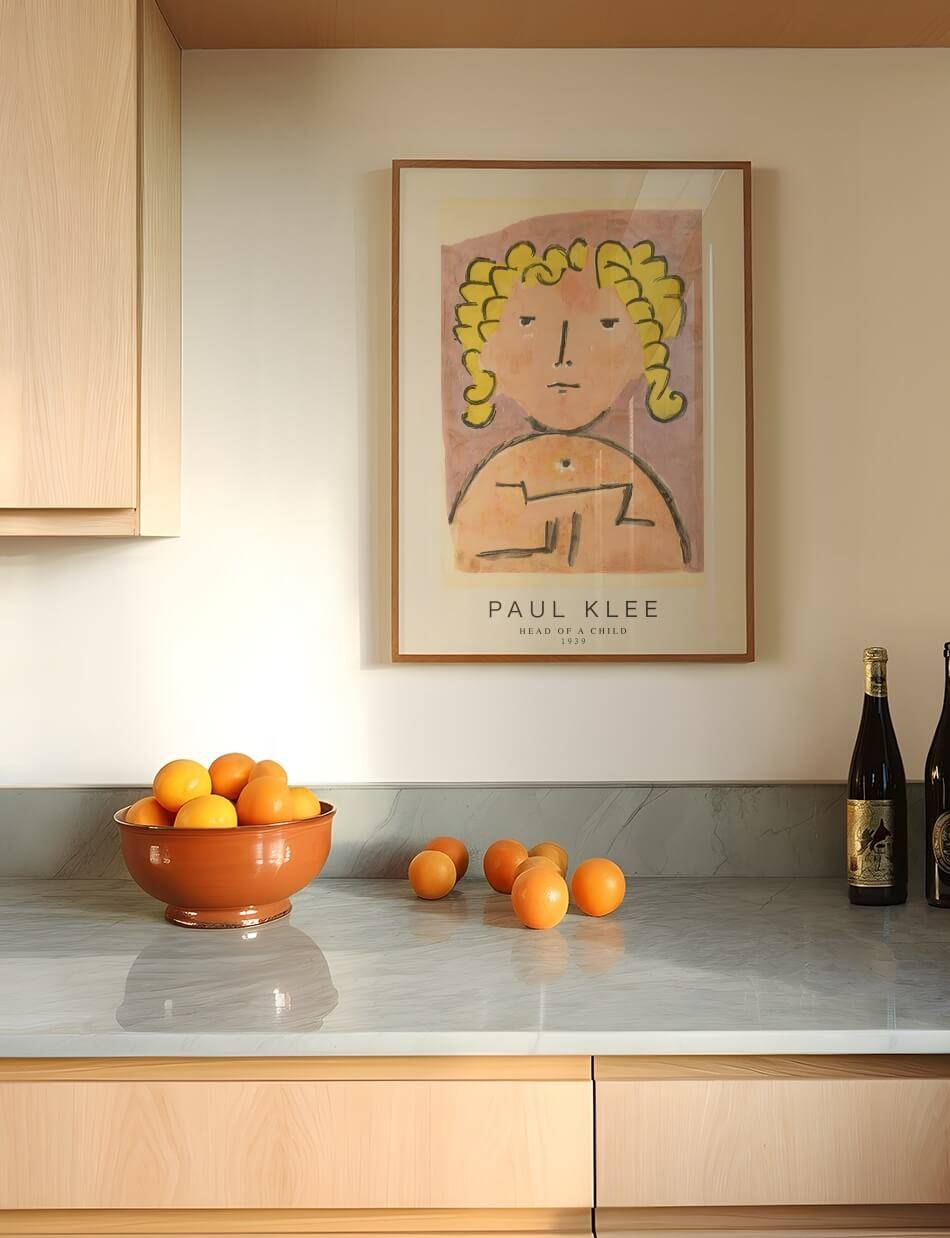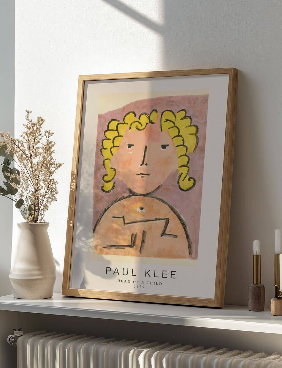 Head of a Child af Paul Klee fra 1939, et værk der portrætterer et barns ansigt med en enkel, næsten naiv stil. Klees brug af bløde, varme farver og den grove, men udtryksfulde streg fremhæver barnets uskyld og renhed. De store, åbne øjne og de karakteristiske gule krøller skaber en følelse af både sårbarhed og stille styrke. Maleriet indfanger en essens af barndommens uspolerede sind og dets simple, men dybe følelser.