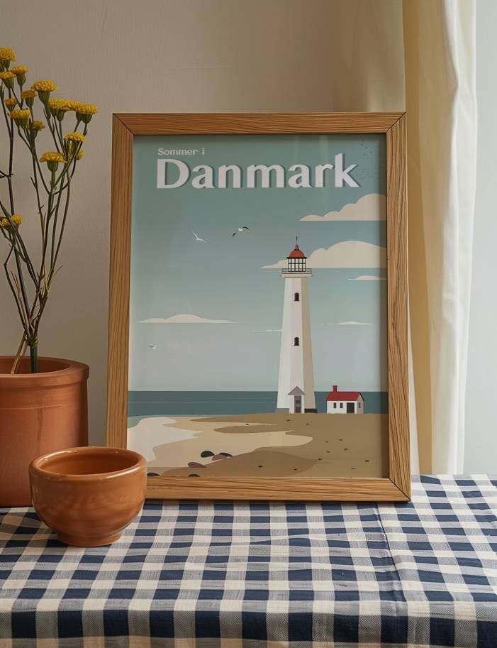 Mærk den danske sommer med vores plakatkollektion Sommer i Danmark. Vores smukt illustrerede plakater fanger essensen af danske sommerdage, fra majestætiske fyrtårne ved kysten til idylliske huse og maleriske fiskerlandsbyer.