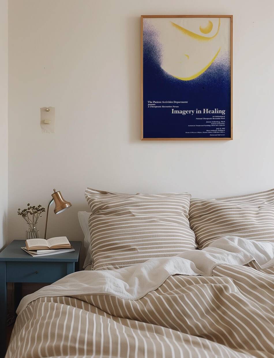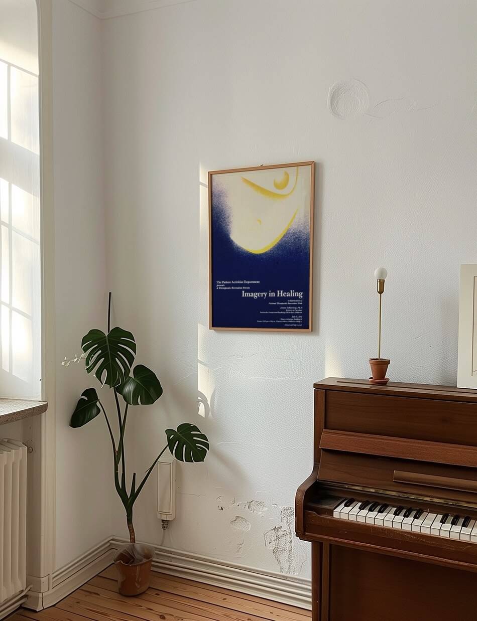 Denne plakat, skabt af National Institutes of Health, illustrerer en abstrakt og beroligende scene, hvor lyse og mørke farver smelter sammen for at danne en meditativ stemning. Motivet symboliserer ro, helbredelse og sindets kraft, hvilket afspejler temaet for eventet. Plakaten annoncerer et terapeutisk forum, “Imagery in Healing,” præsenteret af The Patient Activities Department som en del af National Therapeutic Recreation Week.