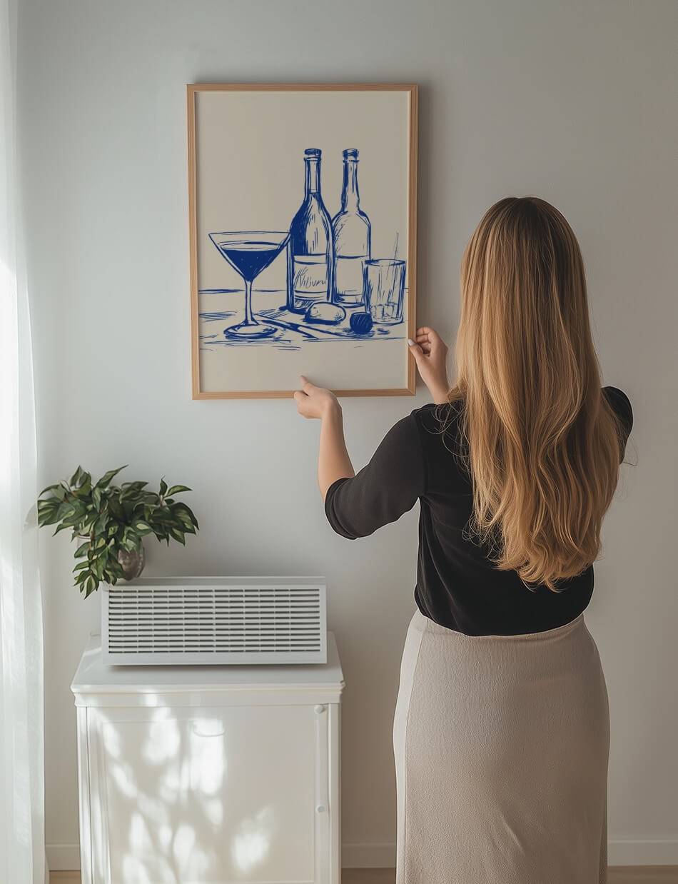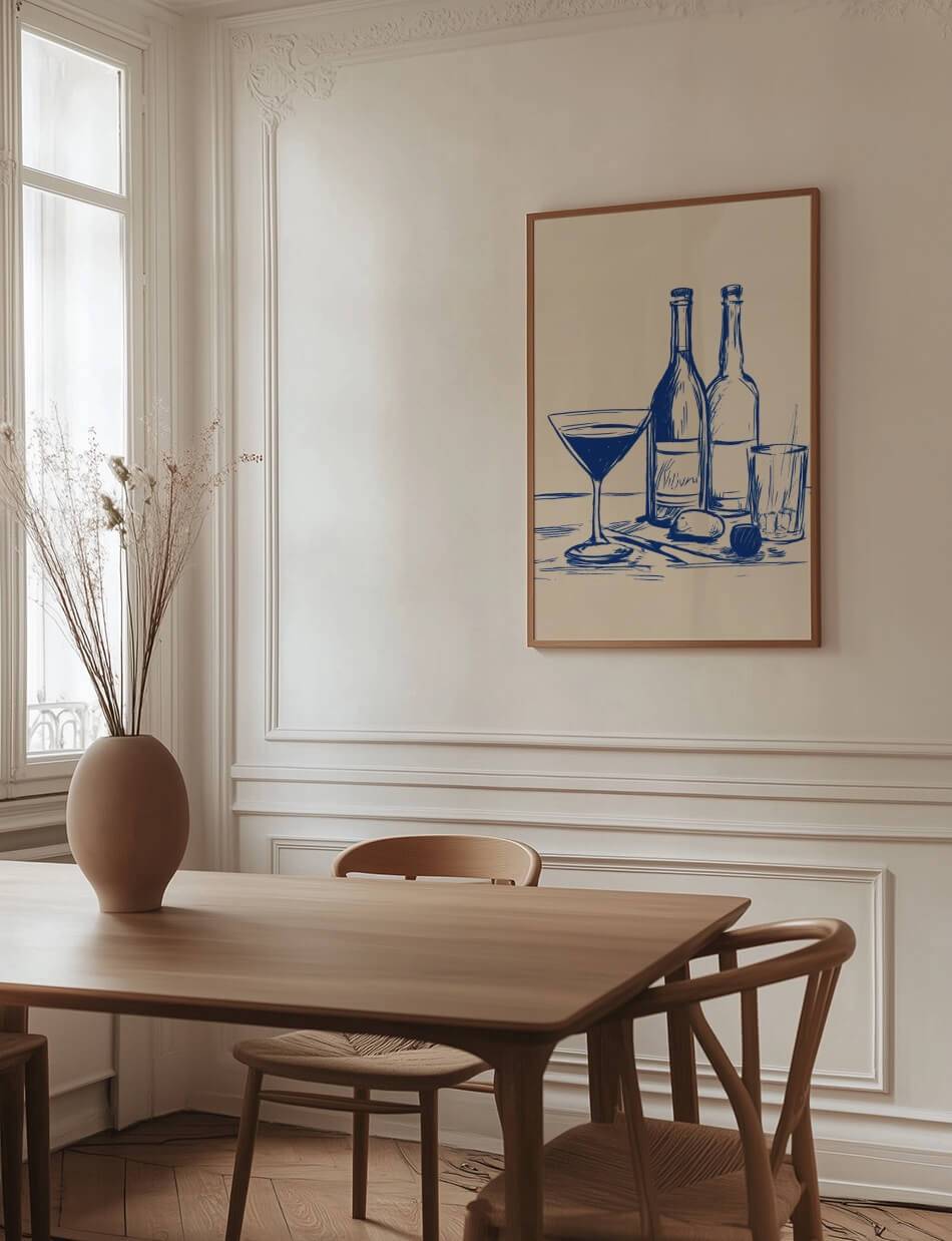In Good Company Blue er en stilfuld og enkel illustration, der fanger essensen af hyggelige øjeblikke delt med venner eller familie. Med en monokrom blå farvepalet og skitserede linjer fremstiller værket en opstilling af flasker, et cocktailglas og en citron, der bringer tankerne hen på afslappede stunder og uformelle sammenkomster. Det minimalistiske udtryk efterlader plads til fortolkning, samtidig med at det fremhæver en tidløs æstetik.