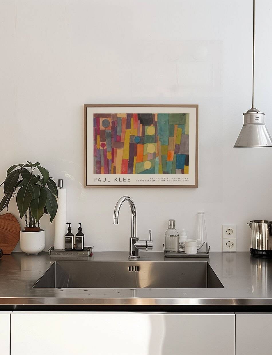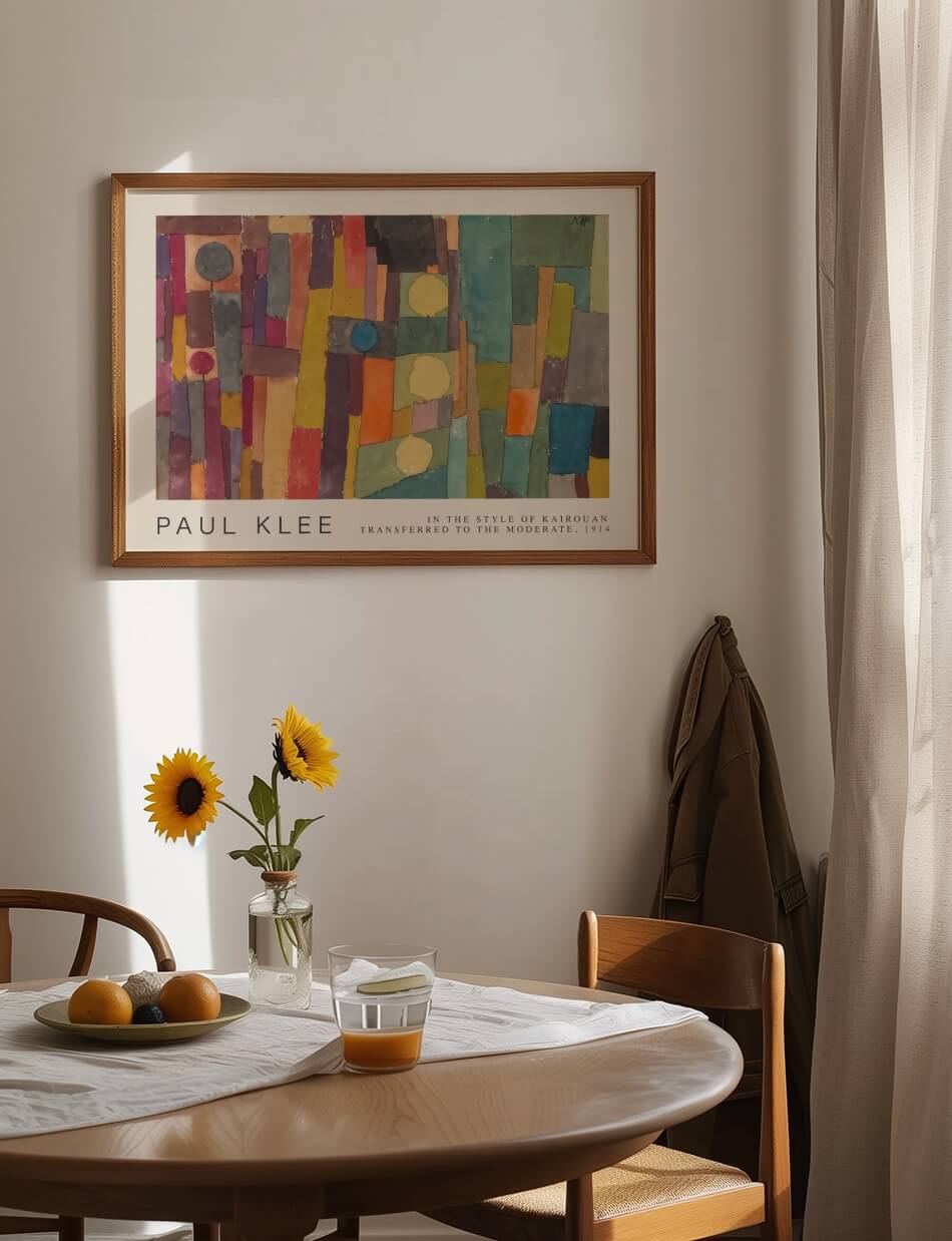 Paul Klee’s, ‘In the Kairouan Style, Transposed in a Moderate Way’ præsenterer en fascinerende komposition af geometriske former og levende farver. Inspireret af Kairouans arkitektoniske mønstre og farverige kultur, skaber Klee en dynamisk mosaik, hvor rektangler, cirkler og linjer samles i en balanceret symfoni. Farverne bevæger sig mellem varme og kolde nuancer, hvilket skaber en visuel rytme, der inviterer til at opleve en snigende og meditativ ro midt i kompleksiteten.
